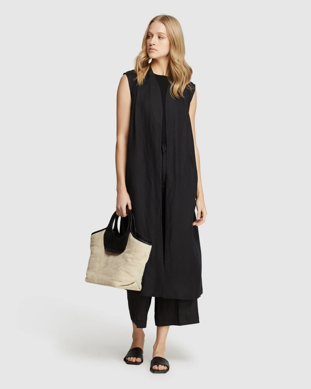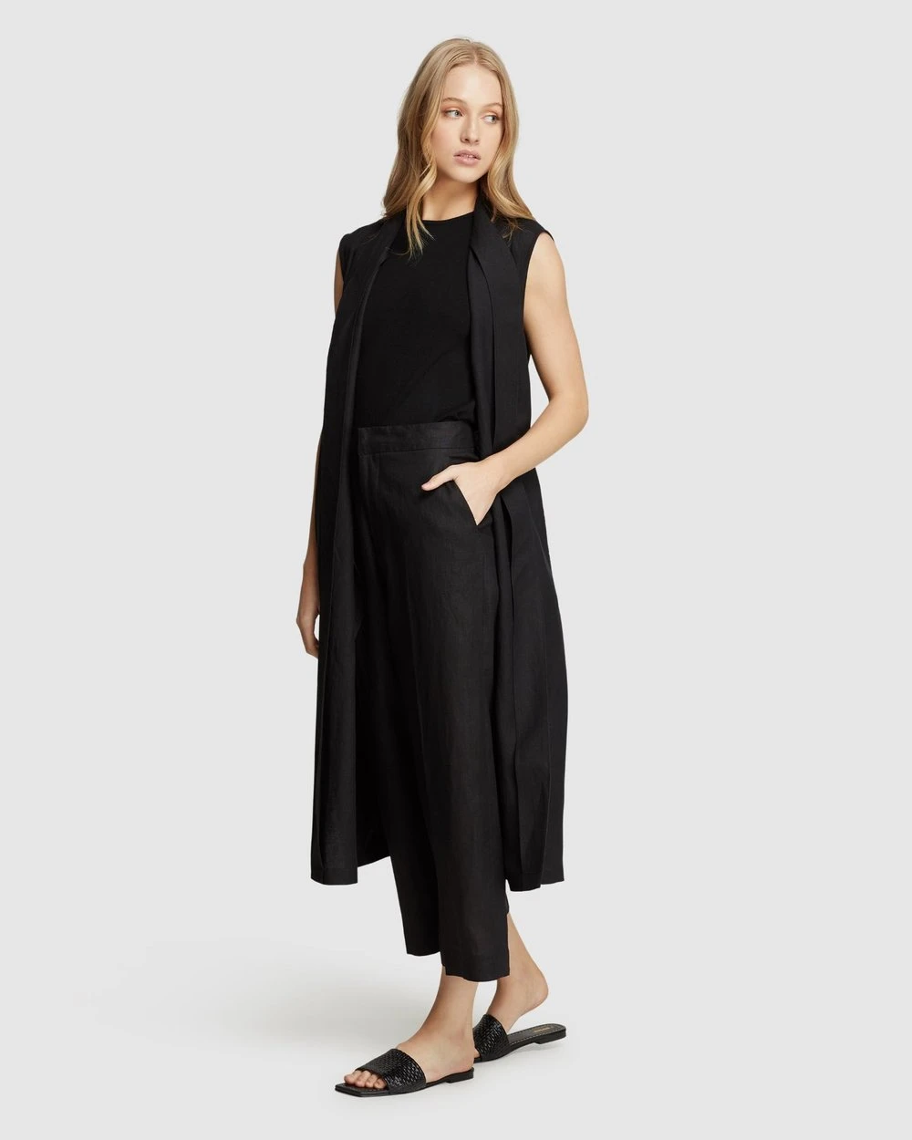 Bring a touch of grace to your style with the Willow Linen Gilet by Oxford. This elegant piece is crafted from a gorgeous linen blend and features a waist tie, side pockets, and capped sleeves.