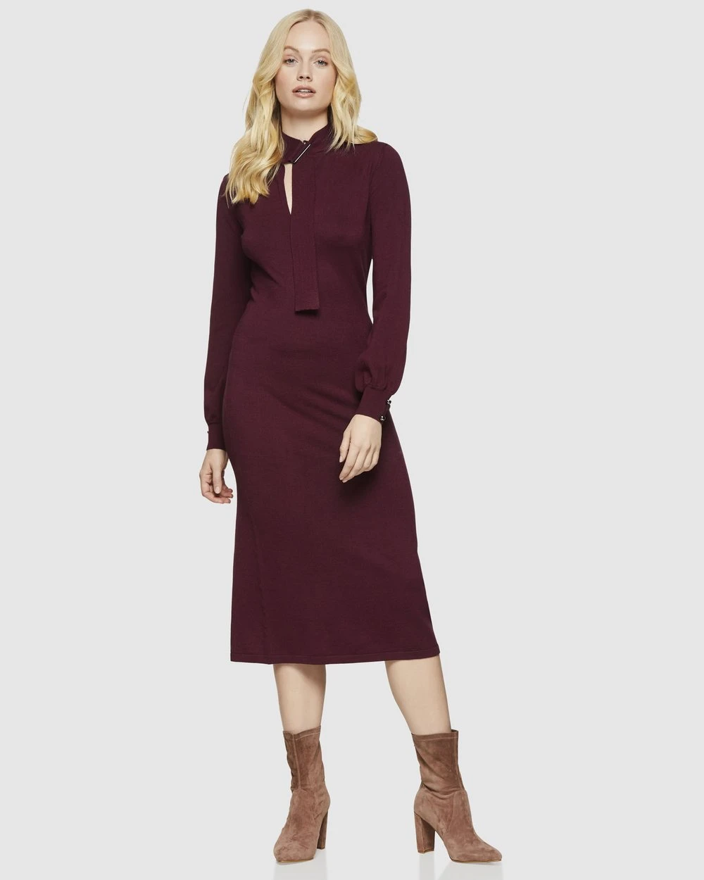 Take sophistication to the next level with the Oxford Yvonne Knitted Dress. This dress is super flattering with chic details such as open neckline with belted detail and bubble sleeves. Style yours for the office with heels and a leather tote.