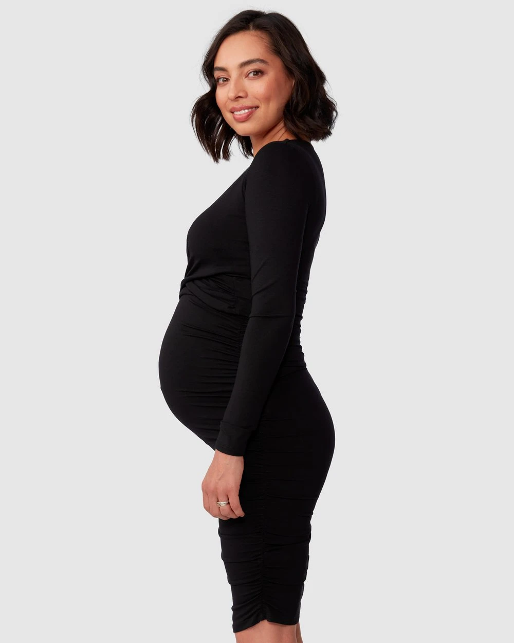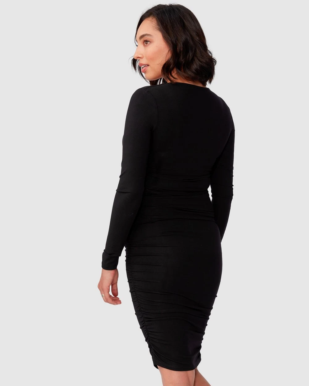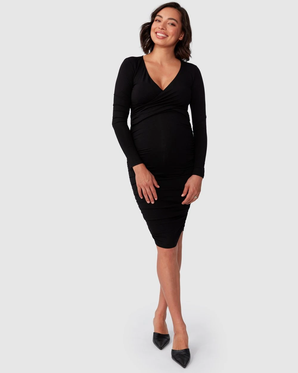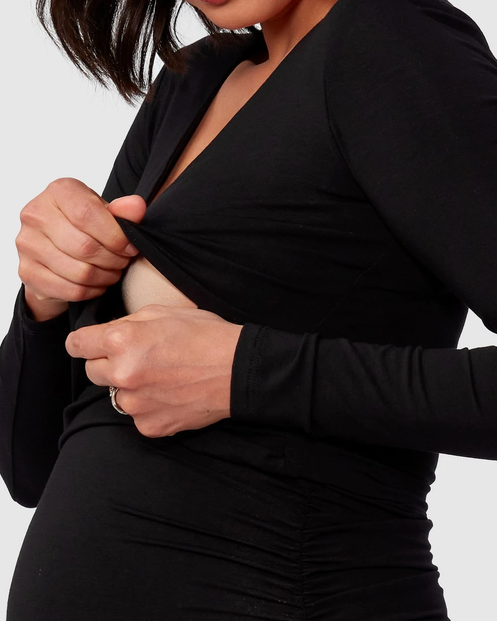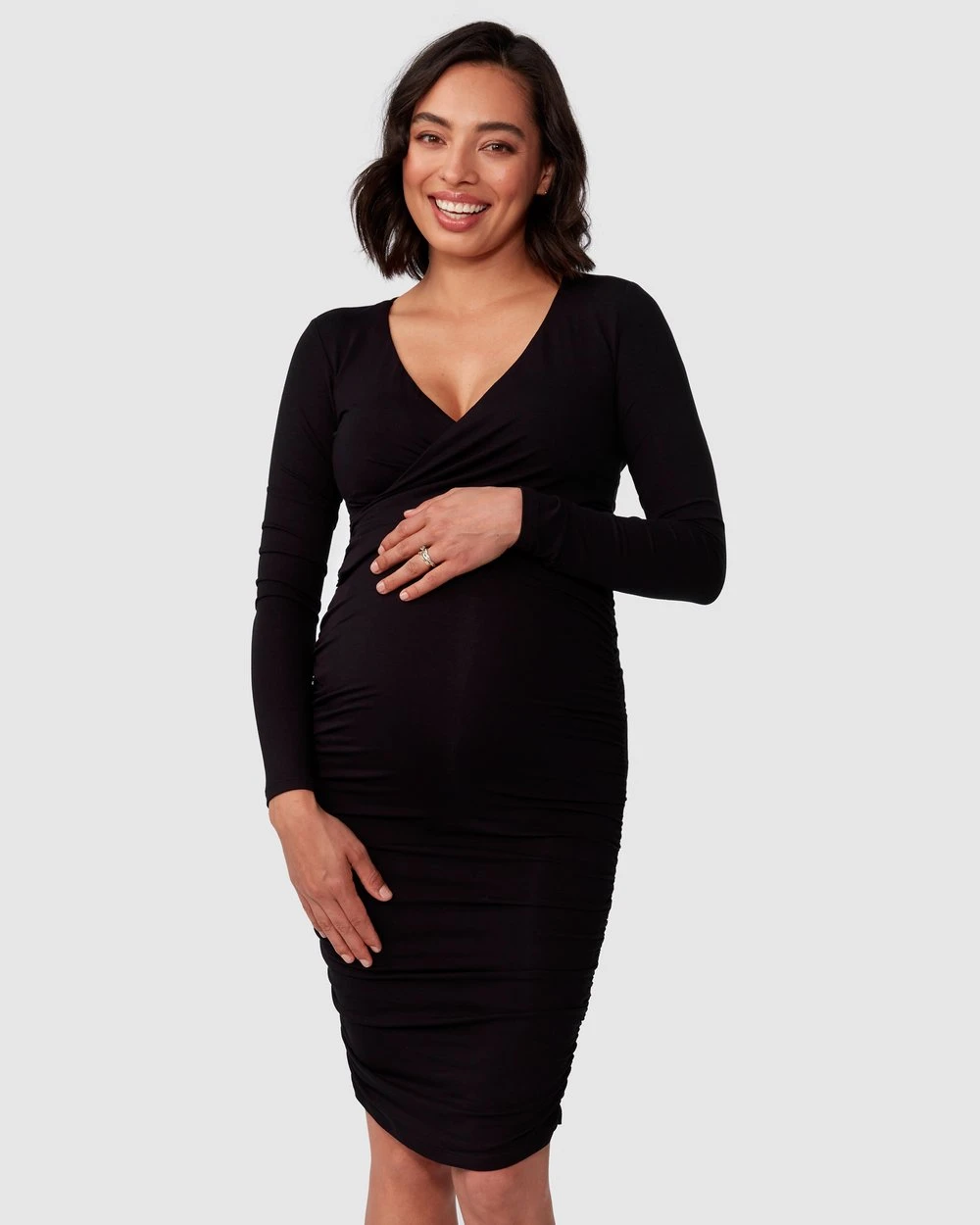 Proudly made in Australia the best selling Bailey Crossover Long Sleeve Nursing Dress from Melbourne maternity brand Pea in a Pod is a striking, fitted, long sleeve dress that is not just super soft, super comfy, but also super versatile. Dress it up or down depending on the occasion, Bailey is perfect for feeding or showing off your bump day or night!