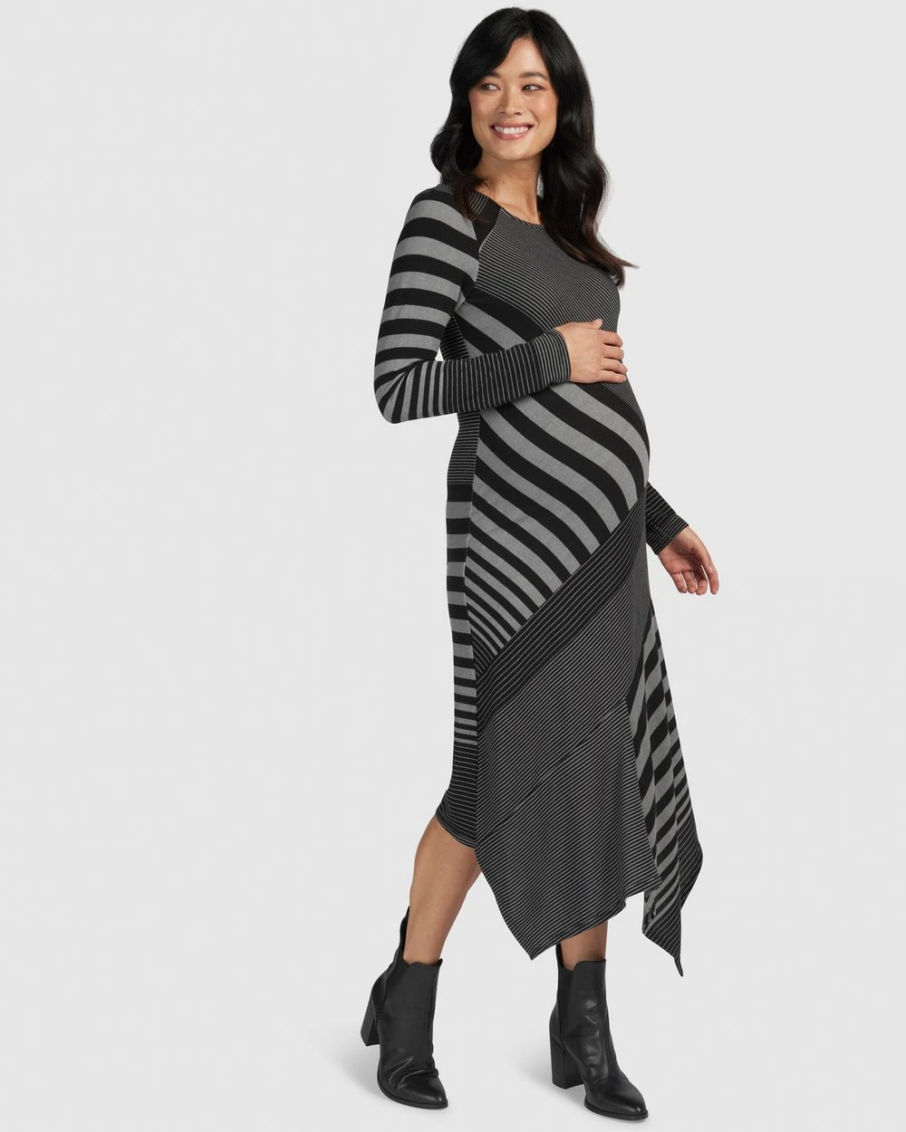 Proudly made in Australia, the striking and super comfy Clarissa Dress from Melbourne maternity brand Pea in a Pod is a sensual head-turner. With a funky, asymmetrical hemline and uneven diagonal striping, the Clarissa has a serious attitude – and not to mention the comfort levels you need during pregnancy!