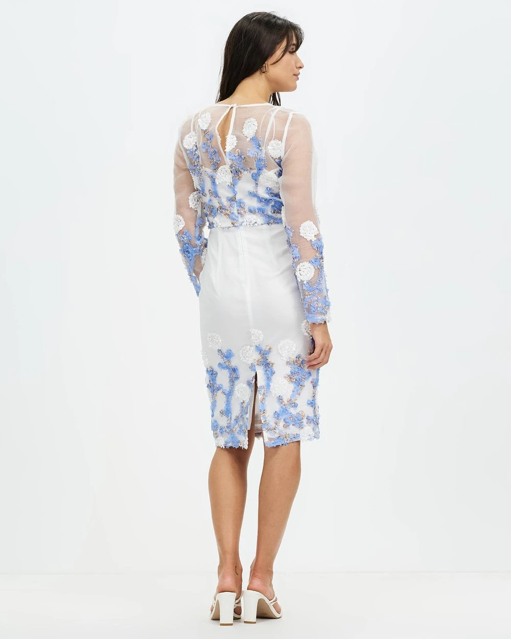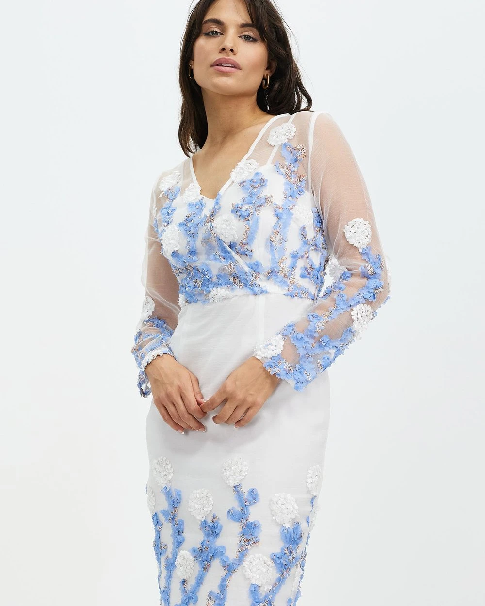Worked in flocked floral lace, the Night Garden V Dress from Pink Ruby lends a textural edge to any cocktail-ready rotation.