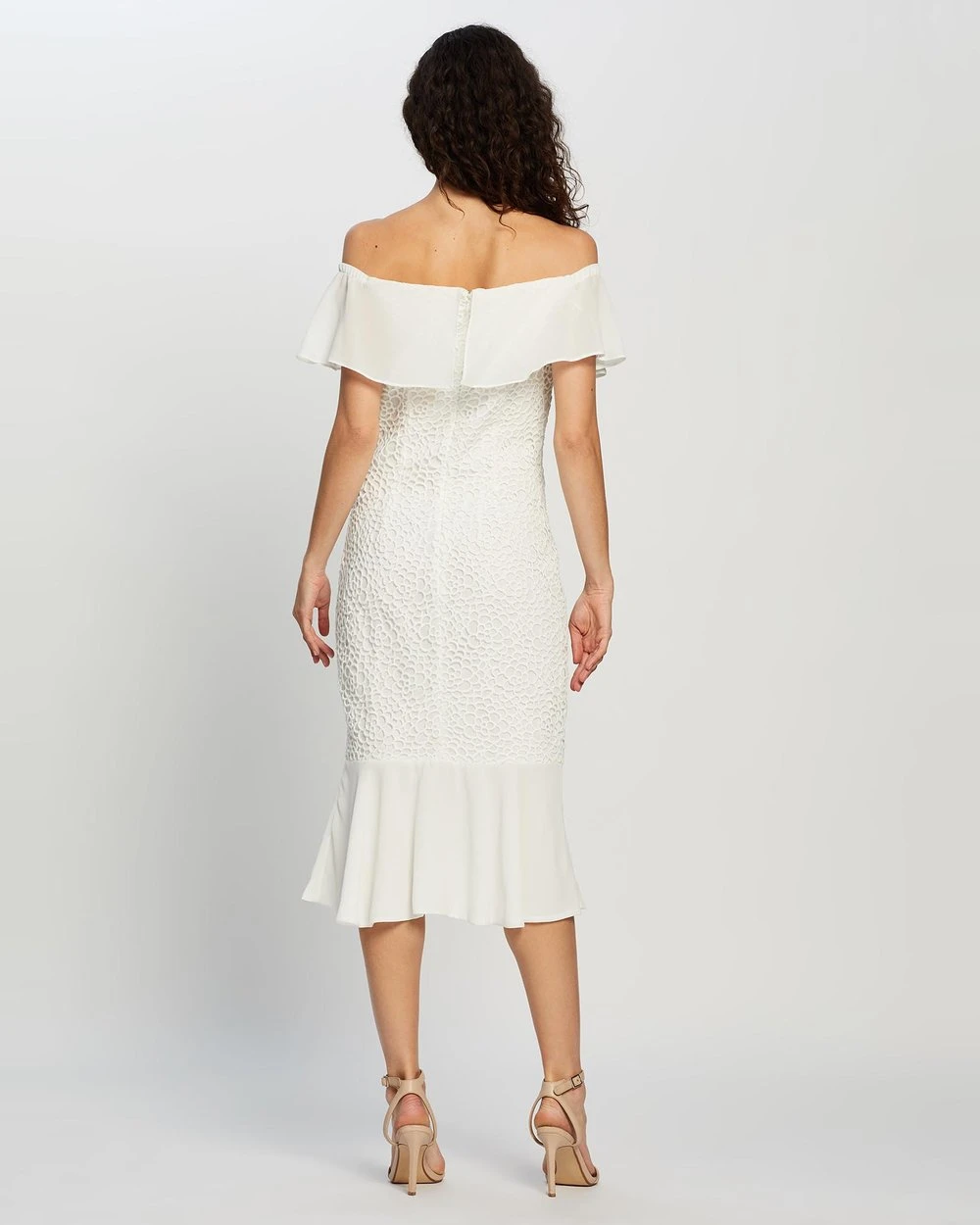 Featuring fine crepe sleeves, the Roma Off-The-Shoulder Dress from Australian label Pink Ruby can be worn with heels for an airy coctailwear option.