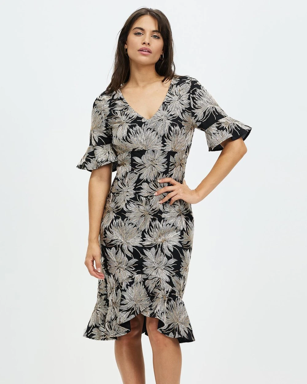 The Rosetta Dress by Pink Ruby showcases timeless elegance with a white rose print and a flounce hemline.
