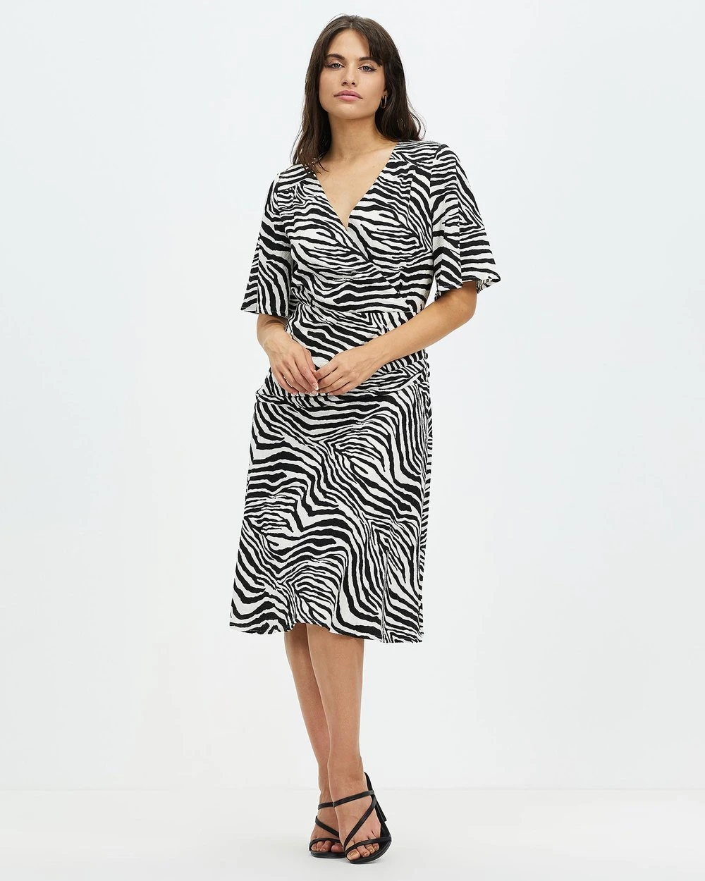 – Elbow-length flutter sleeves