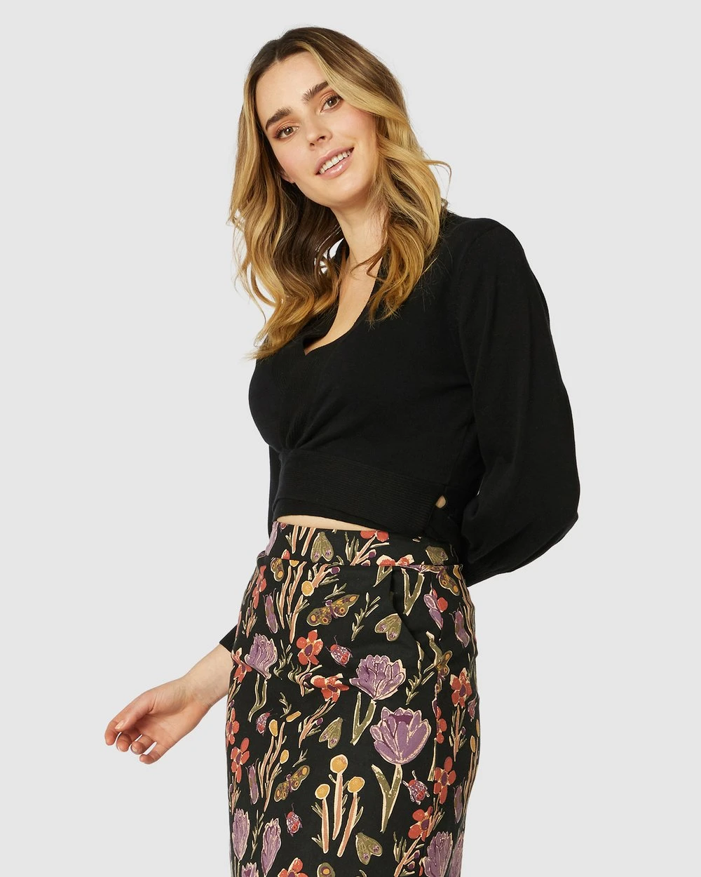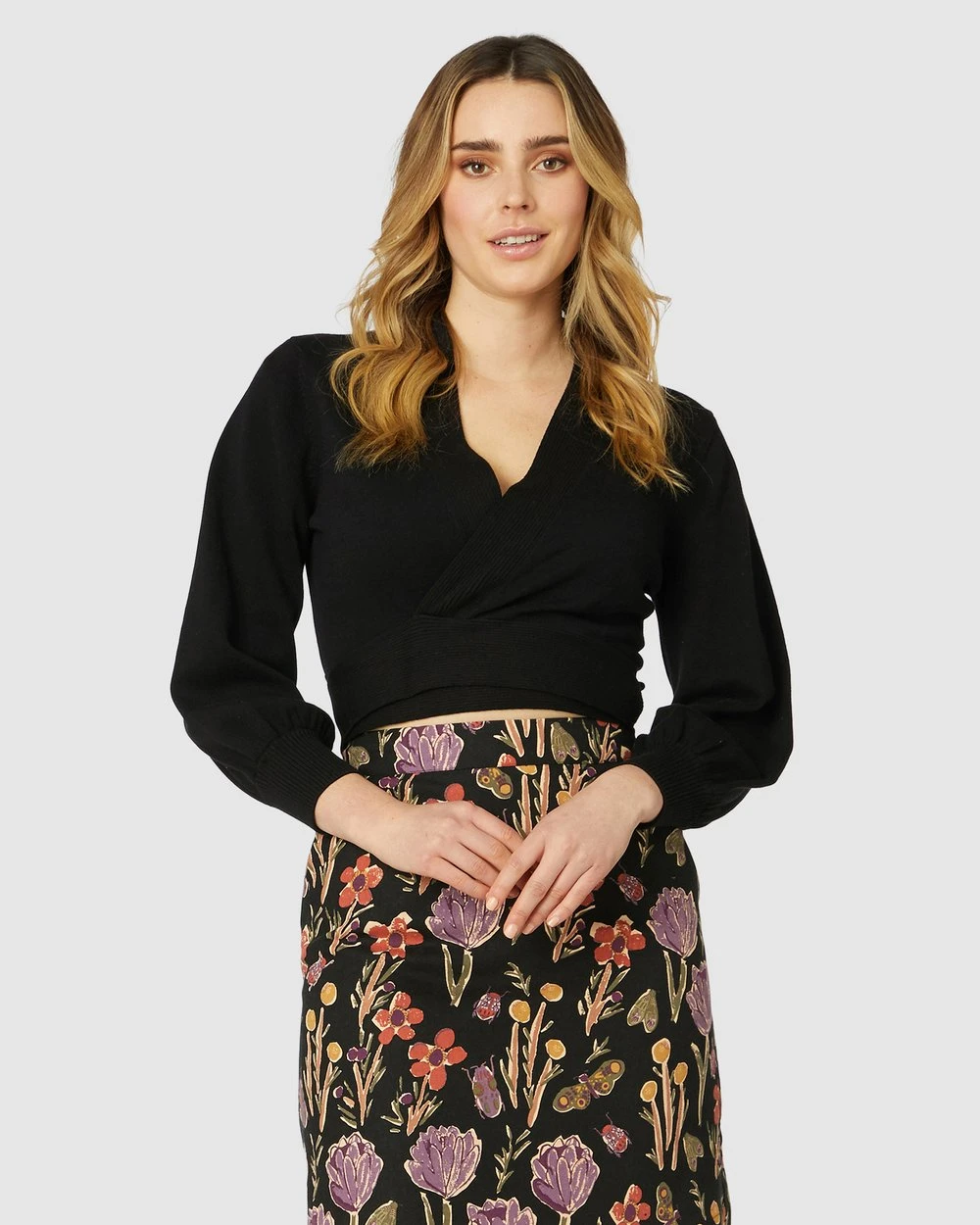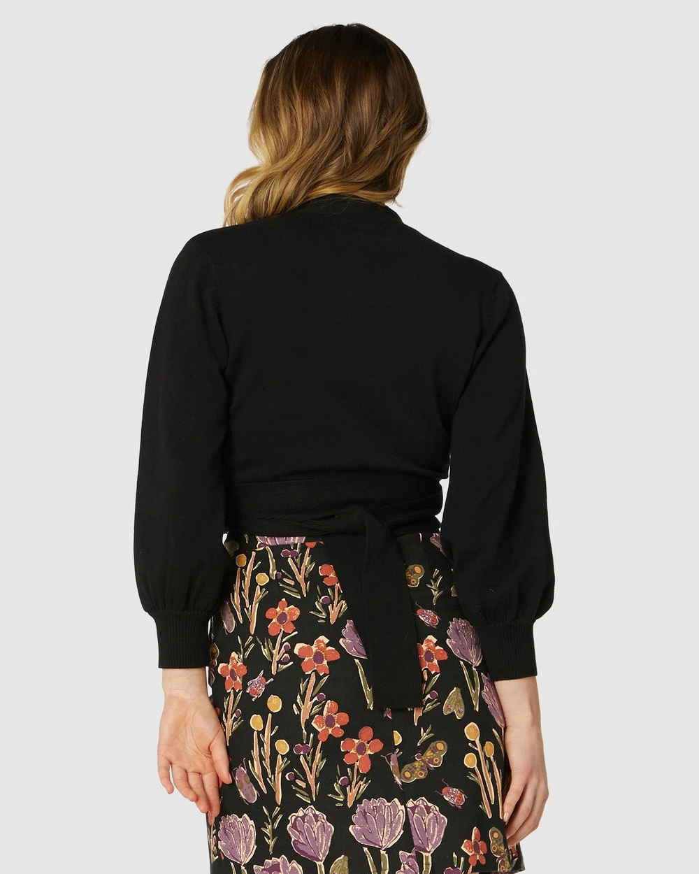 The Ballet Wrap Knit Top by Princess Highway is a cropped wrap cardigan. This cardigan has a v-neckline, large adjustable wrap tie, cropped length to natural waist, 3/4 length blouson sleeves and 100% cotton fabric.