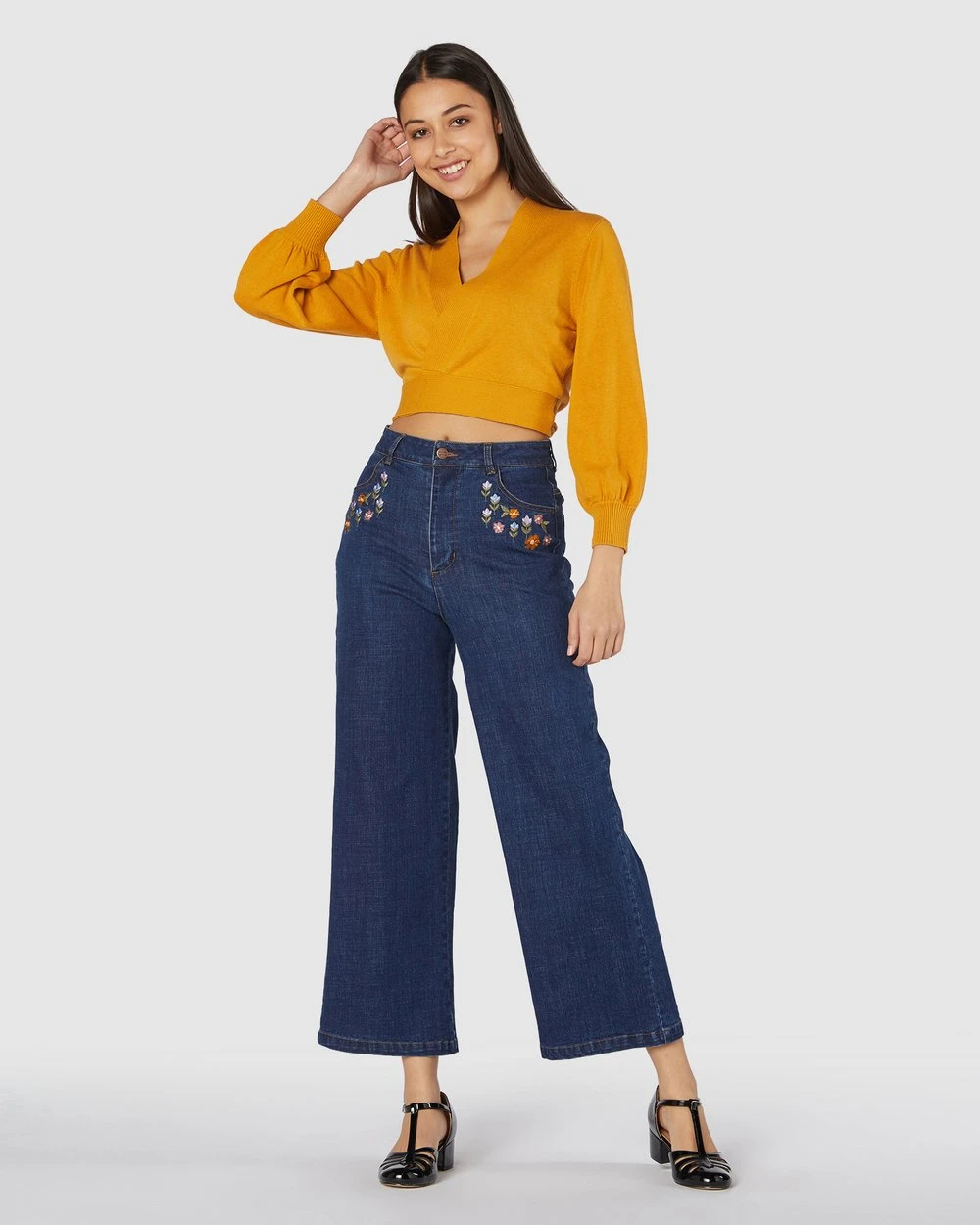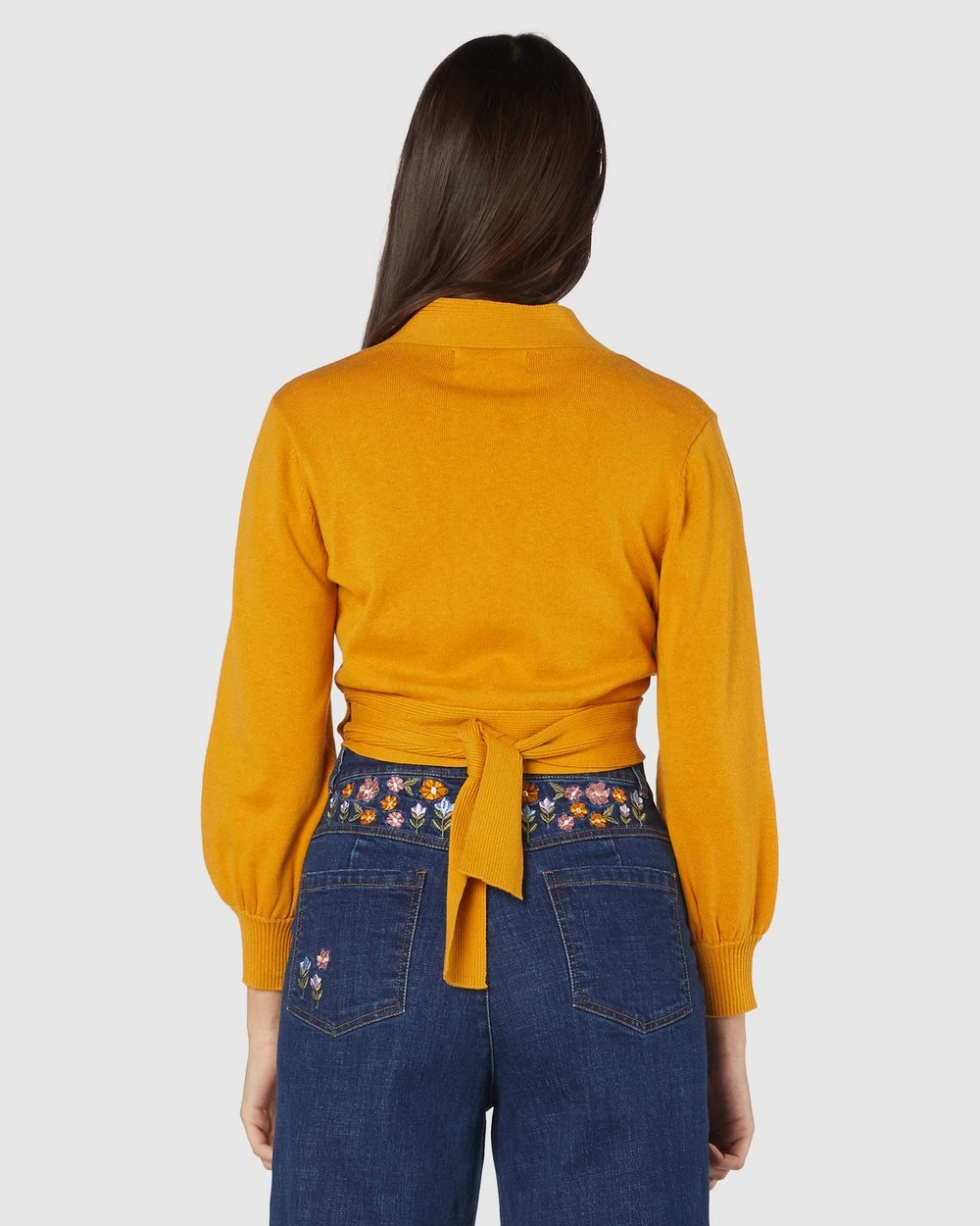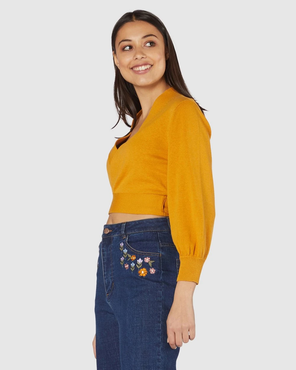 The Ballet Wrap Knit Top by Princess Highway is a cropped wrap cardigan. This cardigan has a v-neckline, large adjustable wrap tie, cropped length to natural waist, 3/4 length blouson sleeves and 100% cotton fabric.