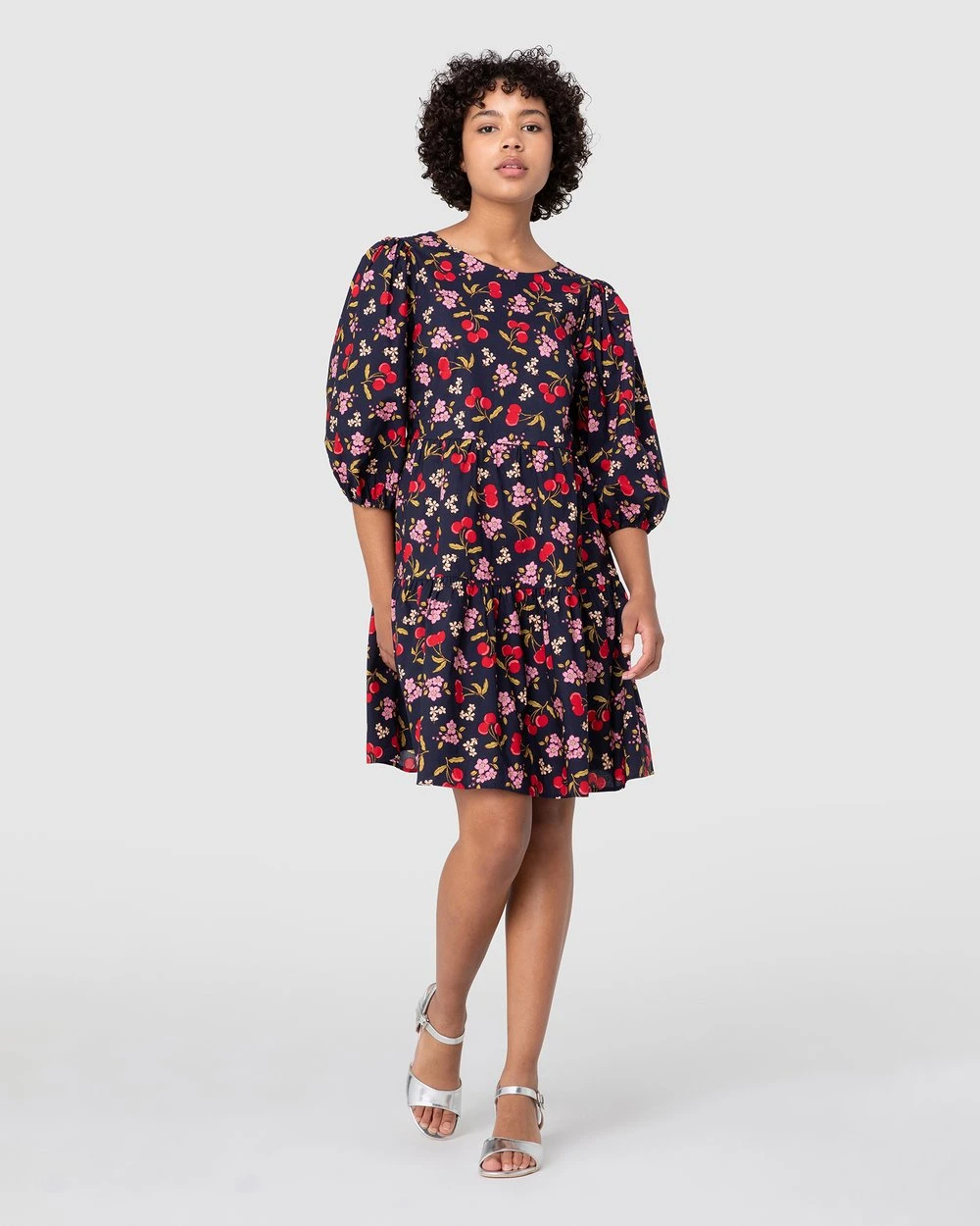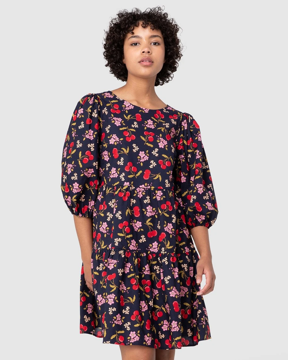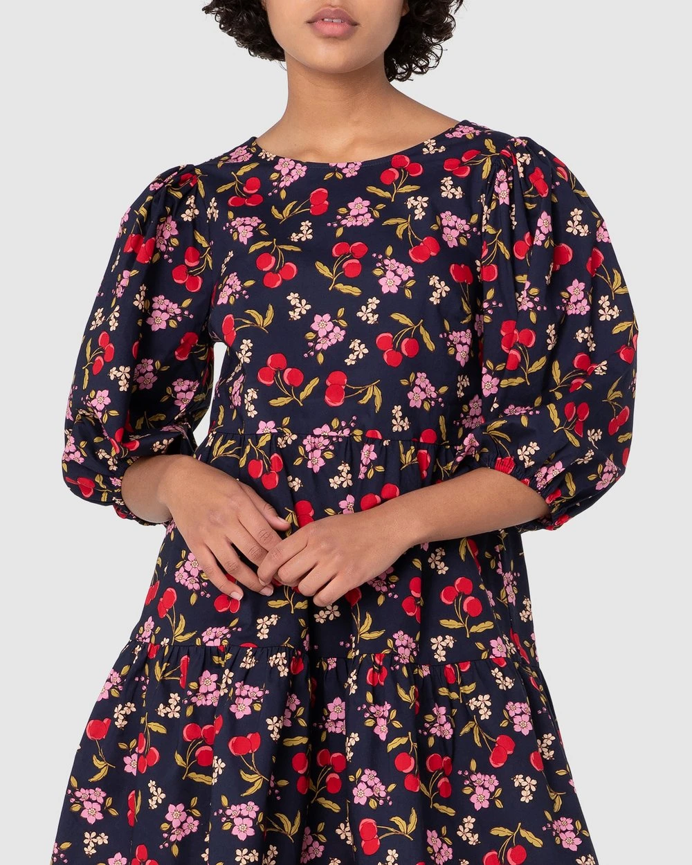 The French Cherry Smock Dress by Princess Highway is an organic cotton cherry print day dress. This dress has a tiered skirt, roomy fit bodice, organic cotton fabric, mid-length puff sleeves, skirt length that falls to the knee and an exclusive princess highway cherries amongst blooming buds print.