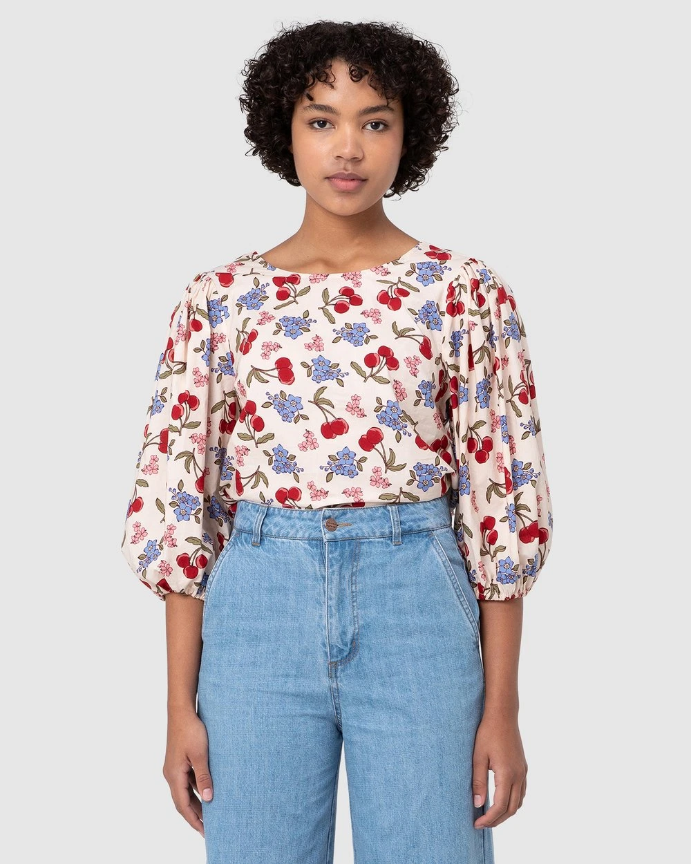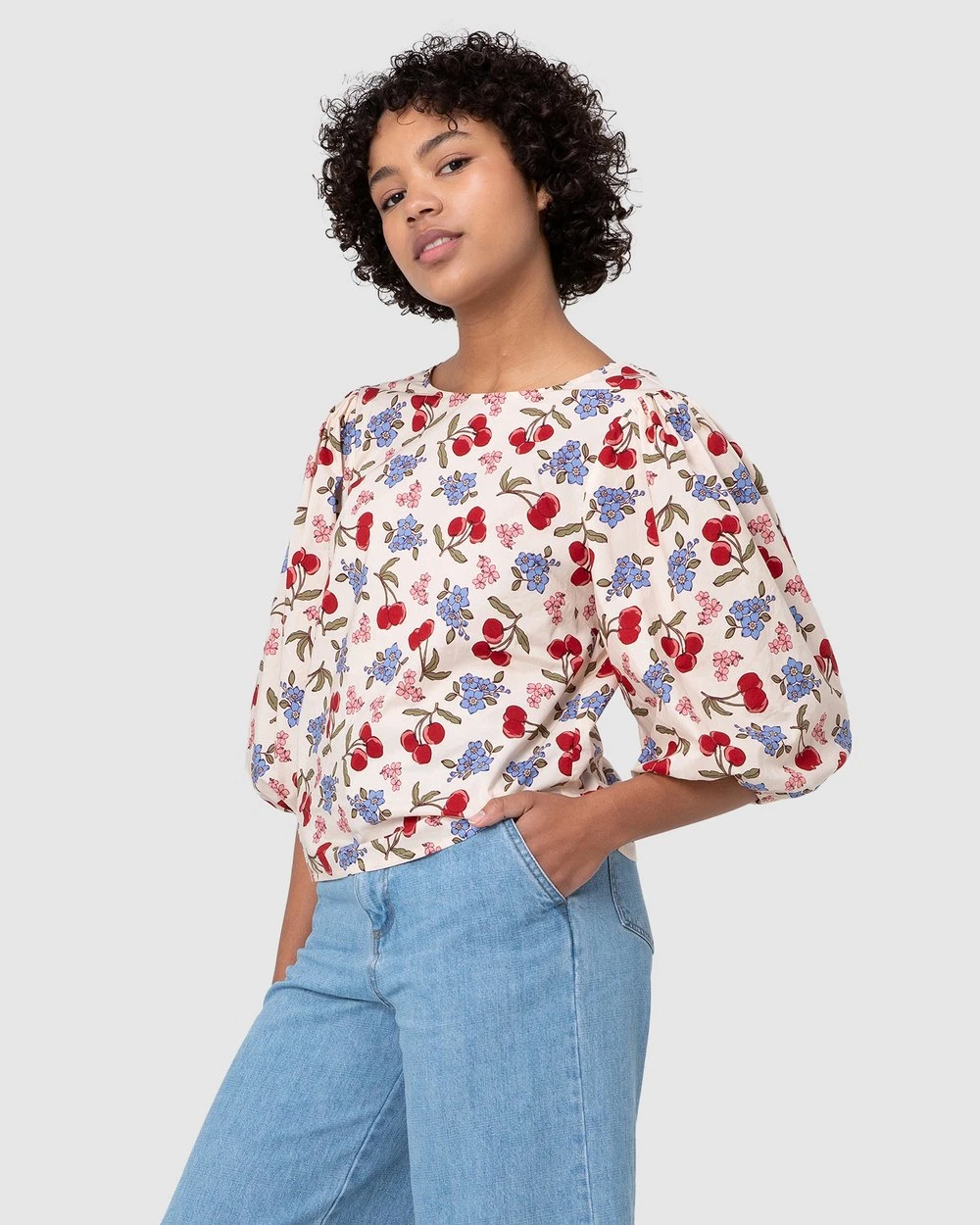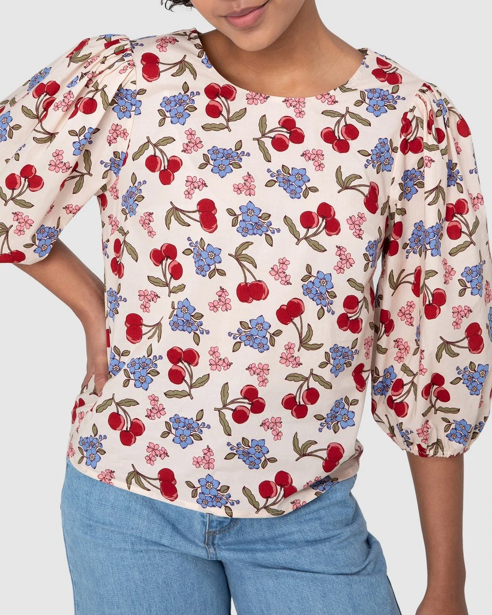 The French Cherry Top by Princess Highway is an organic cotton cherry smock top. This top has a round neckline, a roomy fit bodice, organic cotton fabric, mid-length puff sleeves and an exclusive princess highway cherries amongst blooming buds print.