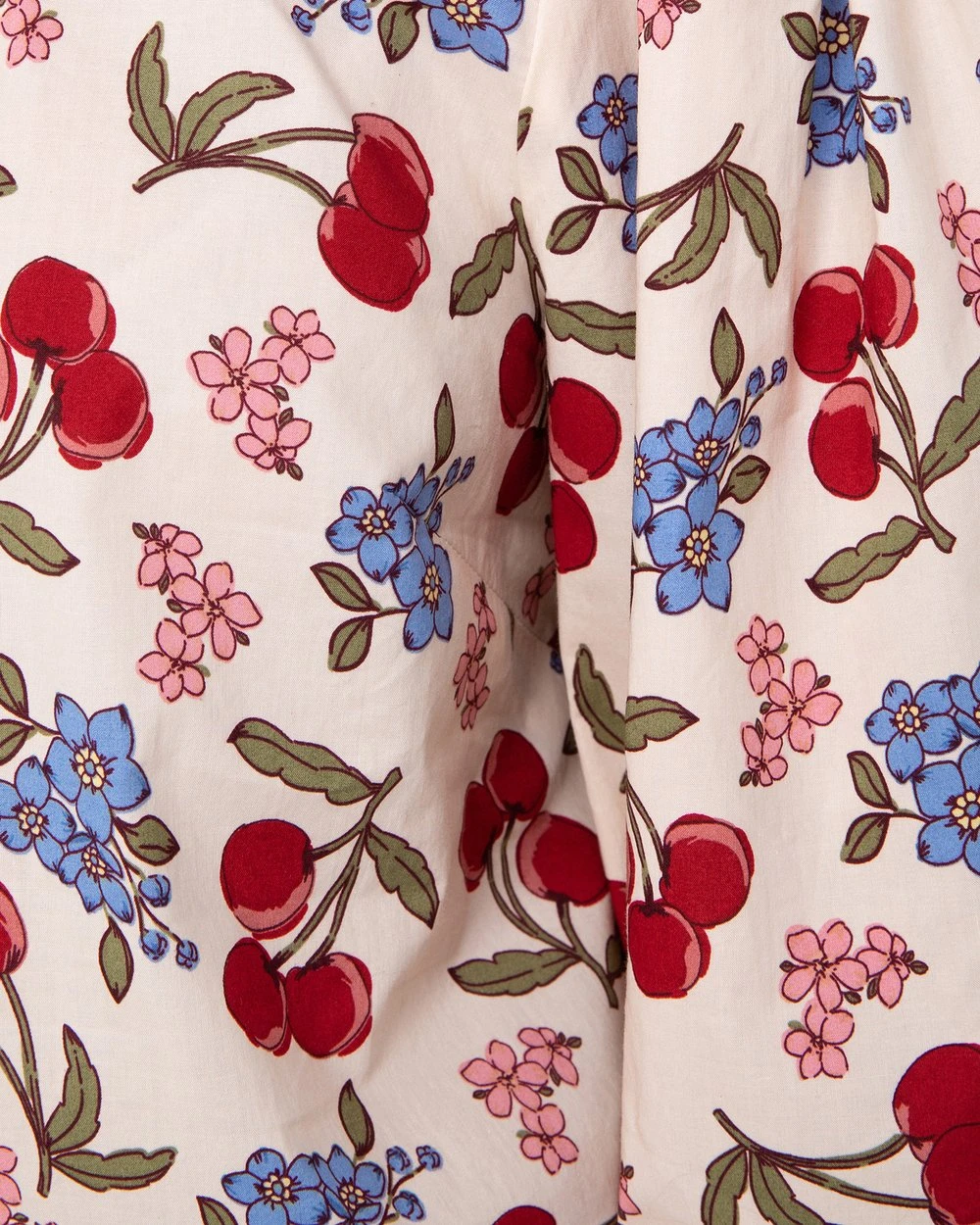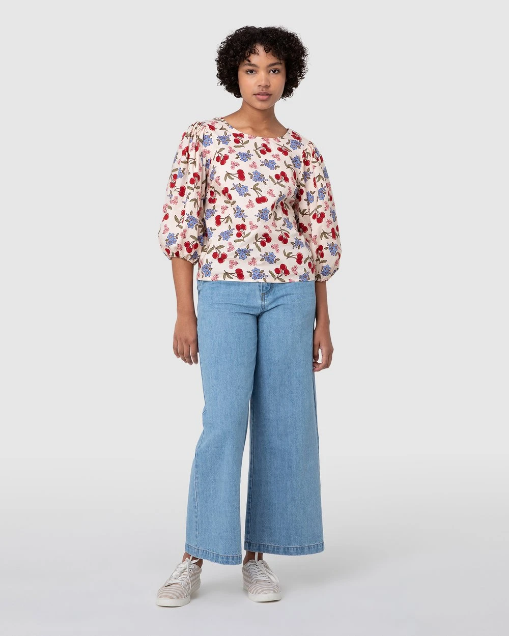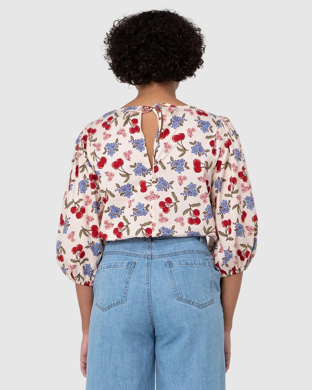 The French Cherry Top by Princess Highway is an organic cotton cherry smock top. This top has a round neckline, a roomy fit bodice, organic cotton fabric, mid-length puff sleeves and an exclusive princess highway cherries amongst blooming buds print.