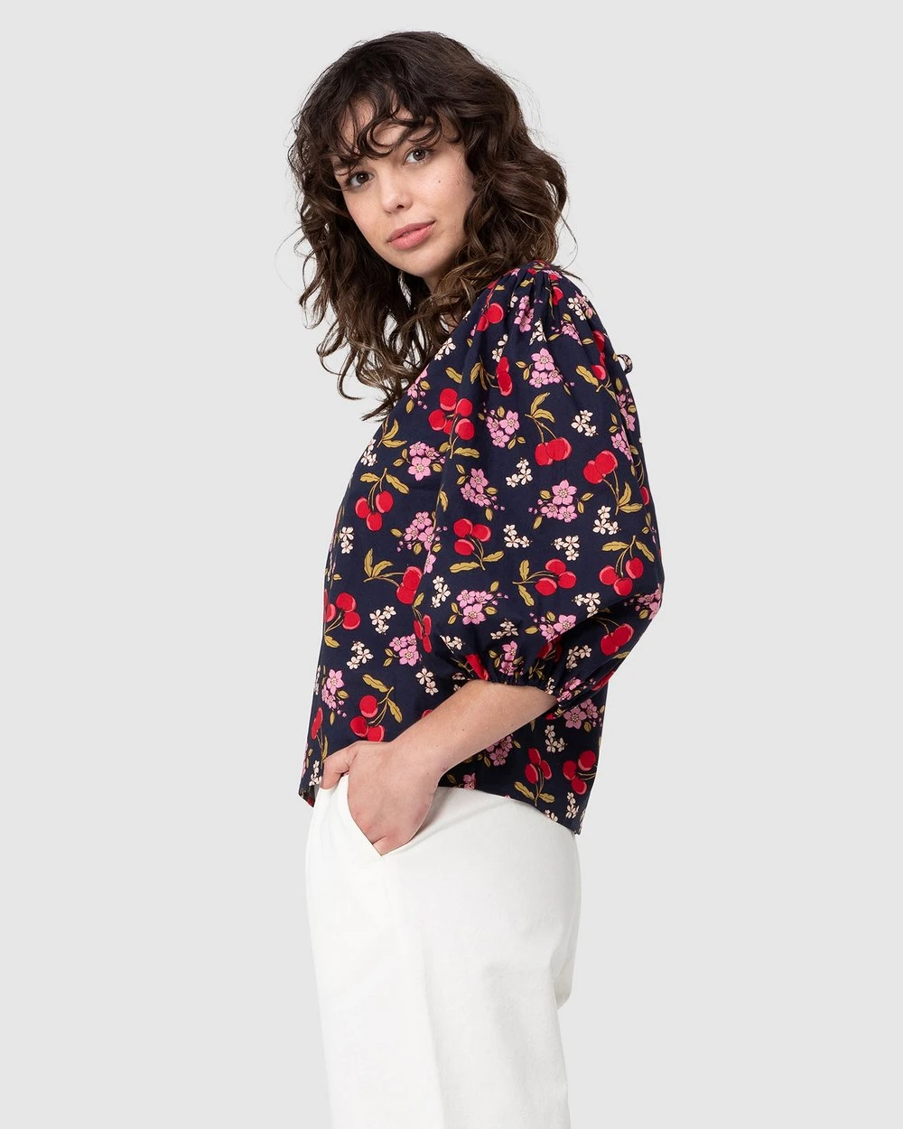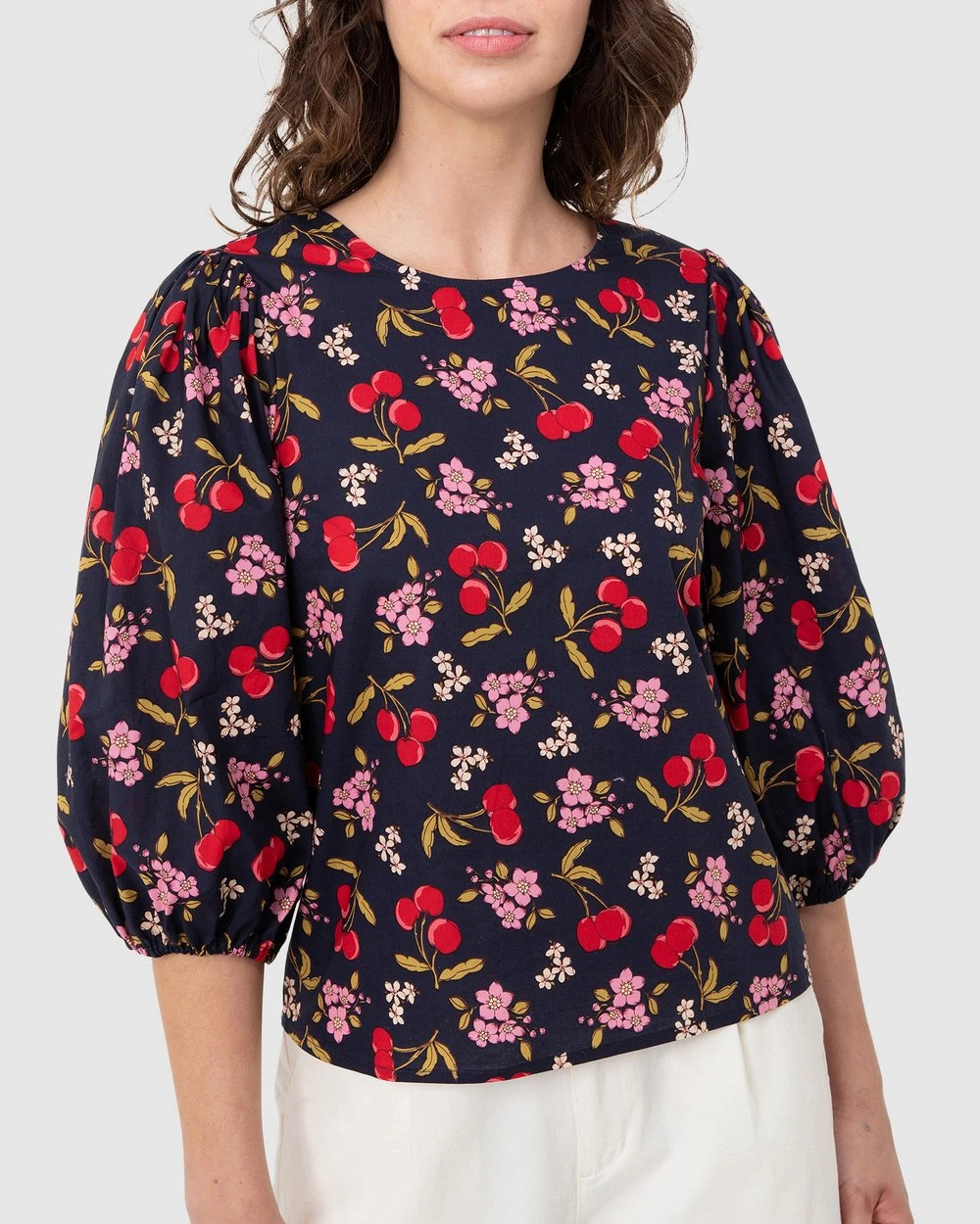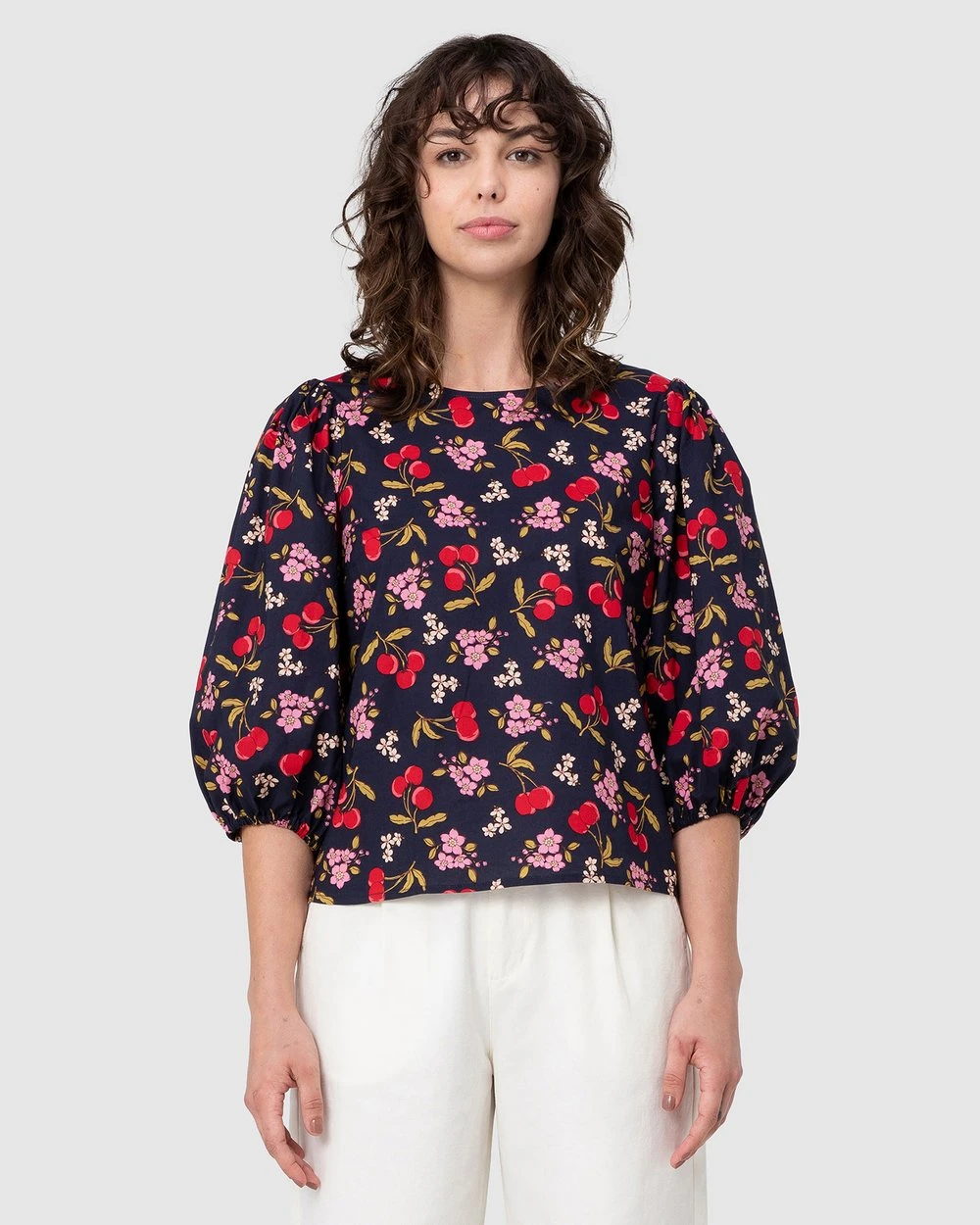 The French Cherry Top by Princess Highway is an organic cotton cherry smock top. This top has a round neckline, a roomy fit bodice, organic cotton fabric, mid-length puff sleeves and an exclusive princess highway cherries amongst blooming buds print.
