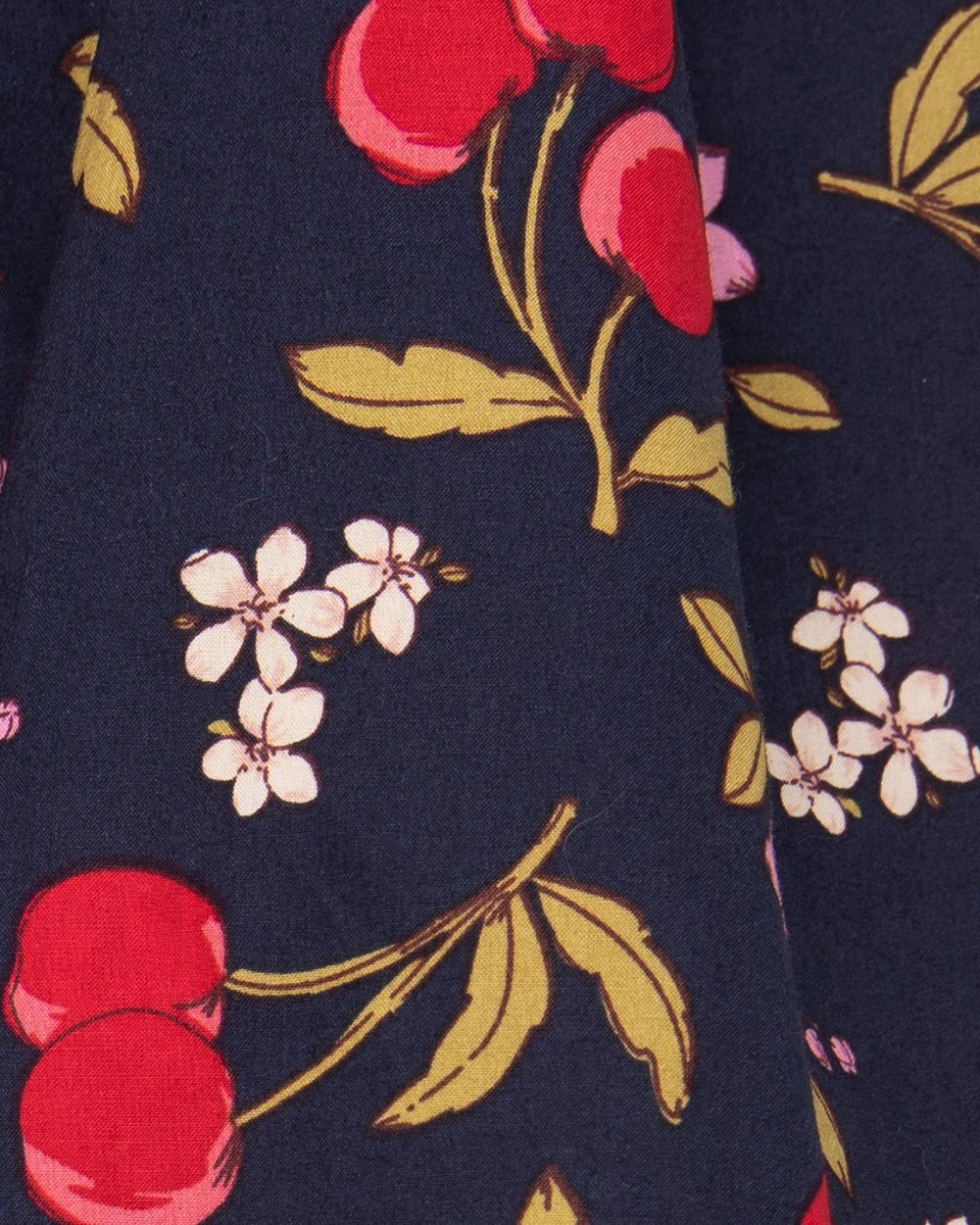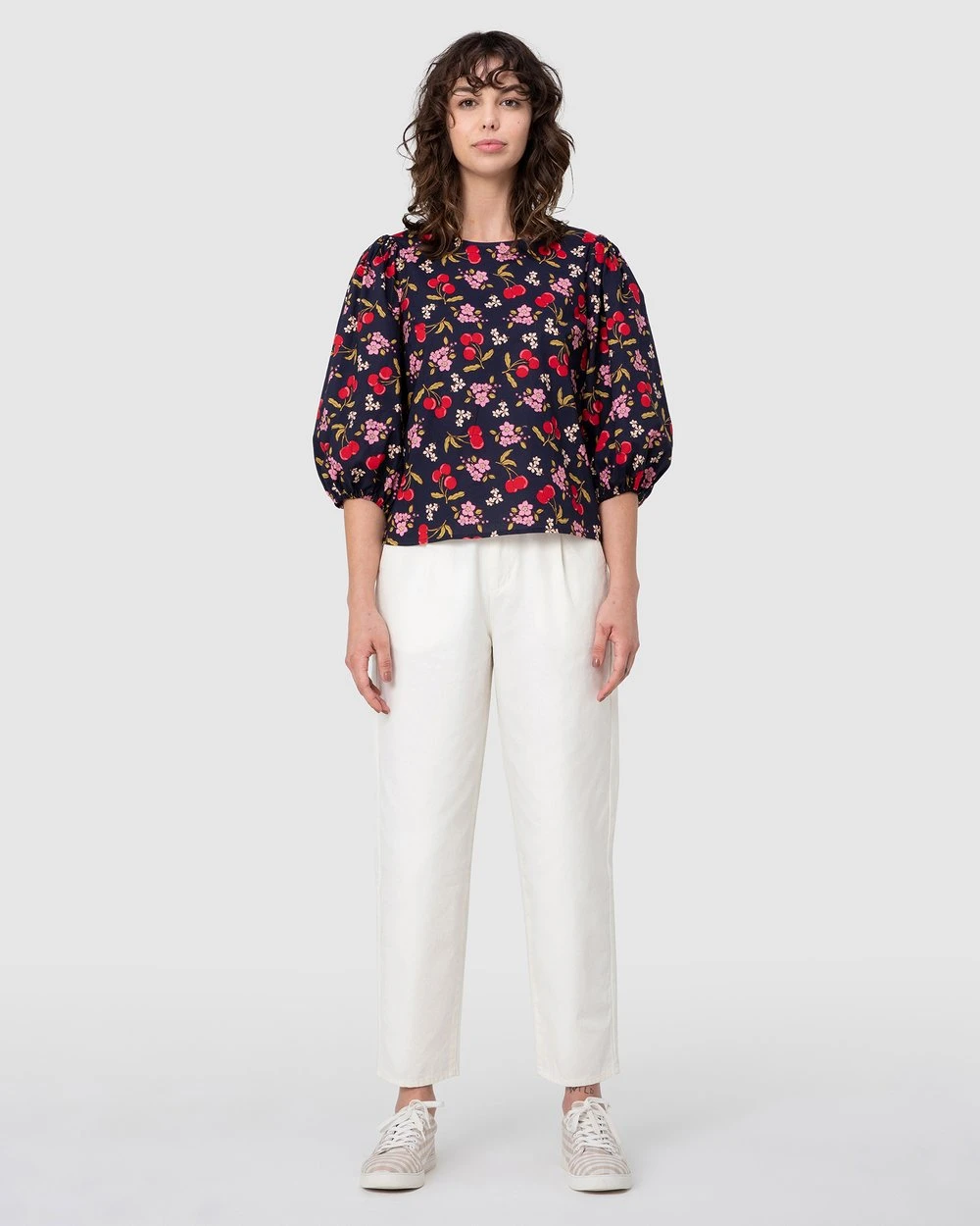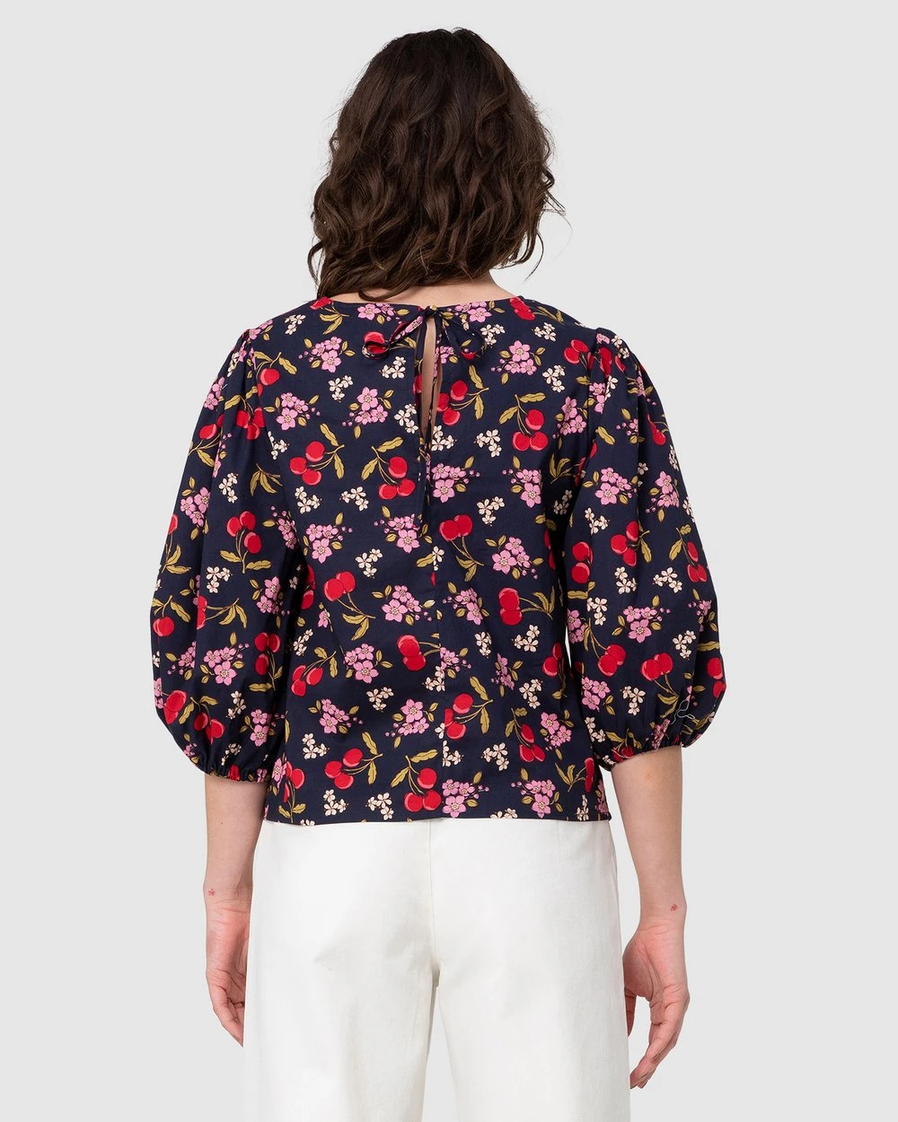 The French Cherry Top by Princess Highway is an organic cotton cherry smock top. This top has a round neckline, a roomy fit bodice, organic cotton fabric, mid-length puff sleeves and an exclusive princess highway cherries amongst blooming buds print.