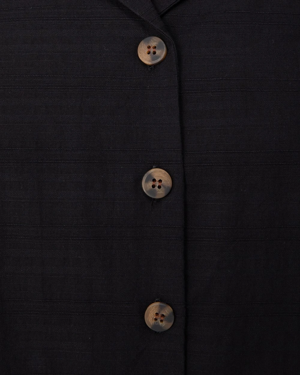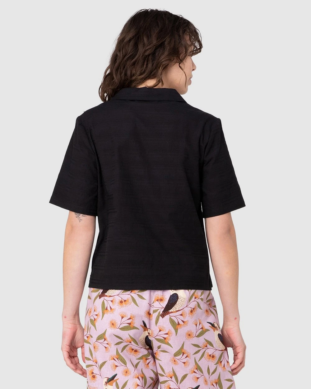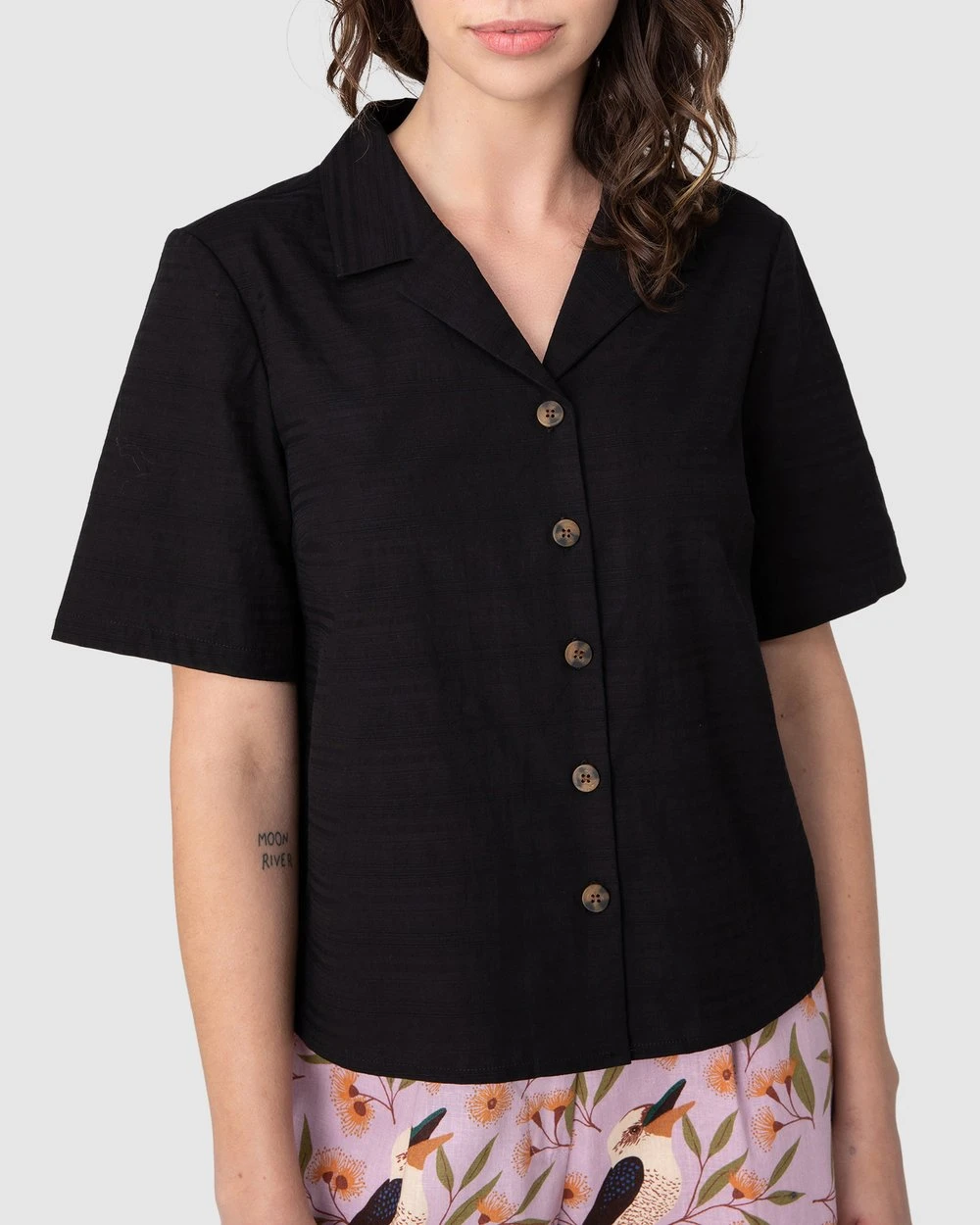 The Greta Blouse by Princess Highway is an open collar shirt. This blouse has textured cotton fabric, an open lapel collar, dropped sleeve length, contrast tortoiseshell buttons through front and a boxy silhouette.