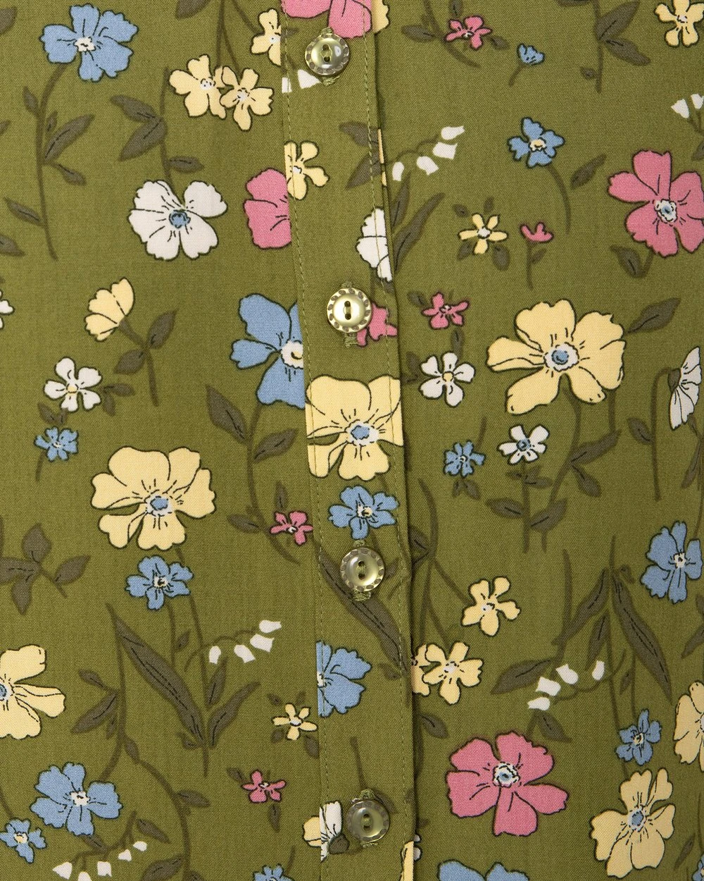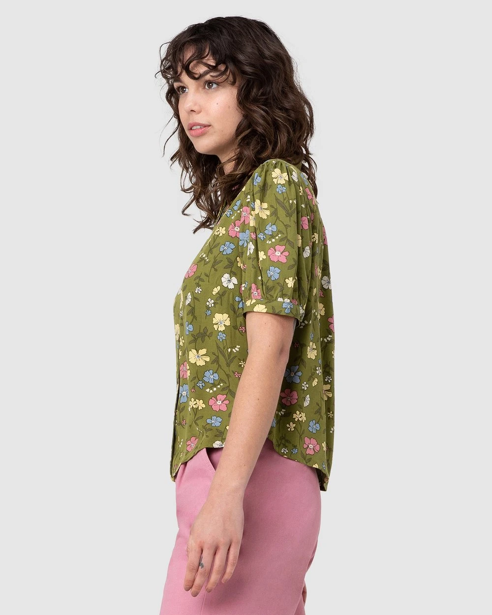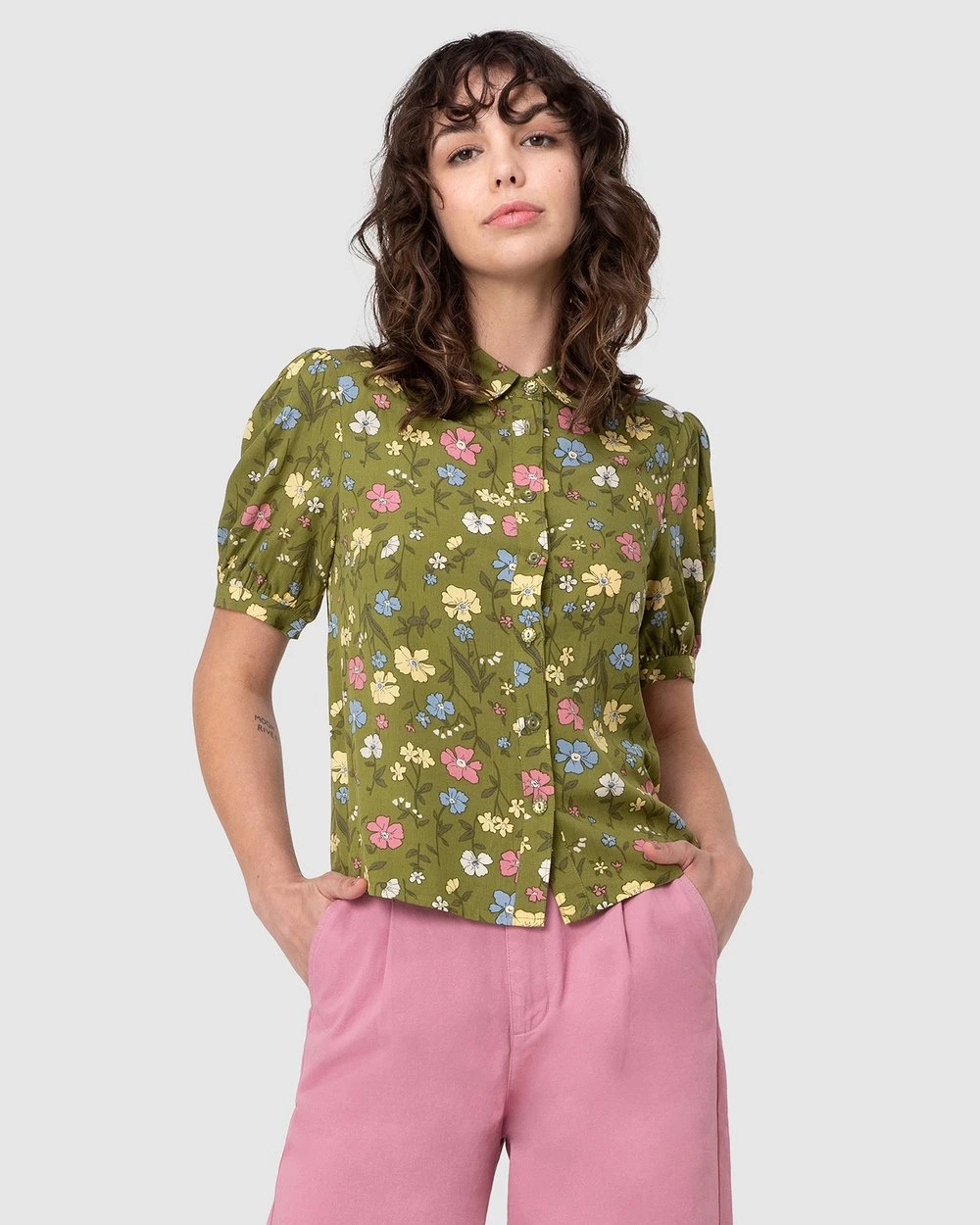 The Heather Ditsy Blouse by Princess Highway is a tea floral viscose blouse. This blouse has soft and floaty viscose fabric, short cuffed puff sleeves, a high round collar, exclusive princess highway scattered flowers and lush greenery print and buttons through front.
