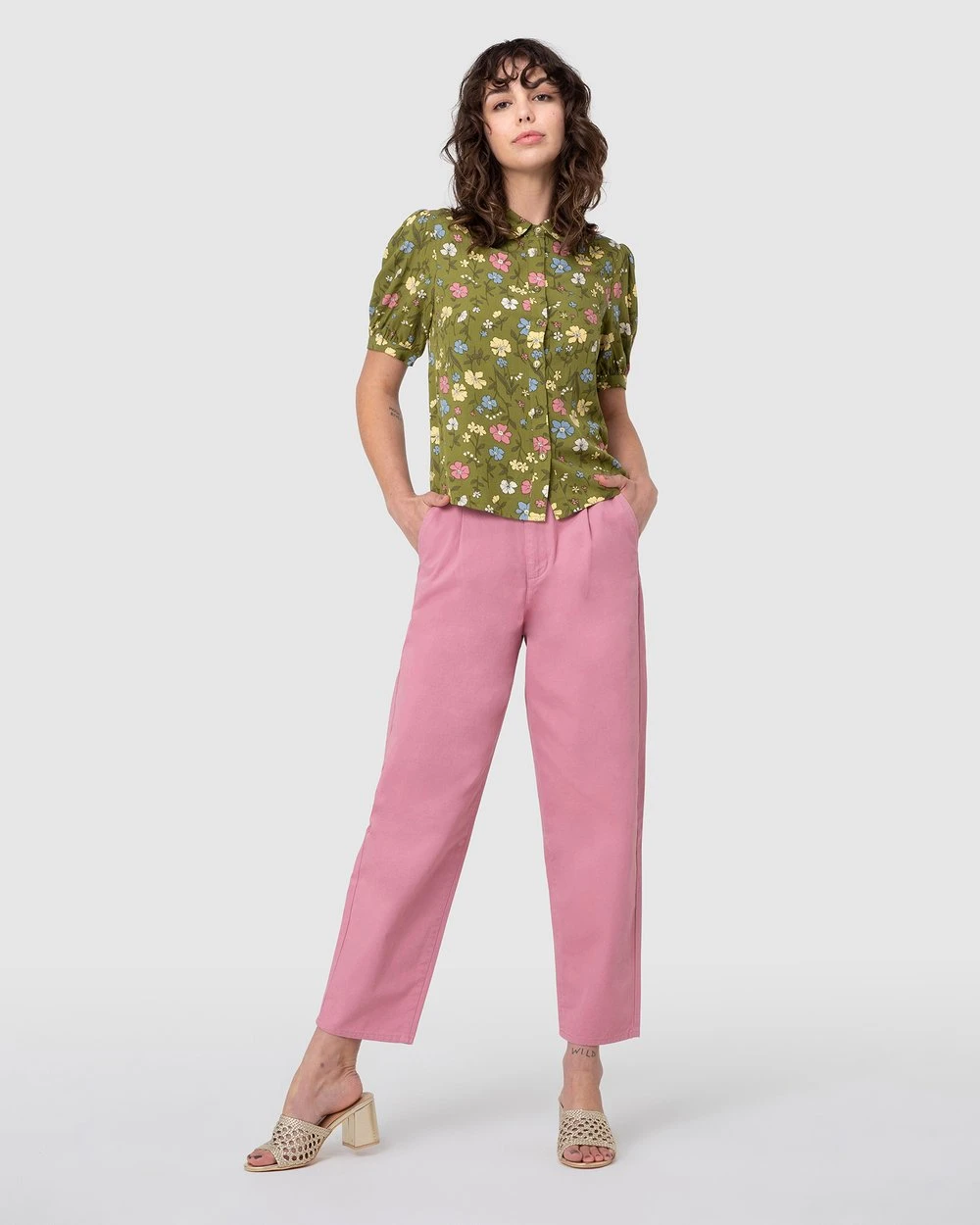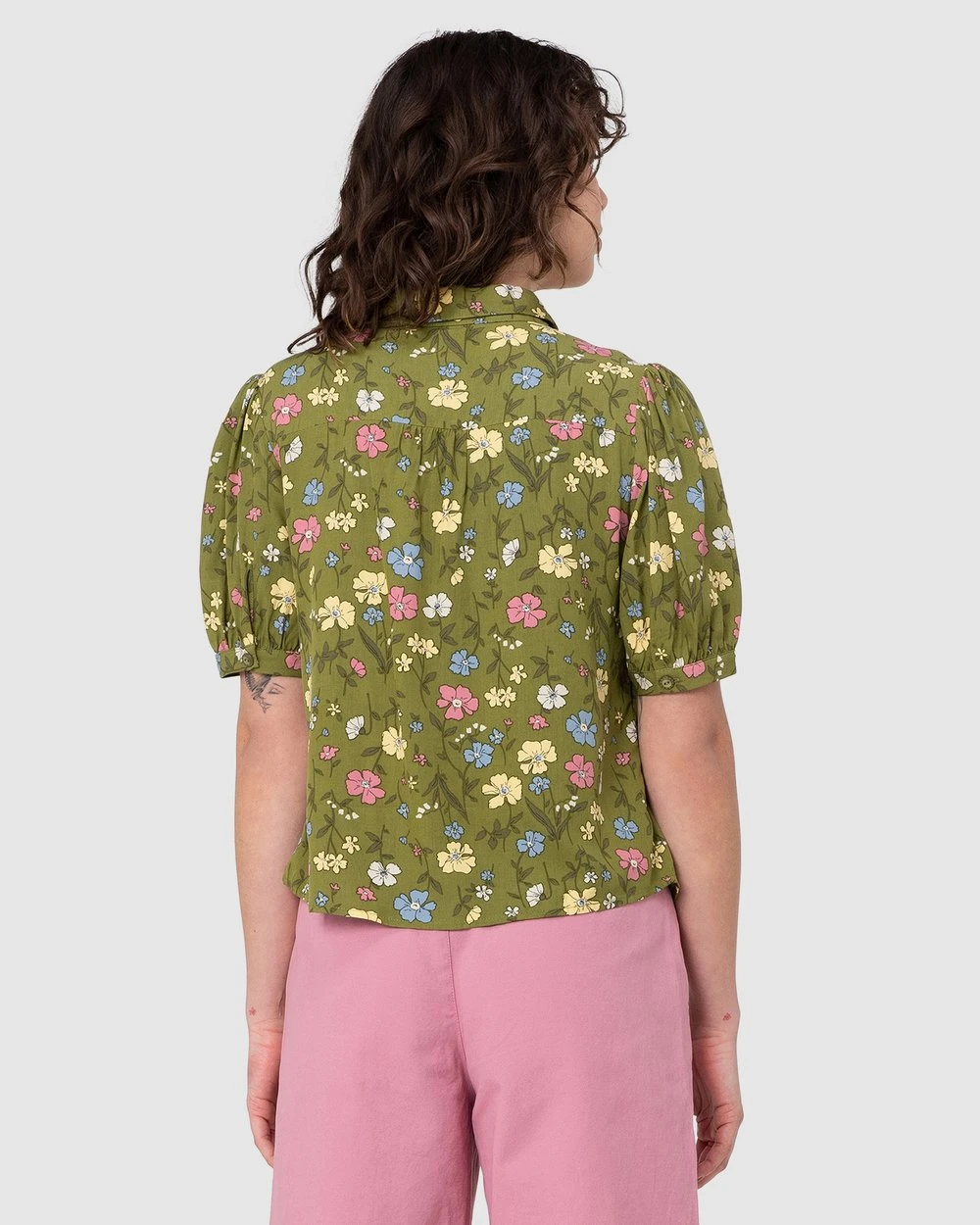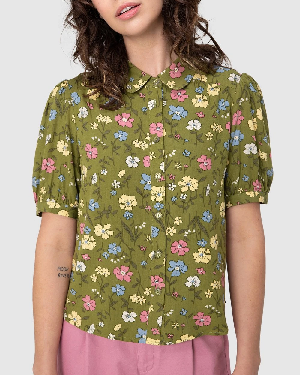 The Heather Ditsy Blouse by Princess Highway is a tea floral viscose blouse. This blouse has soft and floaty viscose fabric, short cuffed puff sleeves, a high round collar, exclusive princess highway scattered flowers and lush greenery print and buttons through front.