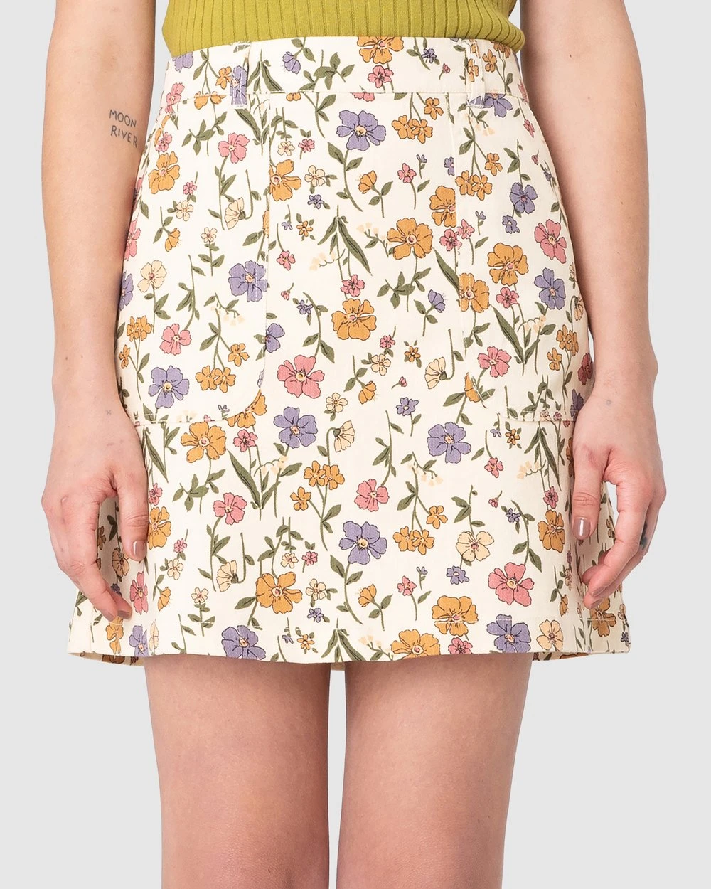 The Heather Ditsy Drill Mini Skirt by Princess Highway is a tea floral mini drill skirt. This skirt has large front patch pockets, high-waisted rise, brightly scattered flowers and lush greenery print, a back zip and button closure and an a-line silhouette.