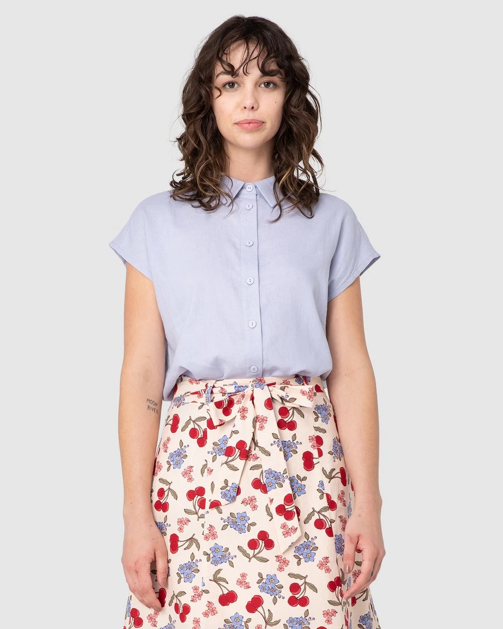 The Kelly Blouse by Princess Highway is a short sleeve button down shirt. This blouse has seamless short sleeves, a pointed collar, front button closure and back darts for shaping.