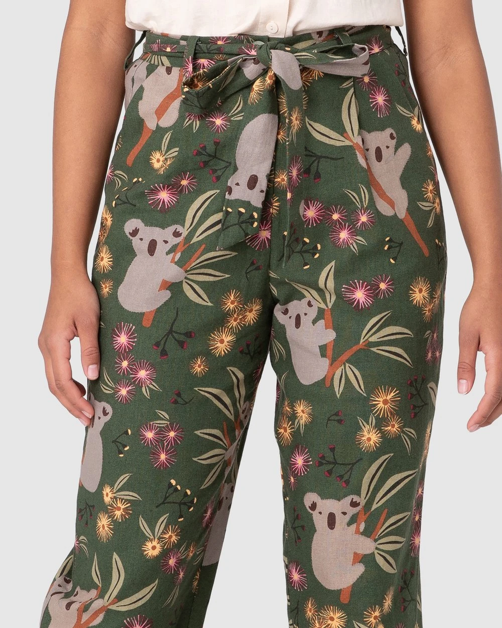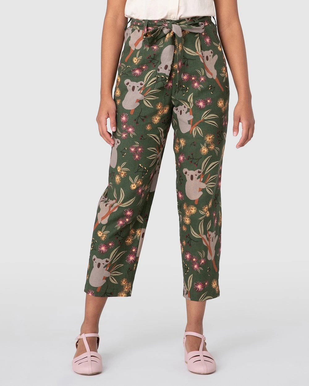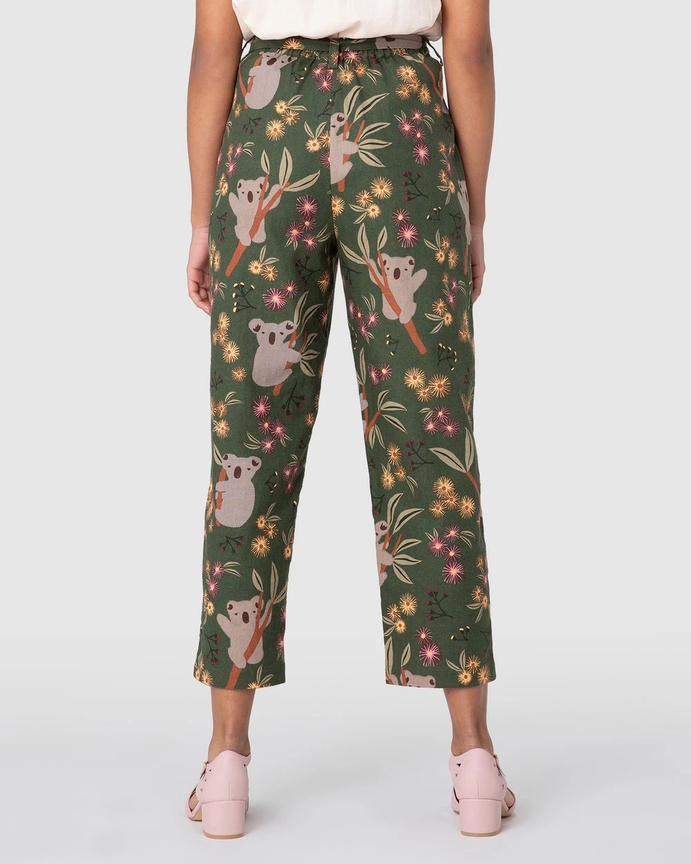 The Koala Pants by Princess Highway are high waisted koala printed pants. This pair of pants has a tapered leg cut, mid-weight linen cotton blend fabric, high-waisted rise, handy side pockets, an exclusive princess highway native flora and koalas print and an elasticated back waistband.