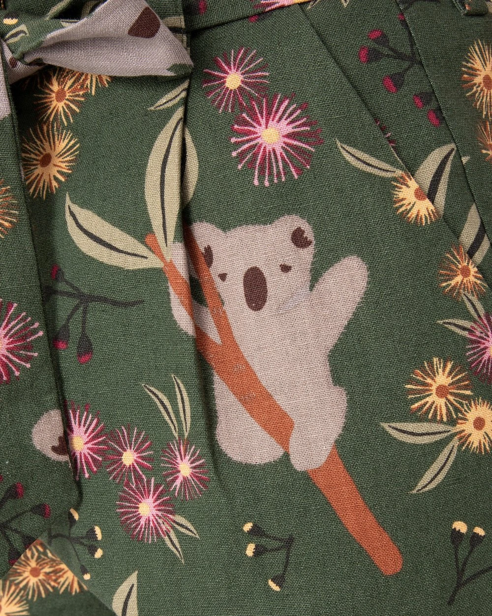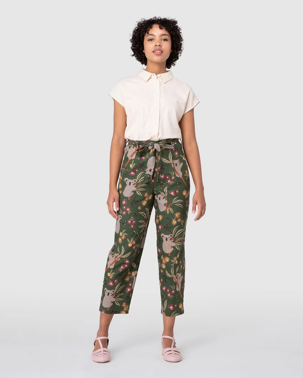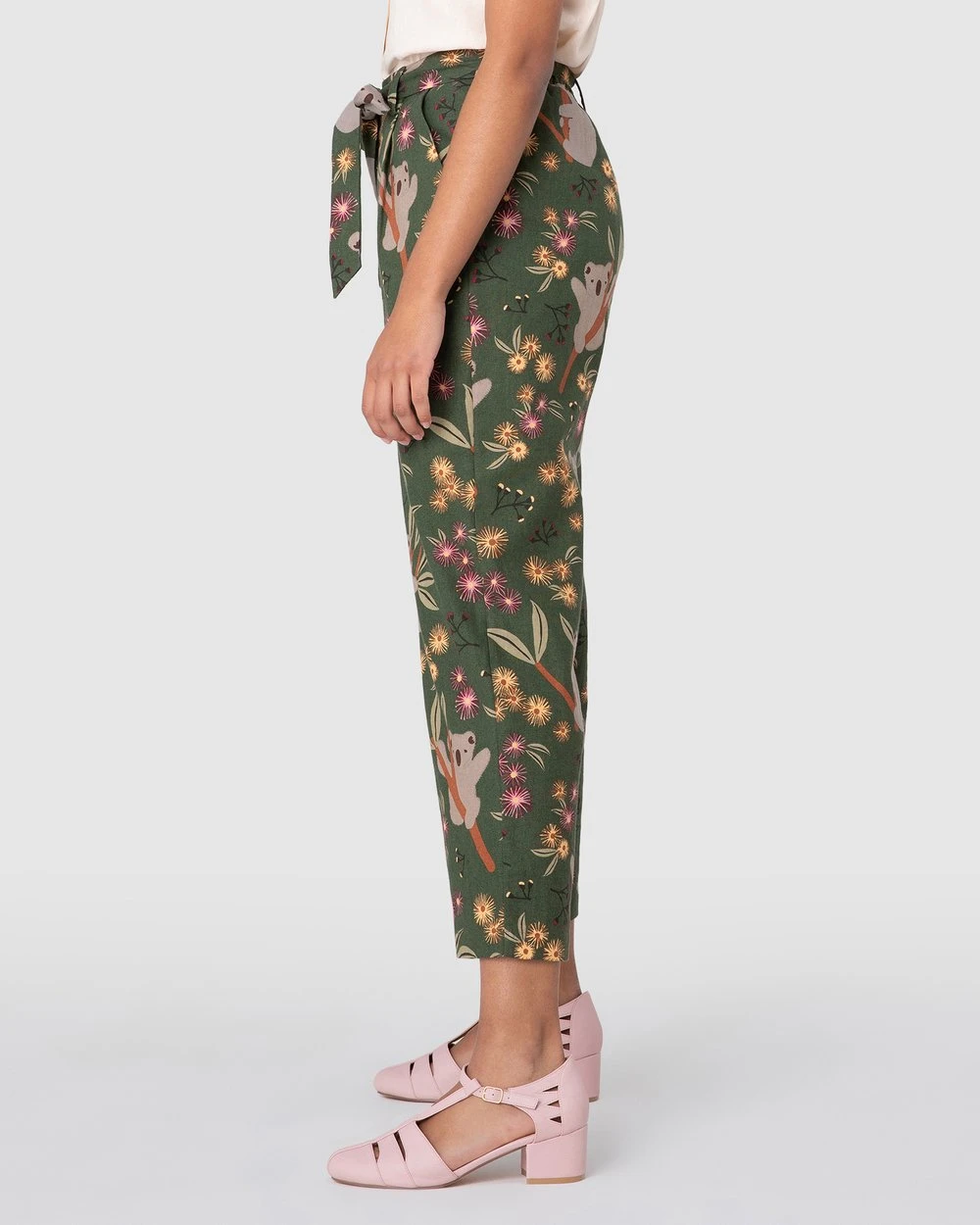 The Koala Pants by Princess Highway are high waisted koala printed pants. This pair of pants has a tapered leg cut, mid-weight linen cotton blend fabric, high-waisted rise, handy side pockets, an exclusive princess highway native flora and koalas print and an elasticated back waistband.