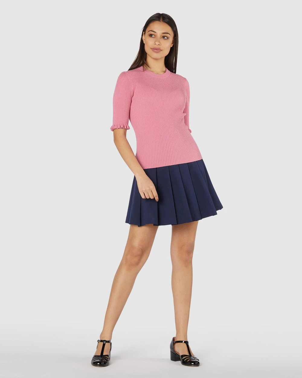 The Lexie Knit Top by Princess Highway is a ribbed knit top with frill edge sleeve. This top has soft viscose blend yarn, short sleeves, a round neckline, ribbed knit and frill edge sleeves.