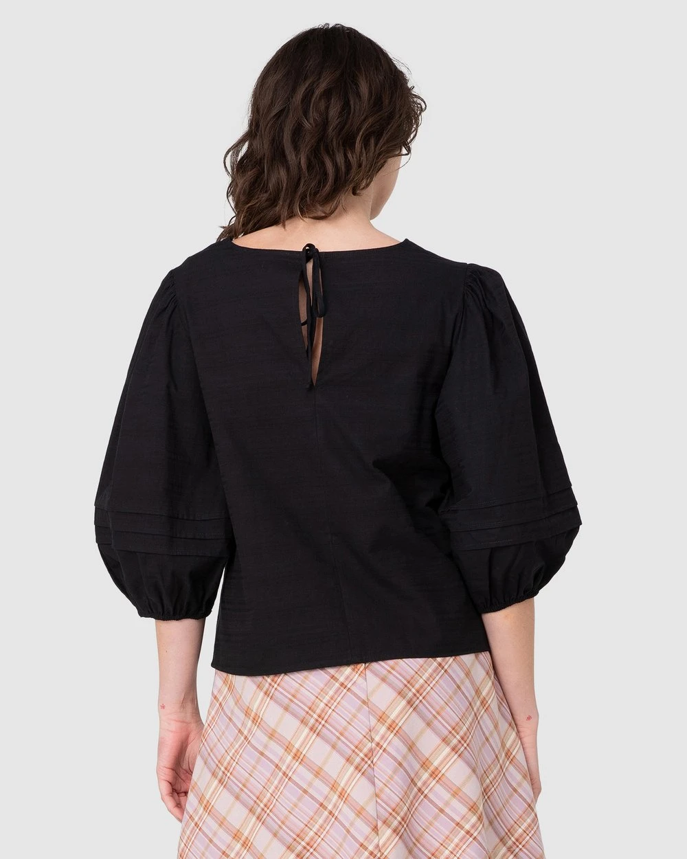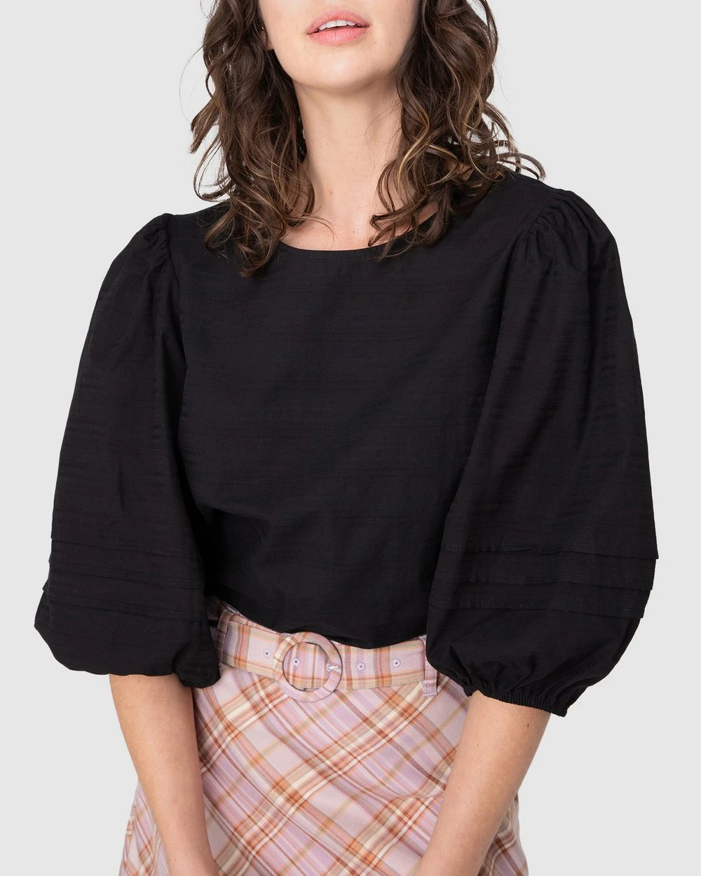 The Lorraine Top by Princess Highway is a balloon sleeve smock top. This top has a rounded neckline, pin tucks and elastic cuff on the sleeve hems, a back key hole with tie closure and 3/4 length balloon sleeves.