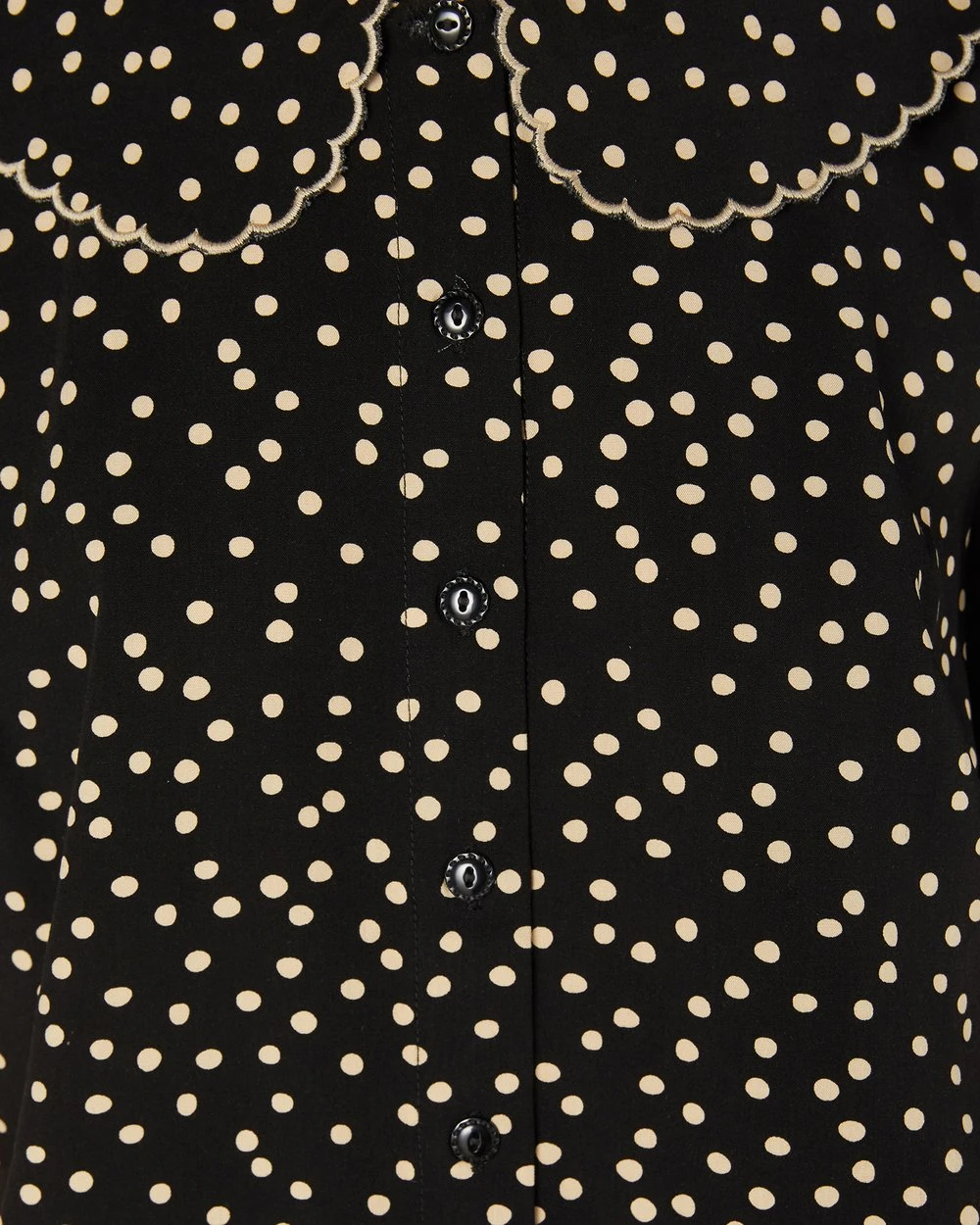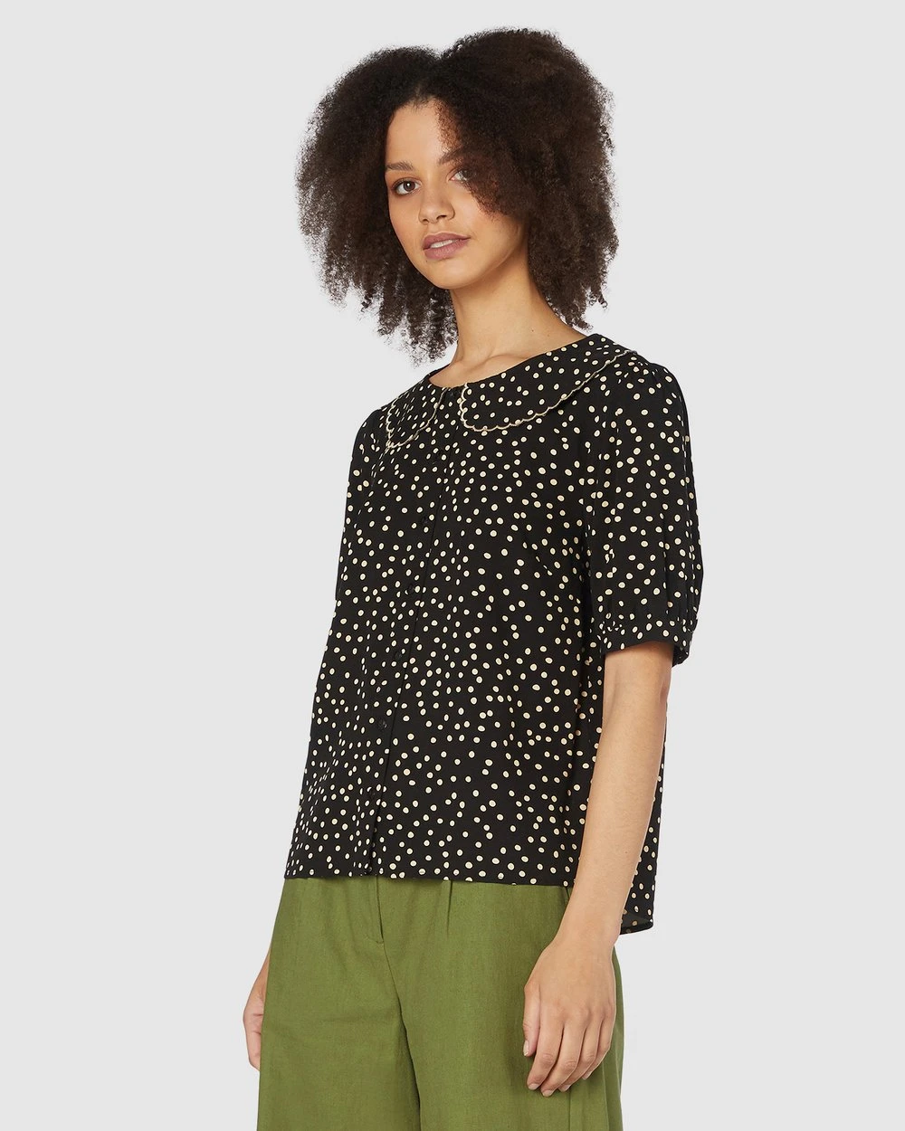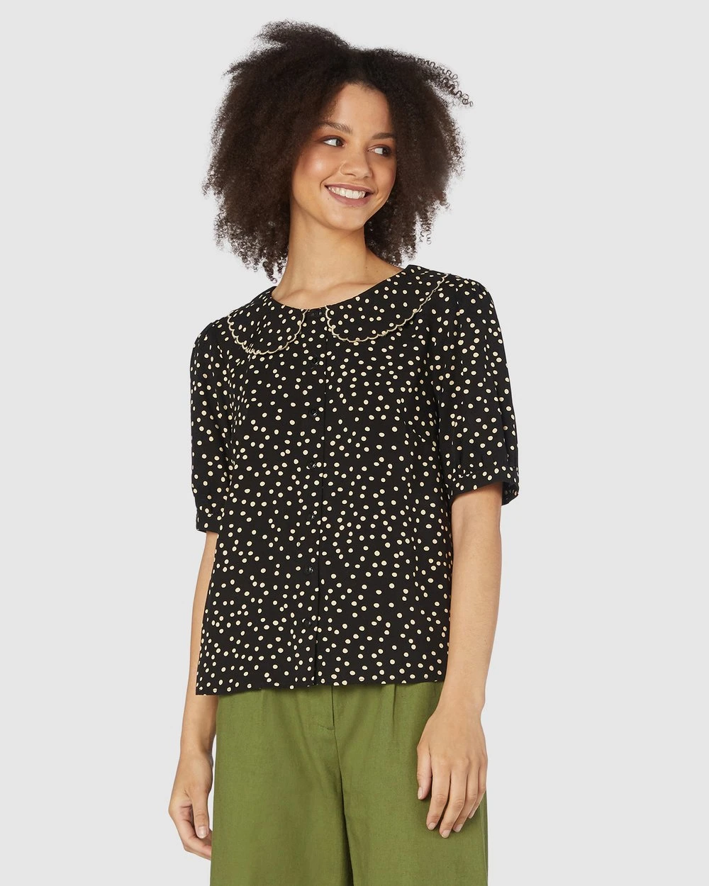 The Olivia Spot Blouse by Princess Highway is a peter pan collar polka dot blouse. This blouse has short cuffed sleeves, a round scalloped collar, light weight breezy viscose fabrication and buttons through front.
