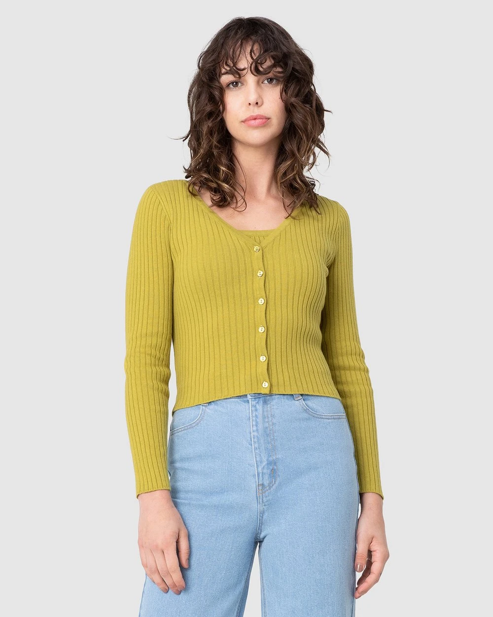 The Sophia Cardi by Princess Highway is a ribbed knit cardi. This cardigan has a v-neckline, soft organic cotton & nylon blend fabric, long sleeves and buttons through front.