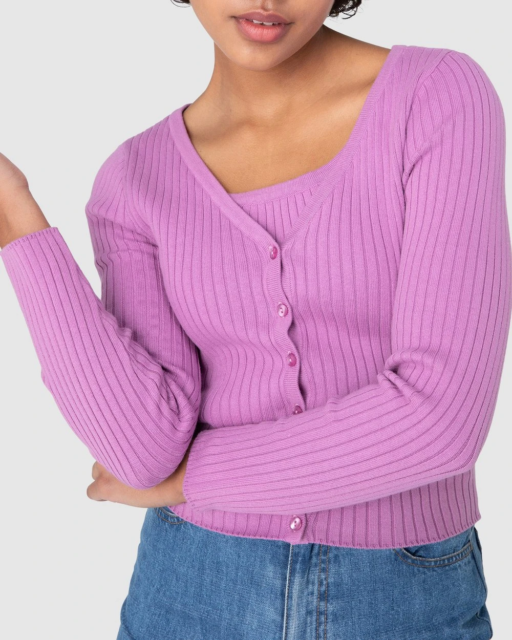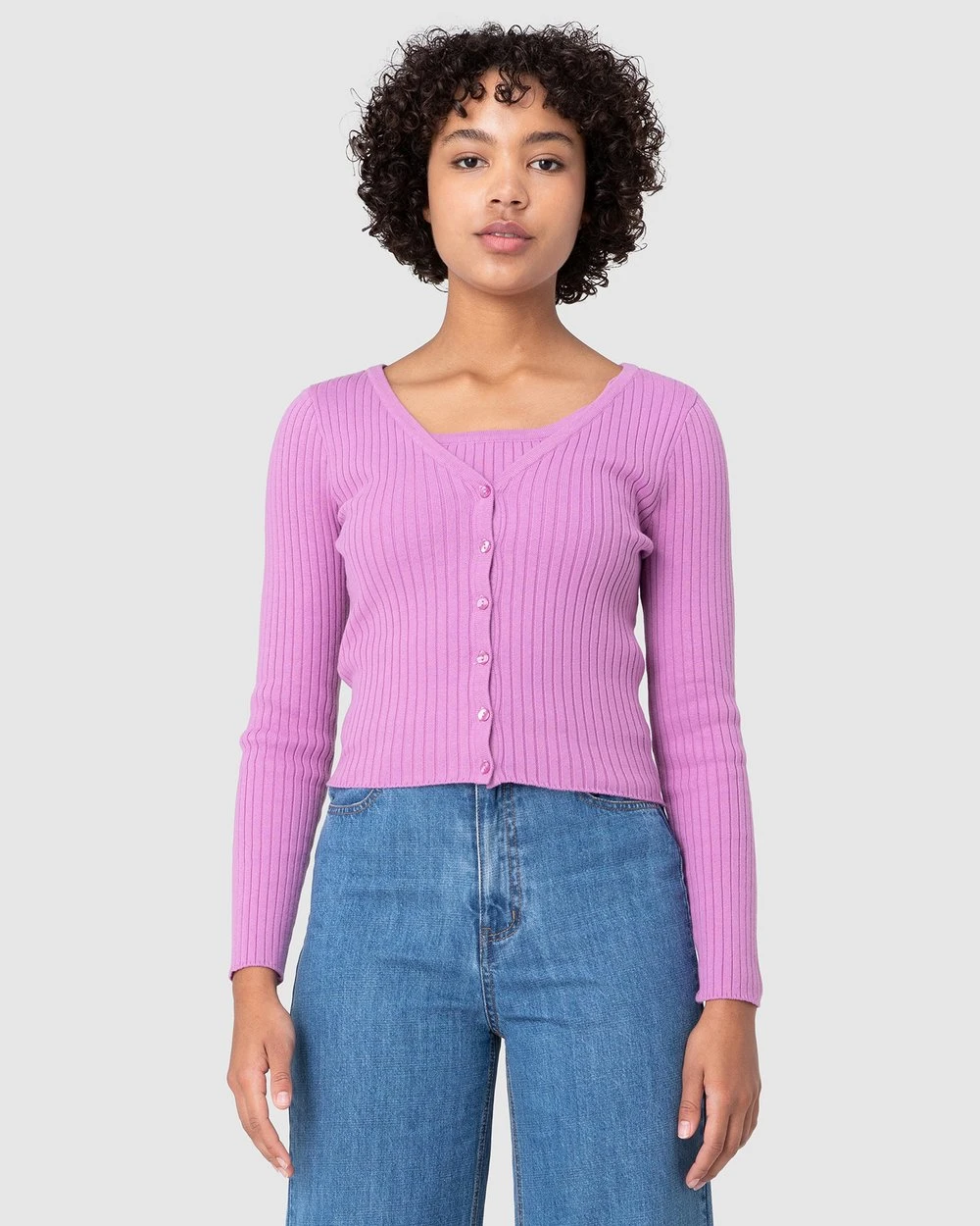 The Sophia Cardi by Princess Highway is a ribbed knit cardi. This cardigan has a v-neckline, soft organic cotton & nylon blend fabric, long sleeves and buttons through front.