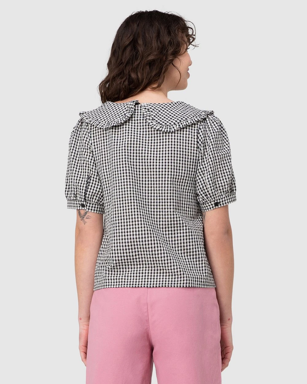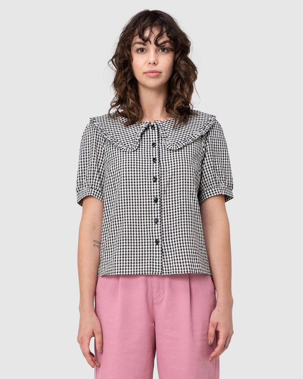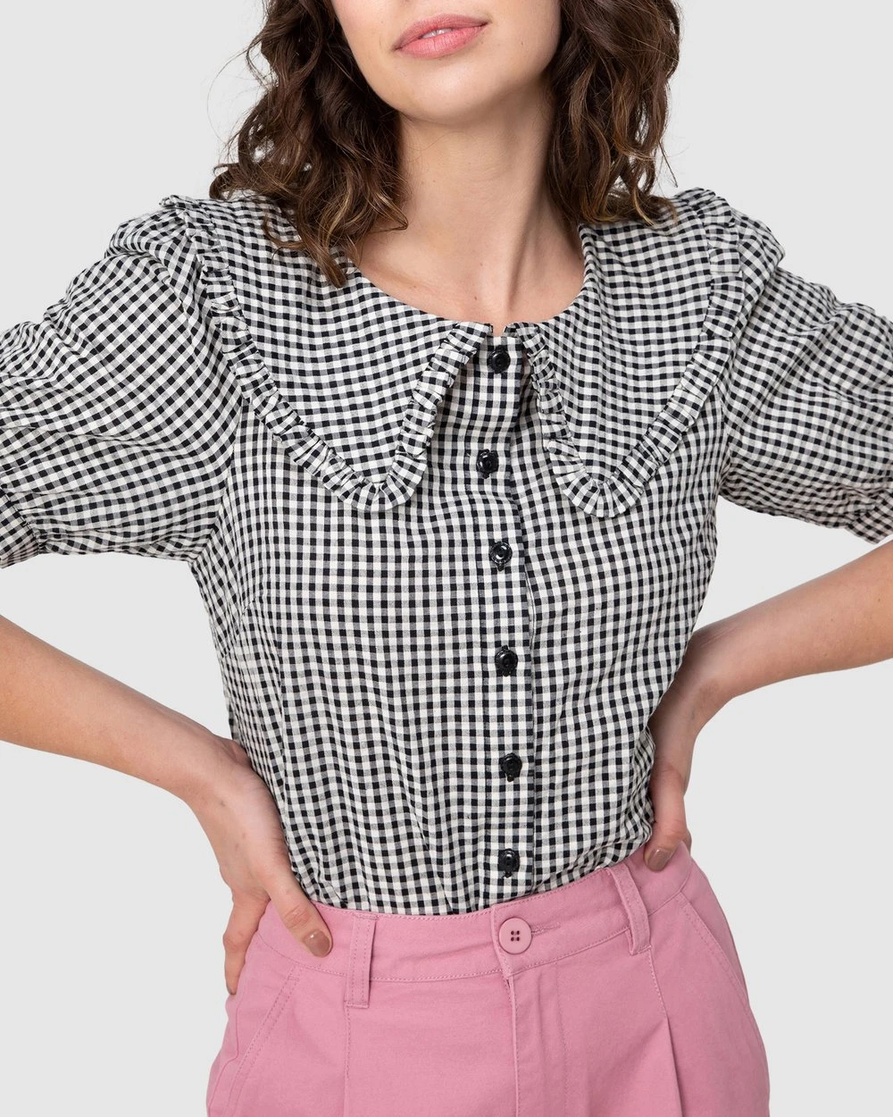 The Tallulah Blouse by Princess Highway is a large collar gingham blouse. This blouse has stylish gingham print, short puff sleeves with cuffed hems, a large collar with frill edging, buttons through front and 100% cotton seersucker fabric.