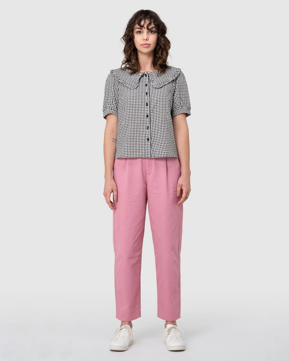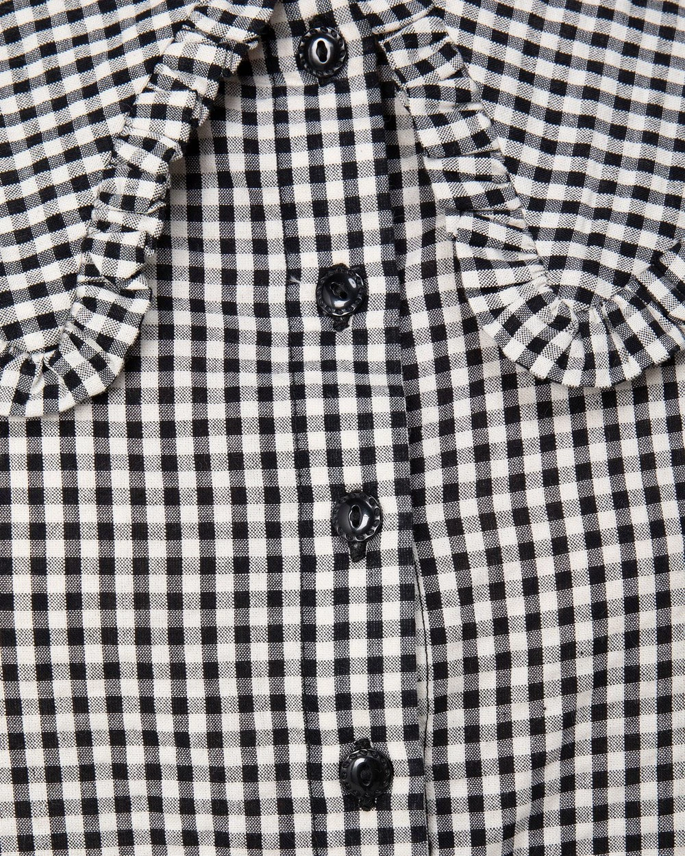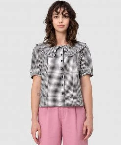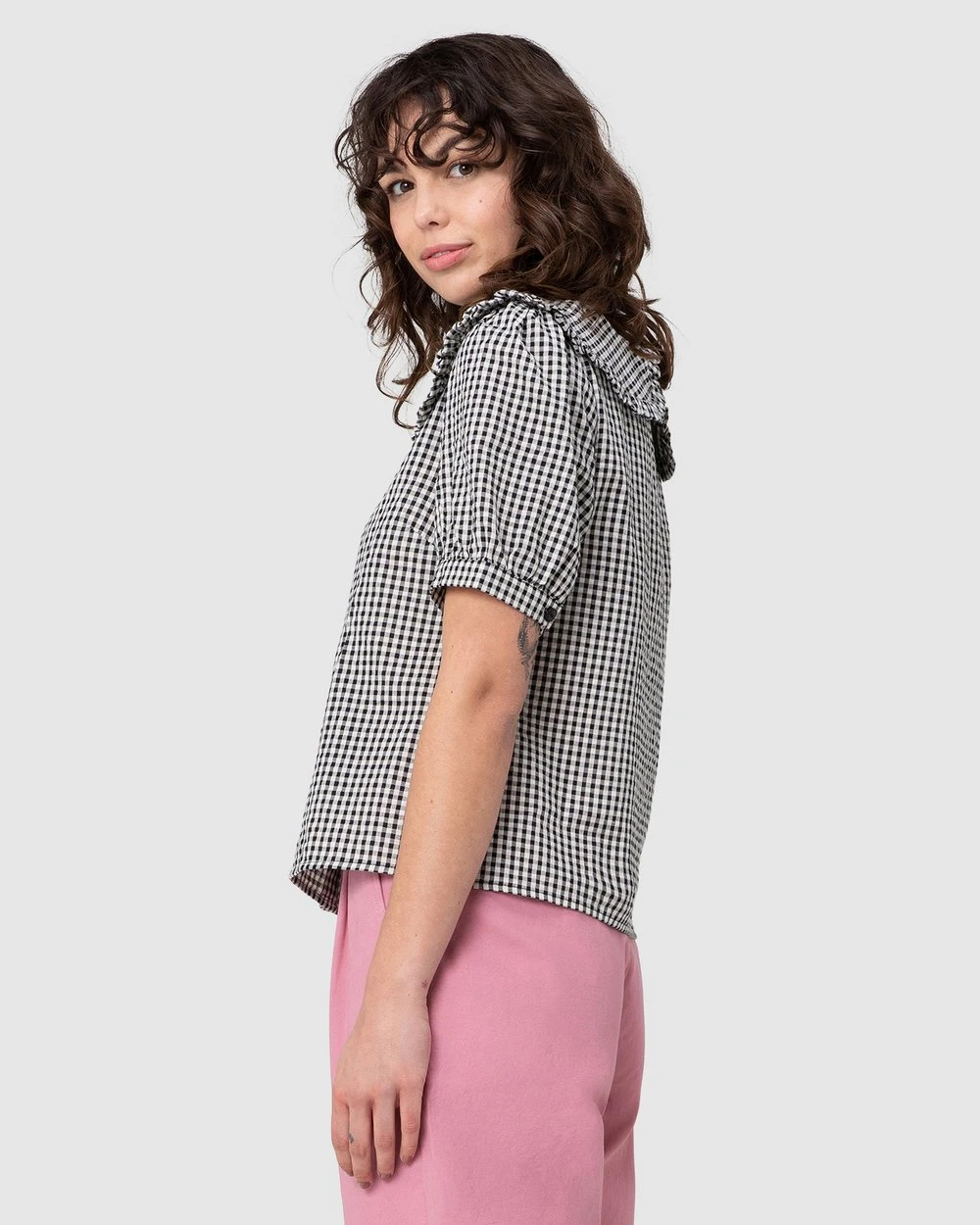 The Tallulah Blouse by Princess Highway is a large collar gingham blouse. This blouse has stylish gingham print, short puff sleeves with cuffed hems, a large collar with frill edging, buttons through front and 100% cotton seersucker fabric.