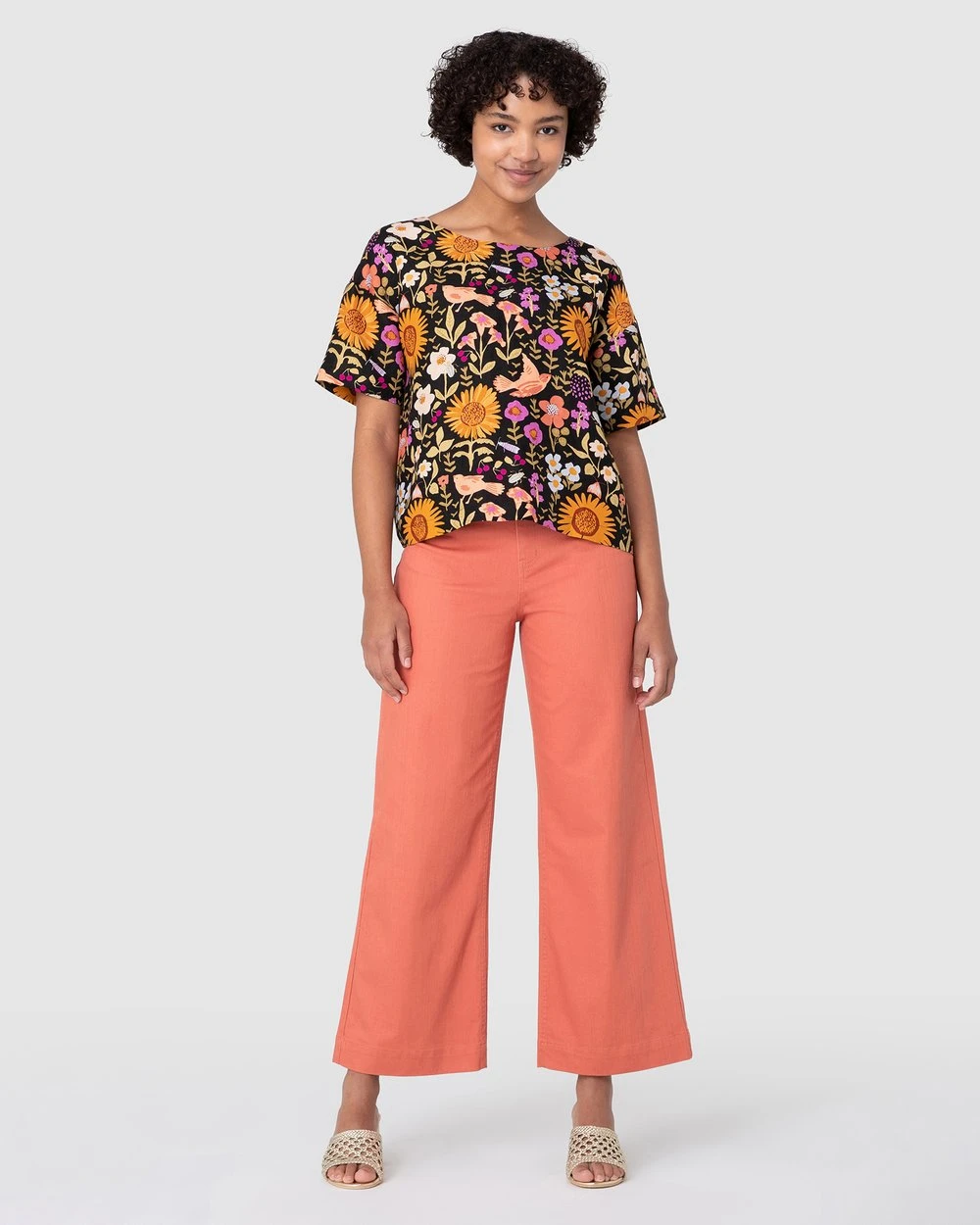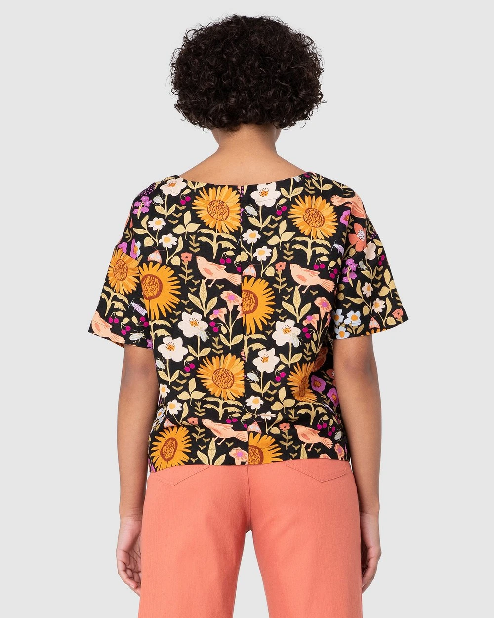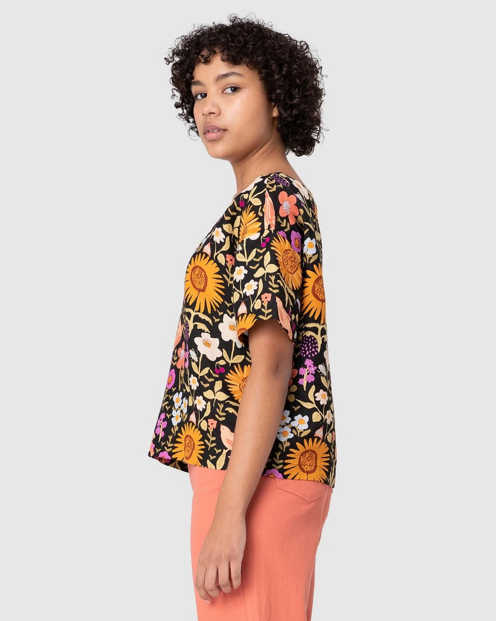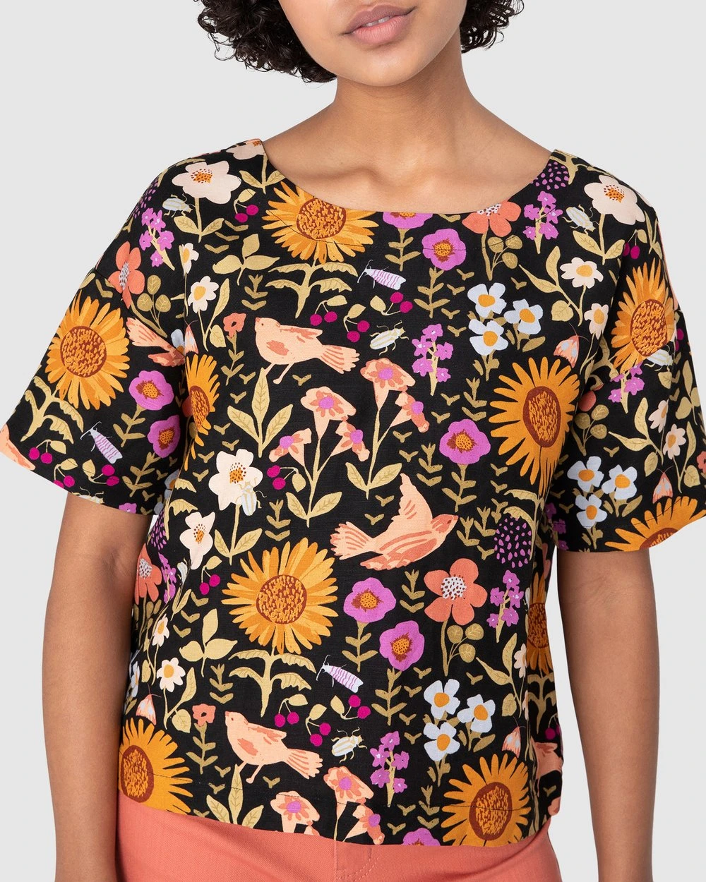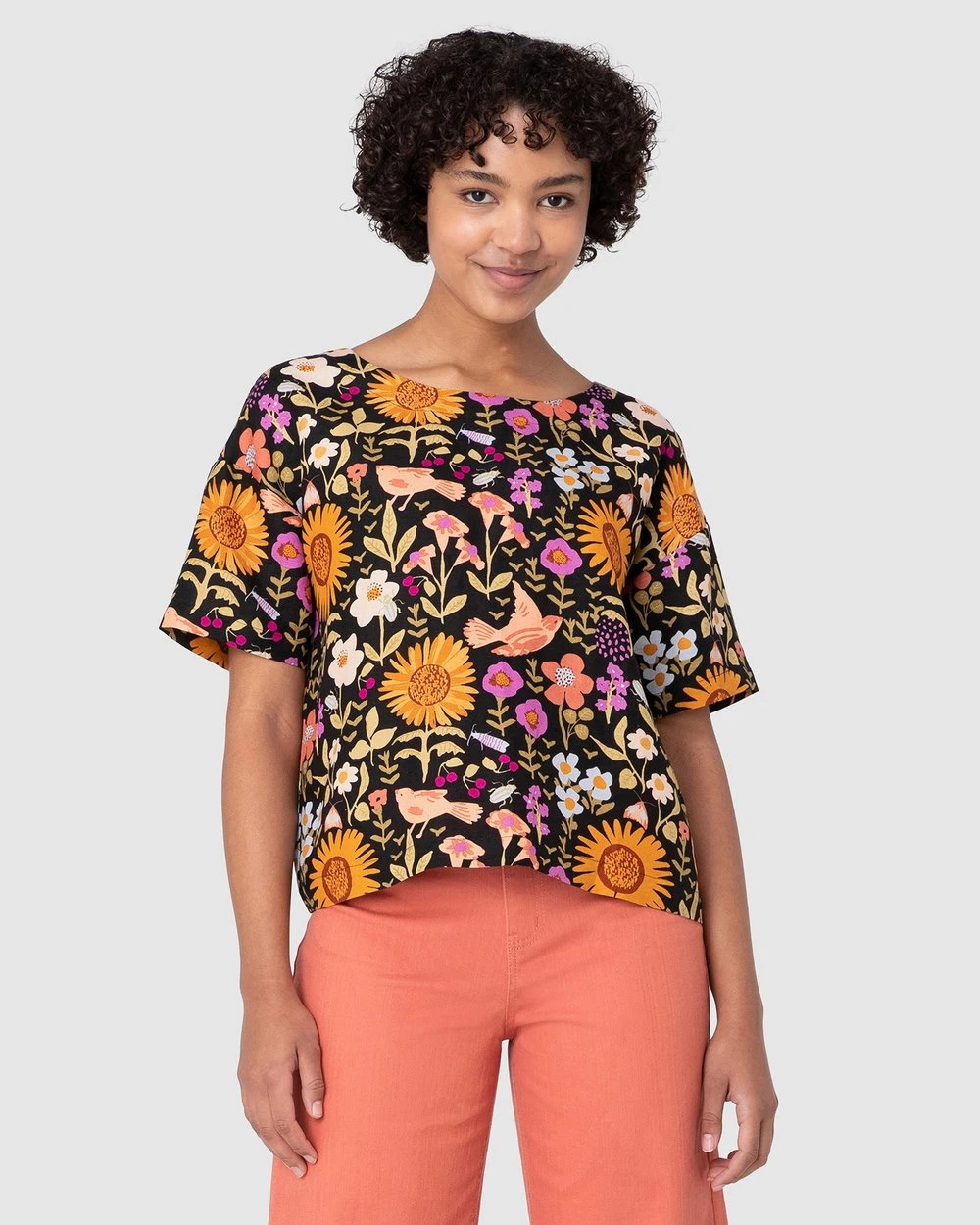 The Wild Garden Top by Princess Highway is a drop shoulder boxy top. This top has wide short sleeves, softened linen viscose blend fabric, a round neckline, exclusive princess highway delightful wild garden print and dropped shoulder style.