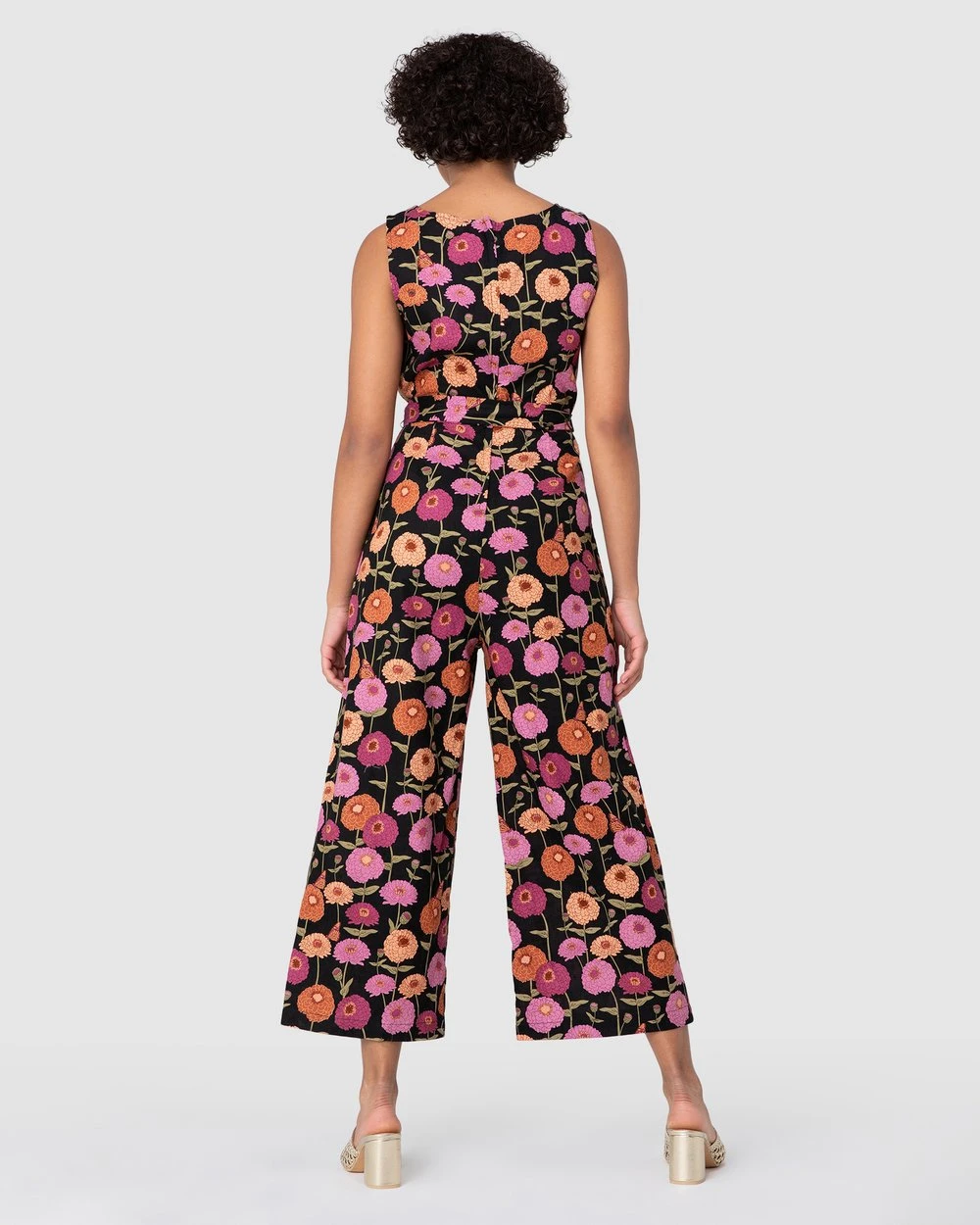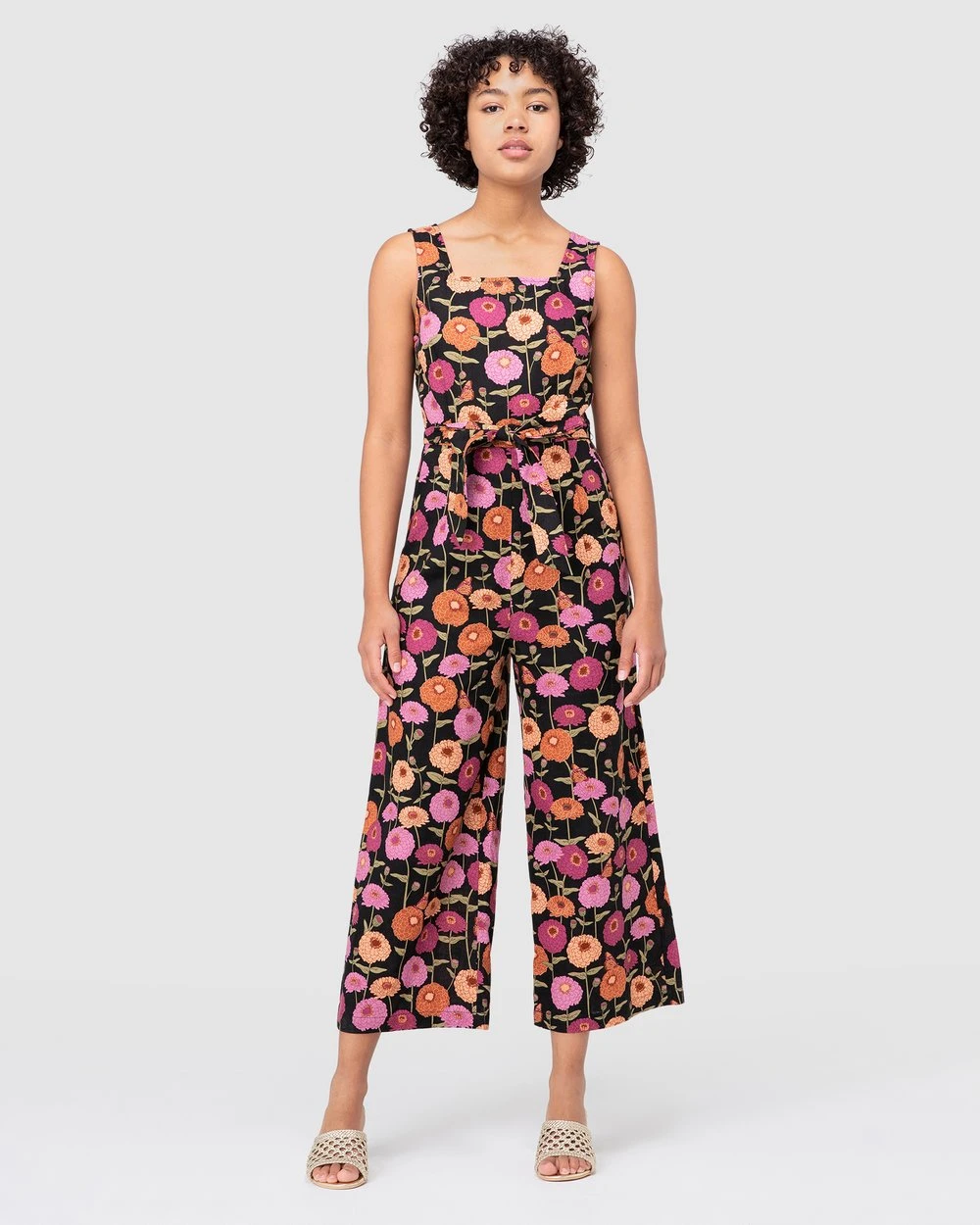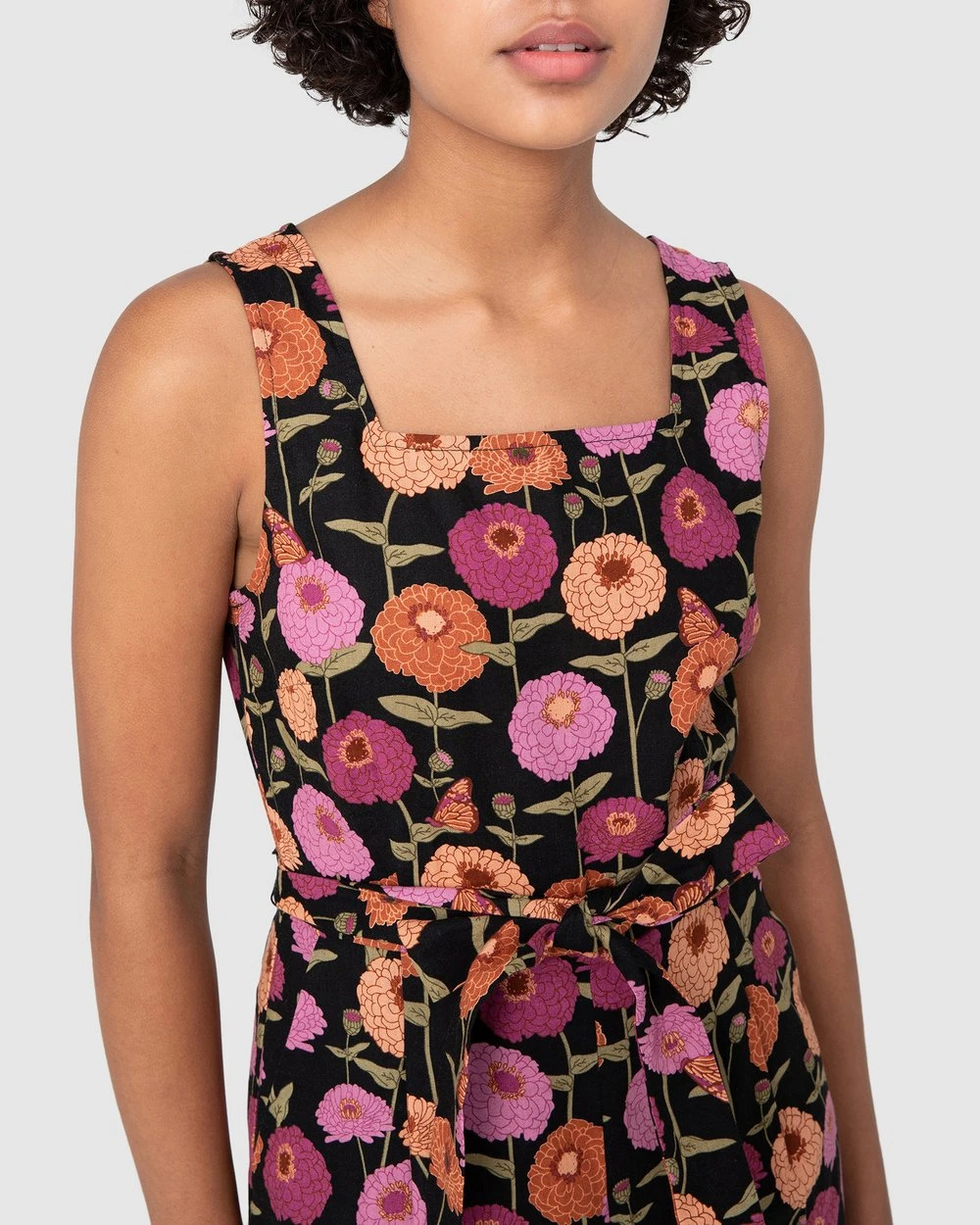 The Zinnia & The Butterfly Jumpsuit by Princess Highway is a floral print jumpsuit. This jumpsuit has a wide leg cut, square neckline, softened linen cotton blend fabric, sleeveless style, hidden back zip and an exclusive princess highway zinnia’s and dainty butterflies print.