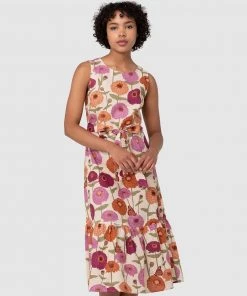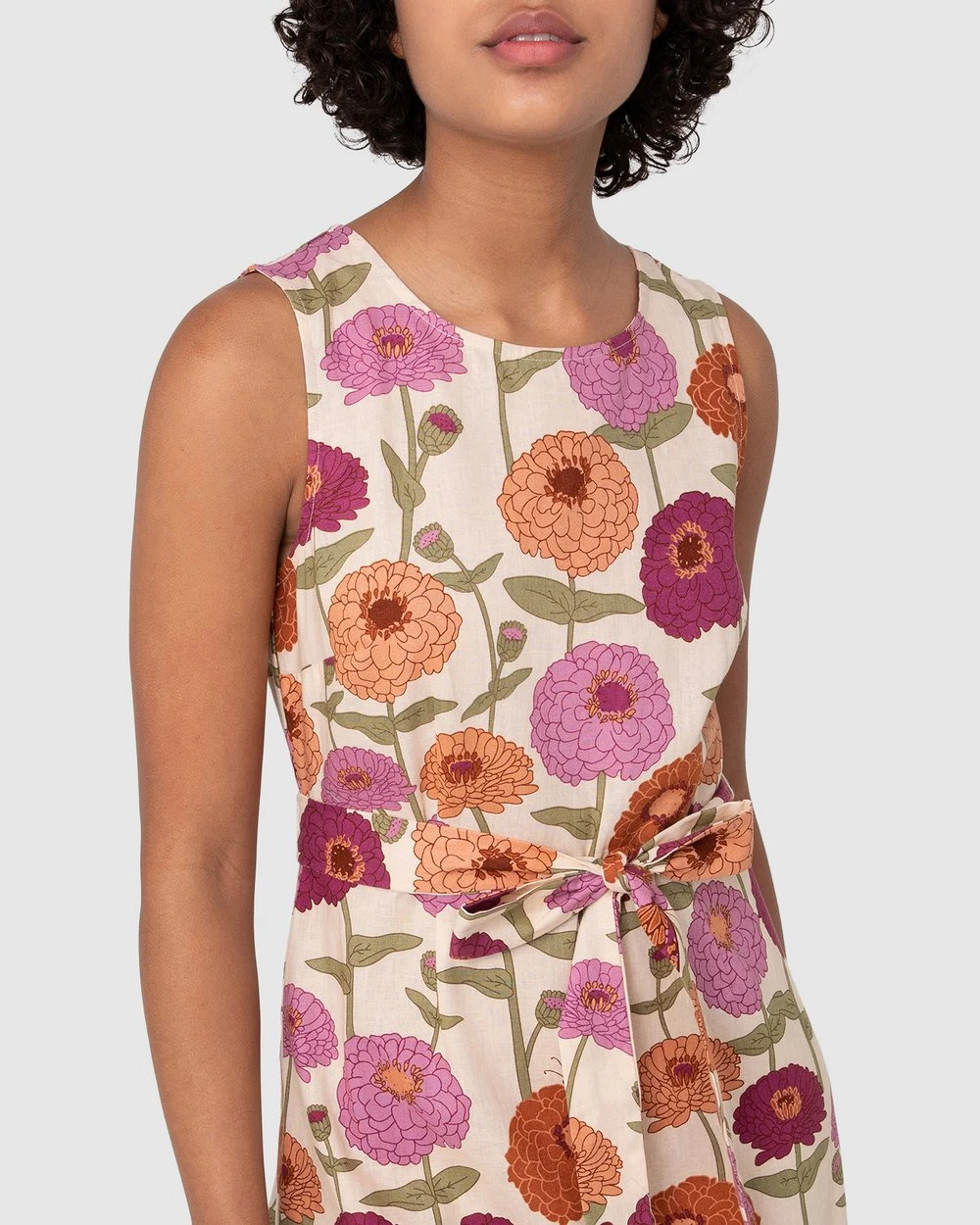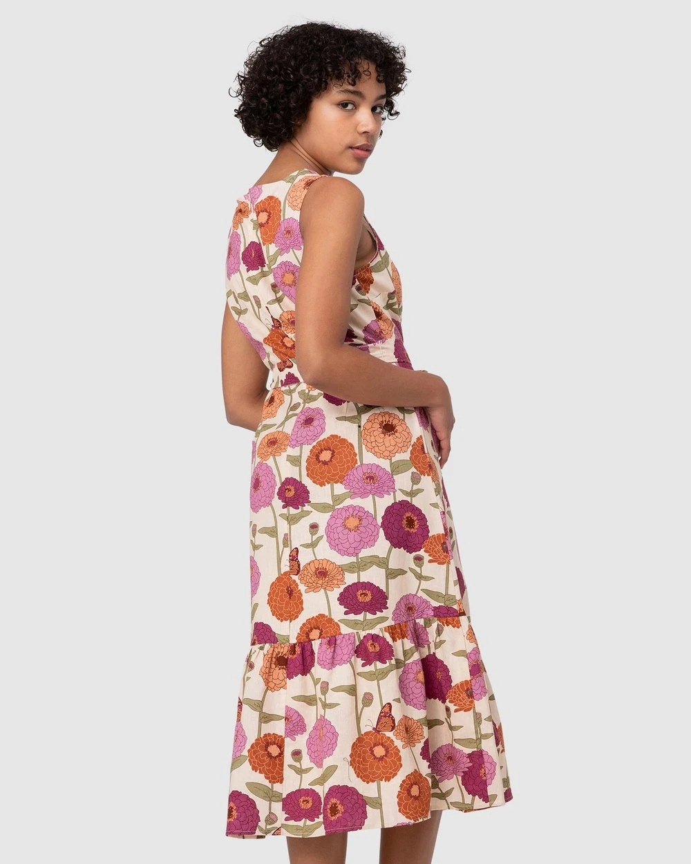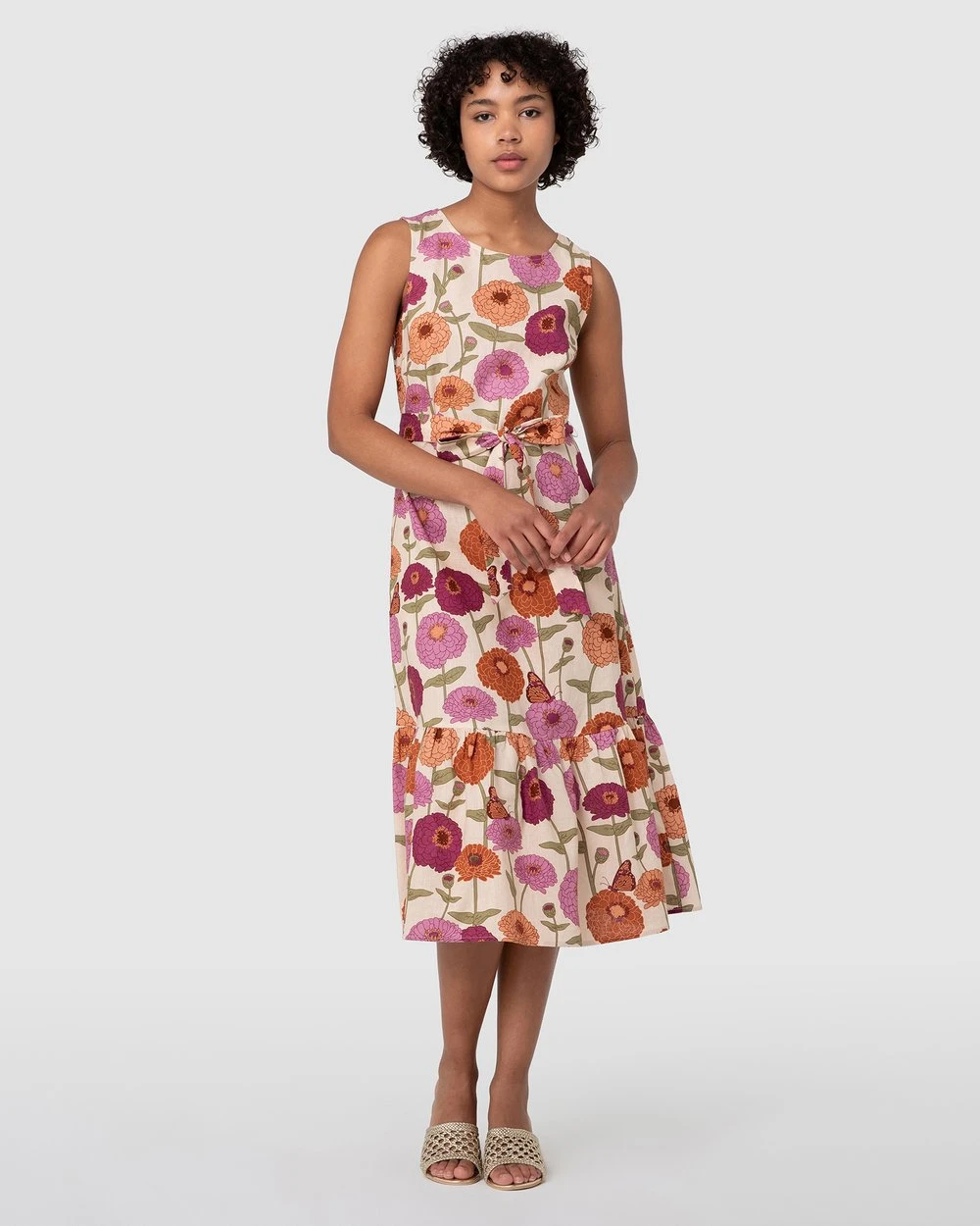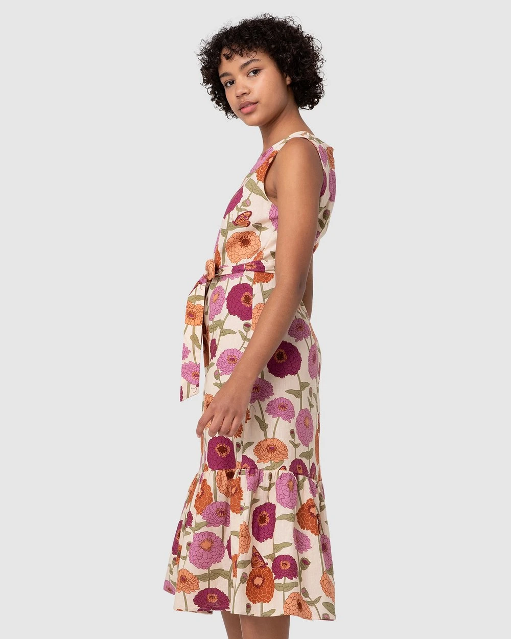 The Zinnia & The Butterfly Midi Dress by Princess Highway is a sleeveless mid length floral dress. This dress has softened linen cotton blend fabric, a sleeveless bodice, hidden back zipper, exclusive princess highway zinnia’s and dainty butterflies print and an a-line skirt with a deep ruffle hem.