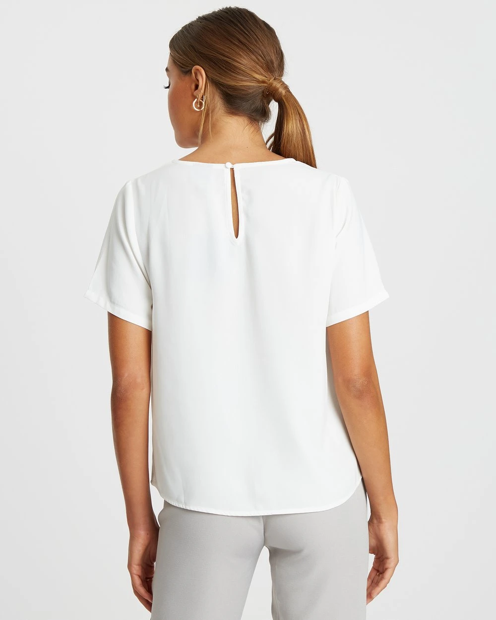 – Length: 60cm- White hue- Regular fit – V Neckline- Short sleeves- Back keyhole design