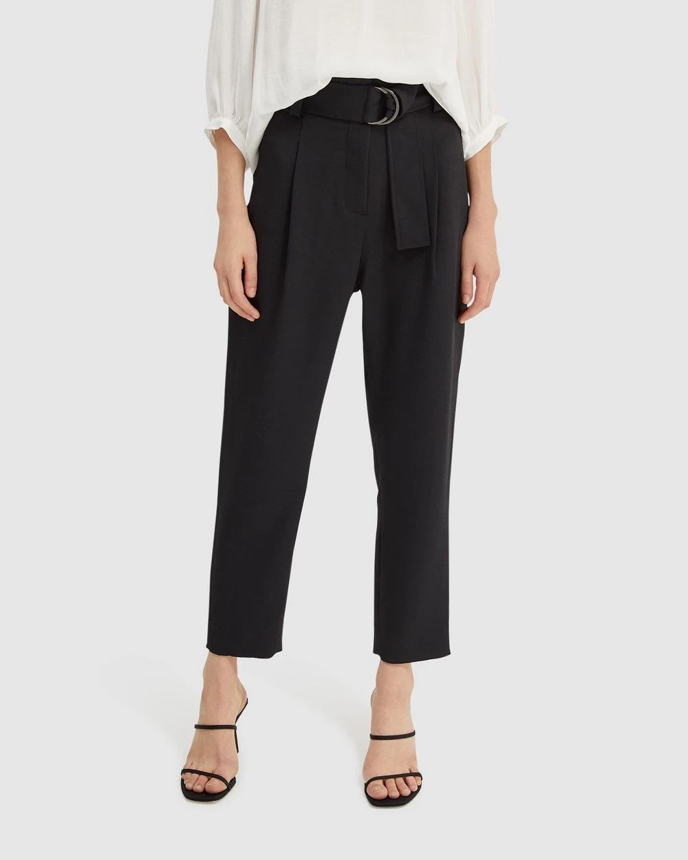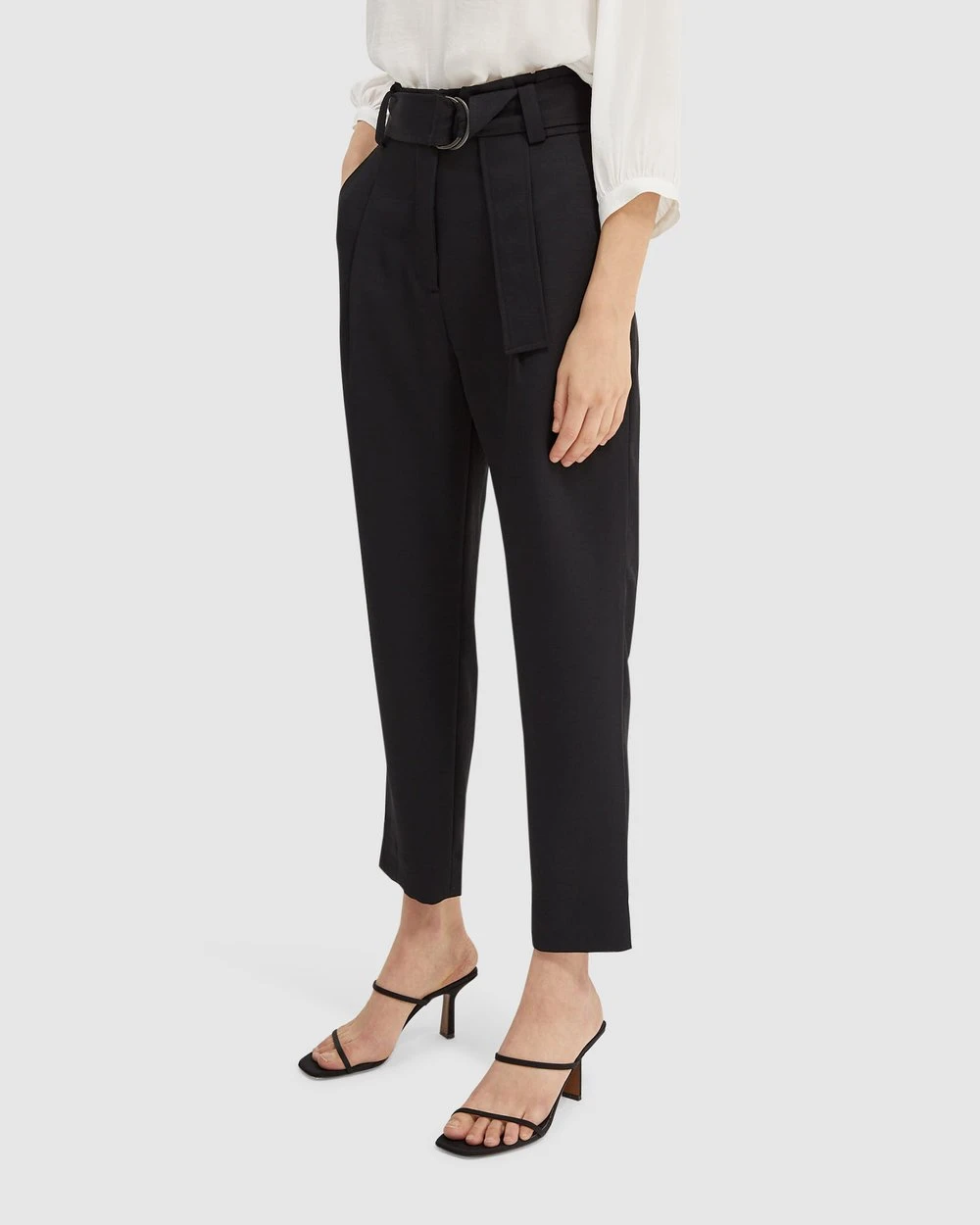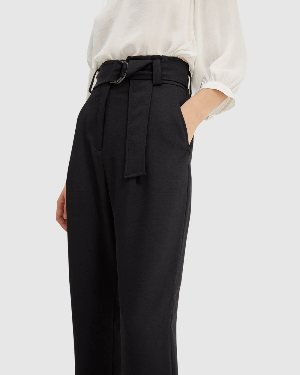 – Belt-looped waistband; detachable self D-ring belt
