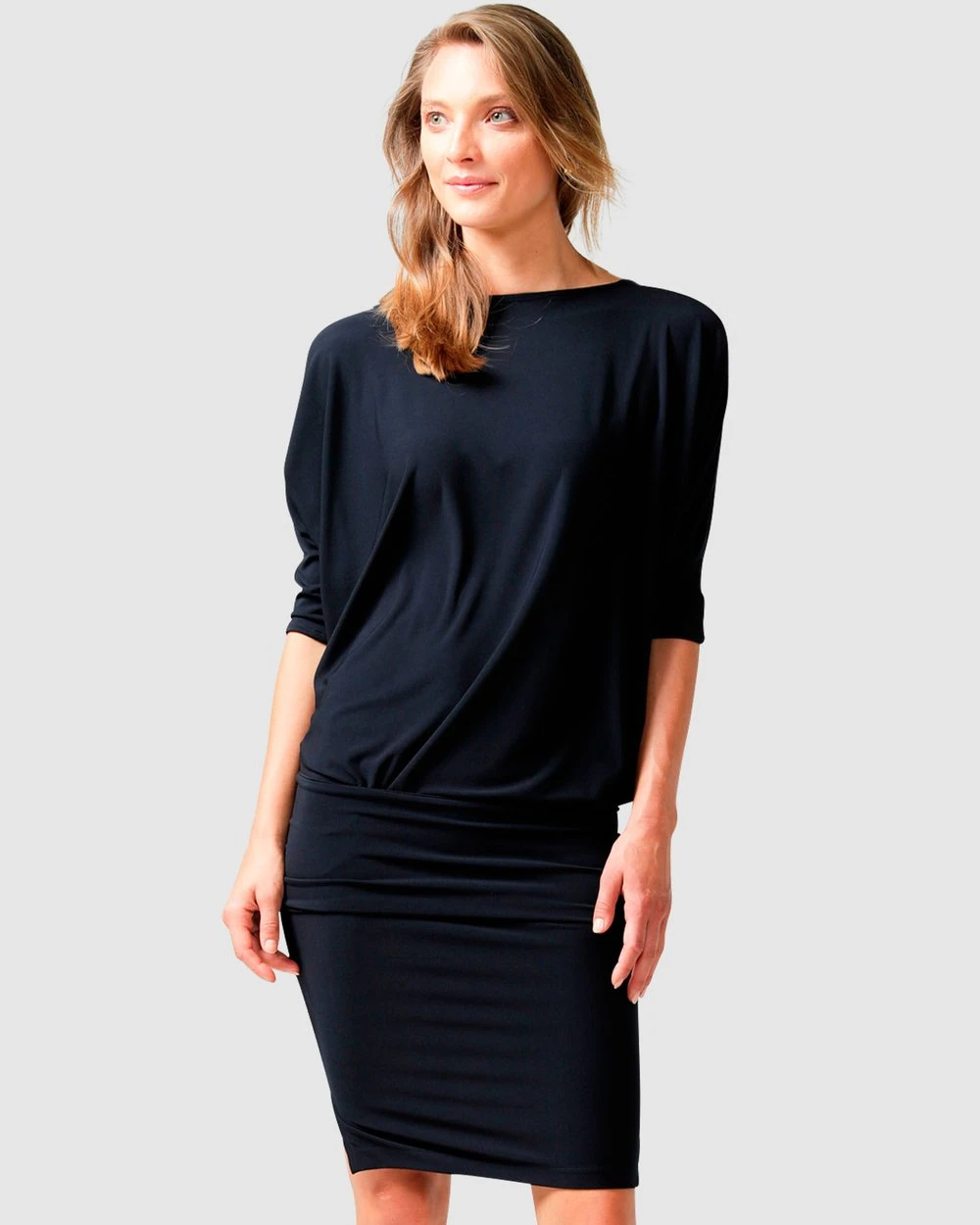 Update your wardrobe with this effortless, chic and wearable Batwing Dress by Australian Designer SACHA DRAKE. Crafted from a premium stretch jersey fabrication, this style offers a reversible design that can be worn either Boat-neck or V-neck, depending on your individual style and 3/4 sleeves for added arm coverage. It also features a pencil skirt silhouette with a loose-fit top and comes with a tube belt that sits on your hip to help you achieve your favourite shape.