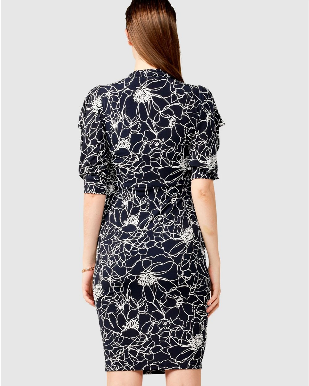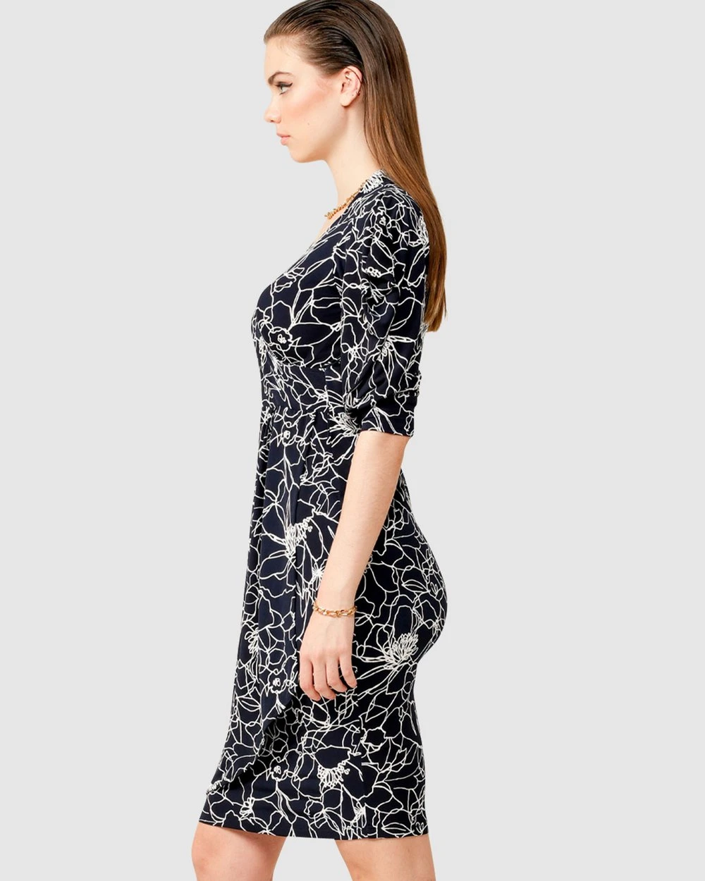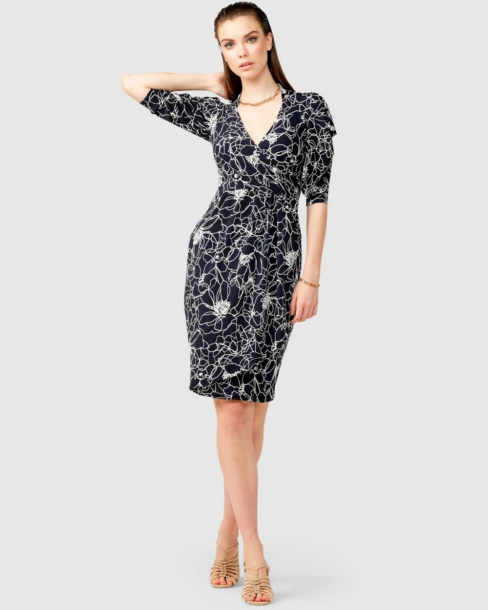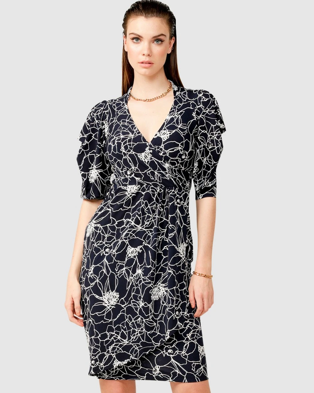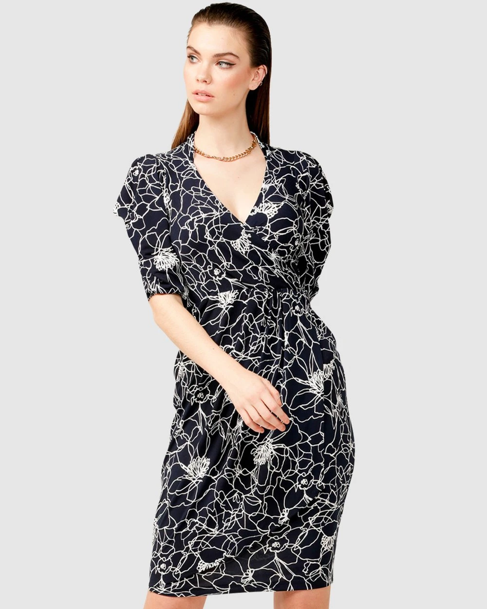 The Coltrane Faux Wrap Dress by Australian Designer SACHA DRAKE is worked in a sophisticated navy white flower puff print and cut to a figure hugging silhouette. Made from premium stretch jersey fabrication, this dress features an ultra feminine style with 3/4 sleeves that showcase a draped shoulder and a faux wrap style to create an hourglass figure.
