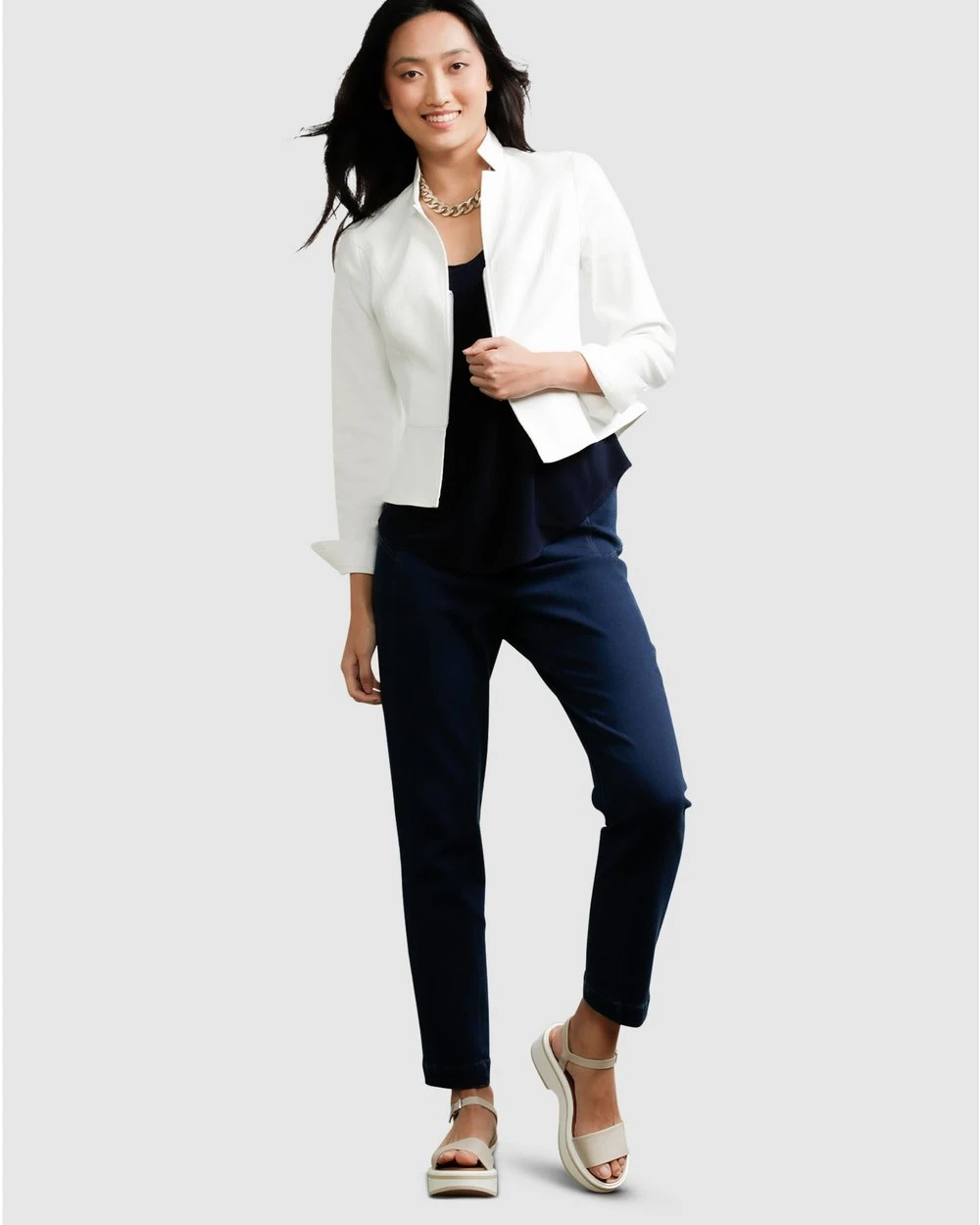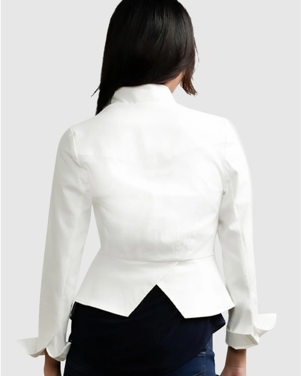Our model is wearing a size AU 8 jacket. She usually takes a standard AU 8/Small, her height is 5’11″ (180cm) tall, has a 79cm bust, 89cm hips and a 61cm waist.
