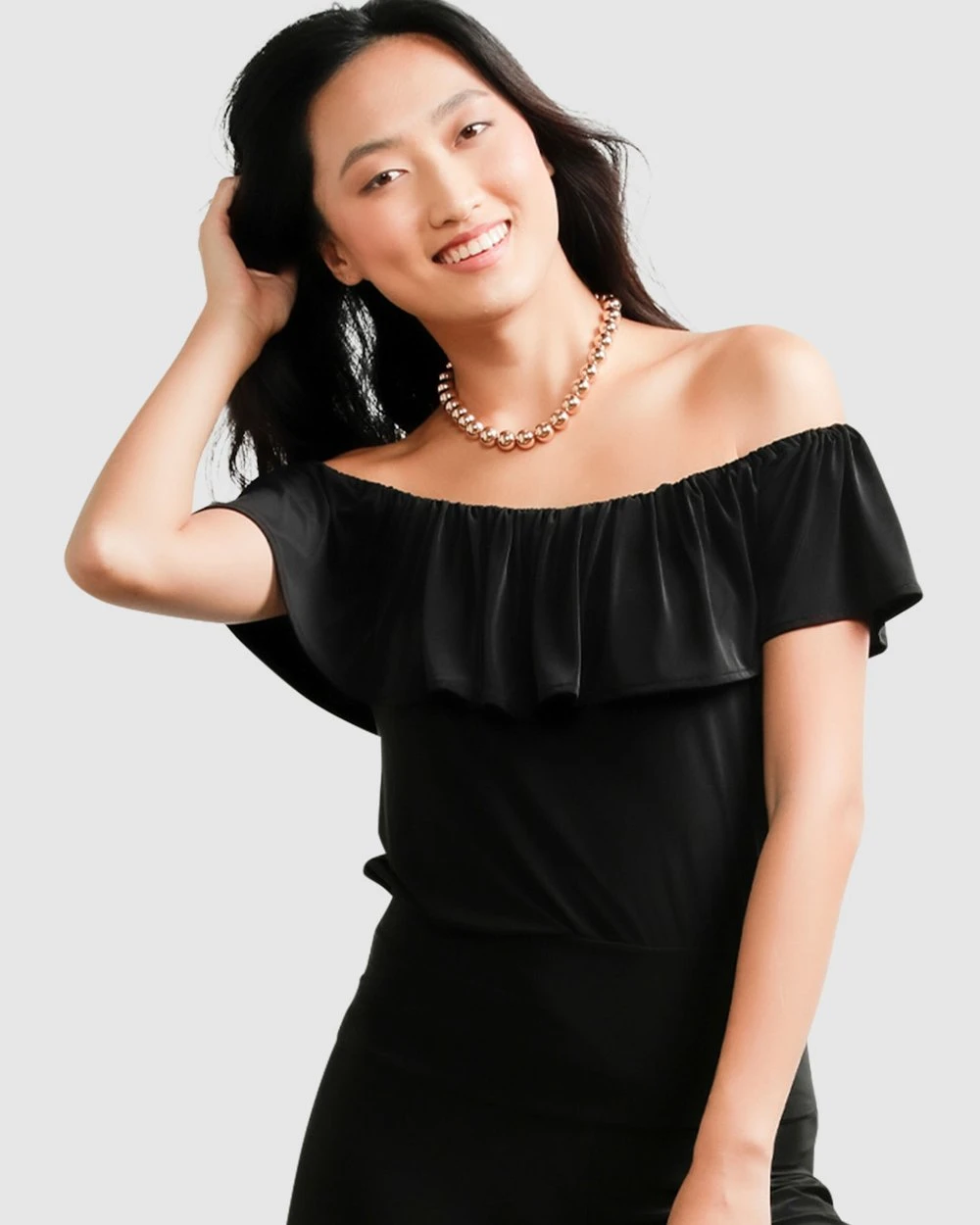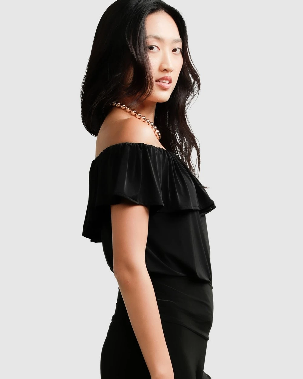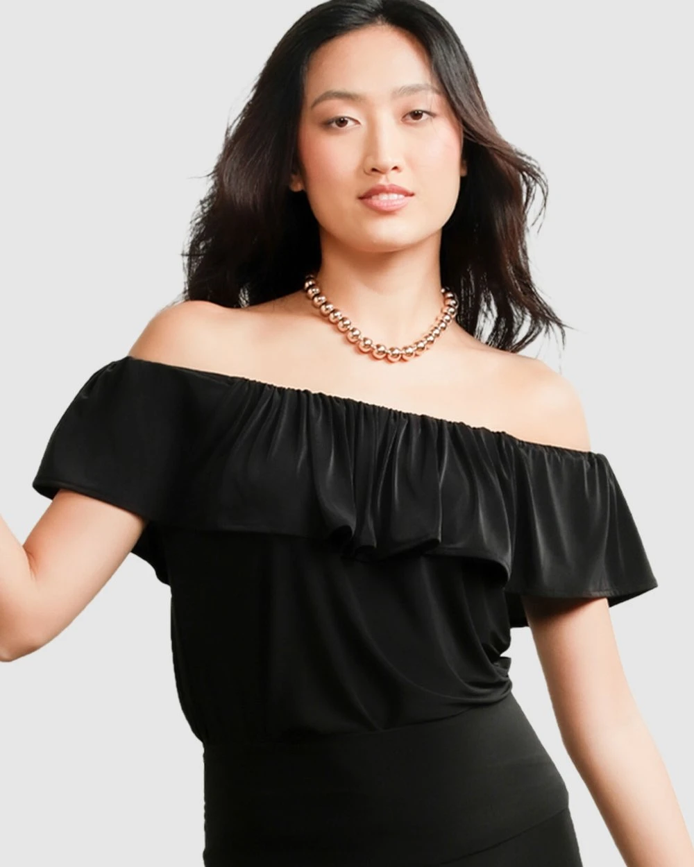 The Off-Shoulder Frill Top, by Australian Designer SACHA DRAKE, is a celebration of all things versatile and feminine. Crafted from premium stretch jersey fabrication, this style features a frill off-shoulder cut which can be worn as a boatneck alternative for a bra friendly fit and feel.