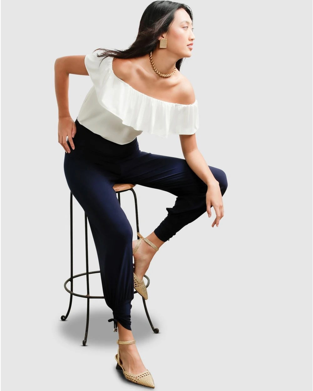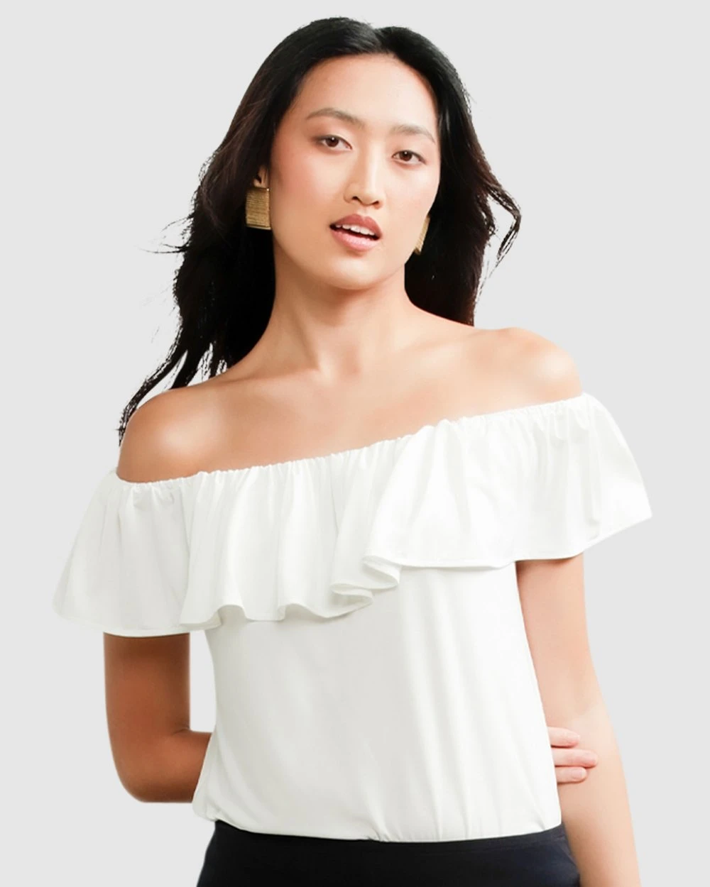 The Off-Shoulder Frill Top, by Australian Designer SACHA DRAKE, is a celebration of all things versatile and feminine. Crafted from premium stretch jersey fabrication, this style features a frill off-shoulder cut which can be worn as a boatneck alternative for a bra friendly fit and feel.