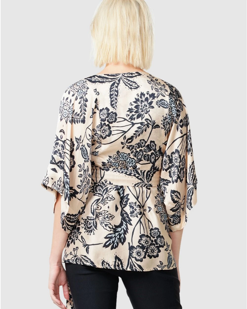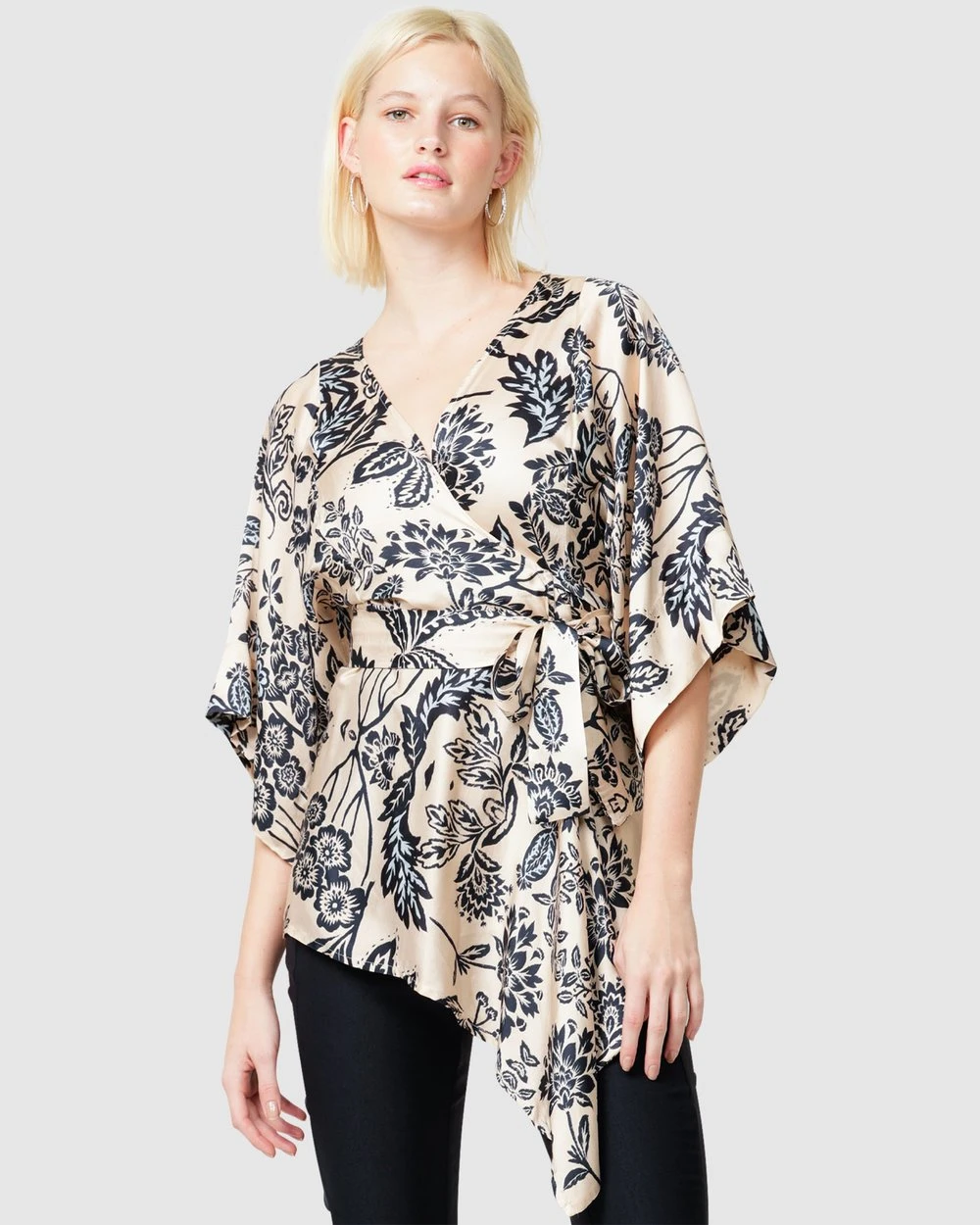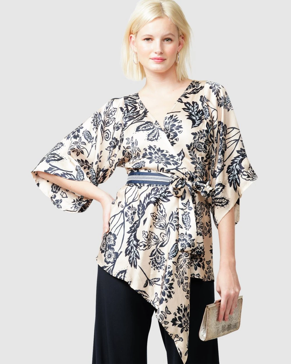 The Sea of Time Kimono by Australian Designer SACHA DRAKE is cut in a timeless design that will take you from desk to dinner in style. This top features a wrap design that flatters all shapes – simply wrap around the body to create a streamlined hourglass shape with a V-neck. This style also features a 3/4 sleeve for added arm coverage and an asymmetrical hem that adds a longer line through the body.