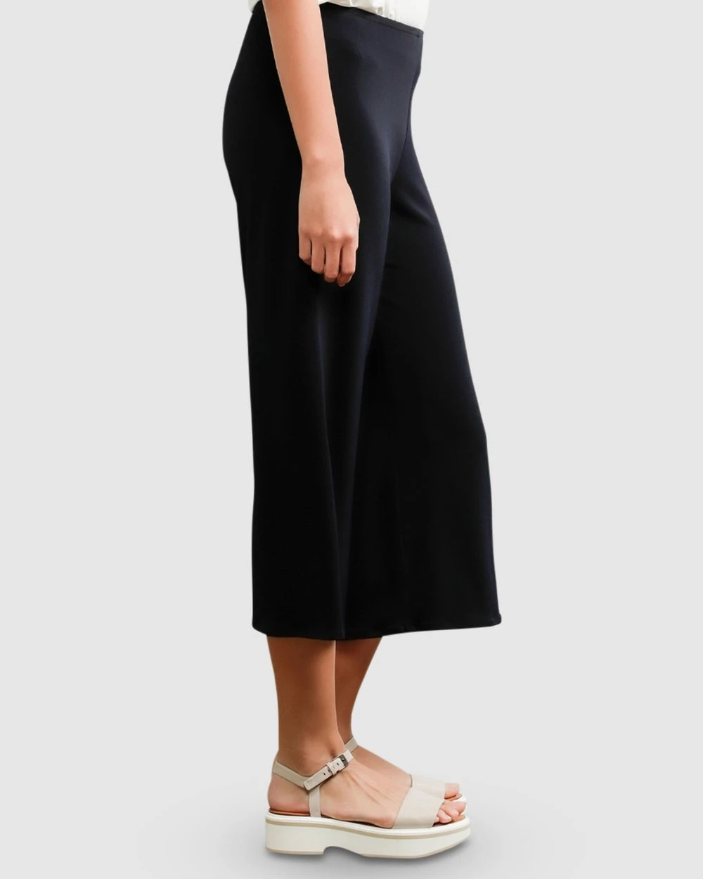 Comfort and style intertwine with the Seamless Culotte by Australian Designer SACHA DRAKE. The relaxed fit and no side seams give these pants an effortless look. The wide legs flare out into an A-line shape which creates flare and balances out the hips. The cropped midi length will sit below the knee but above the ankle. This fluid pair is cut in a flattering silhouette and the premium stretch jersey fabric is easy care, easy wear, with no ironing required! Easy to dress up with a pair of heels or dressed down for the weekend or travel with a tee and some flats! You can also mix and match with a variety of tops such as the Analia Top (Navy) for a relaxed look.
