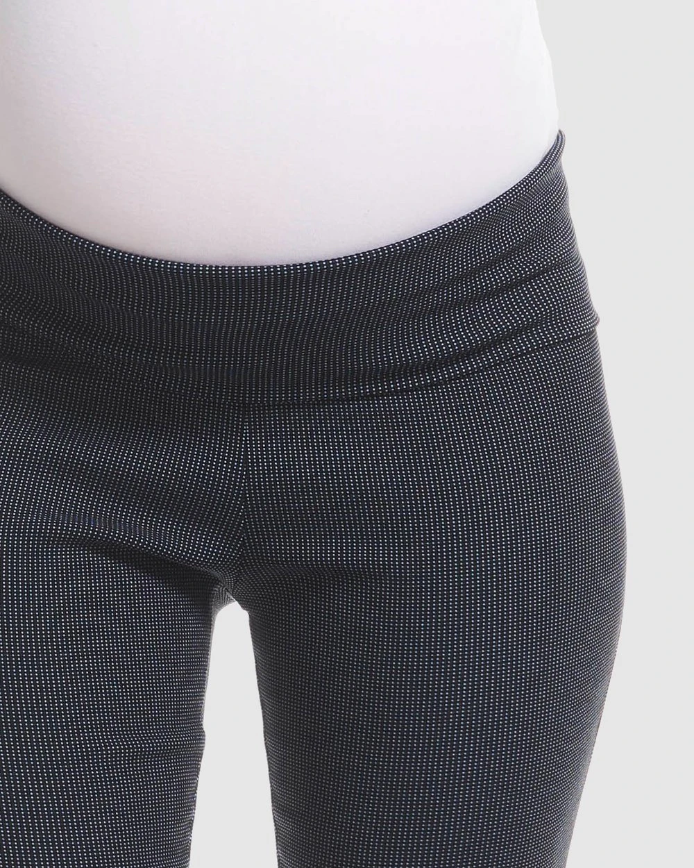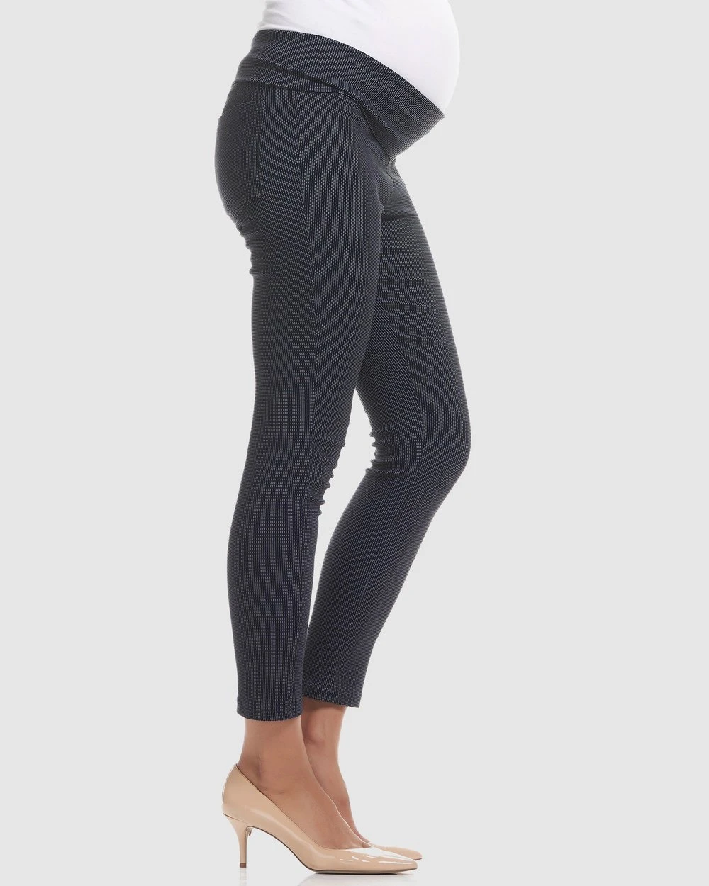 The Dot Print Crop Maternity Pants is new addition from Soon Maternity. It will be one of the essential pieces to your maternity wardrobe and a great ideal for a corporate outfit. Crafted in an incredibly comfortable 4-way stretch fabric that will wash and wear throughout your pregnancy and beyond. Featuring a skinny leg with crop length and the over belly waistband allows you to feel comfortable and secure but this also can be worn folded down below the bump.