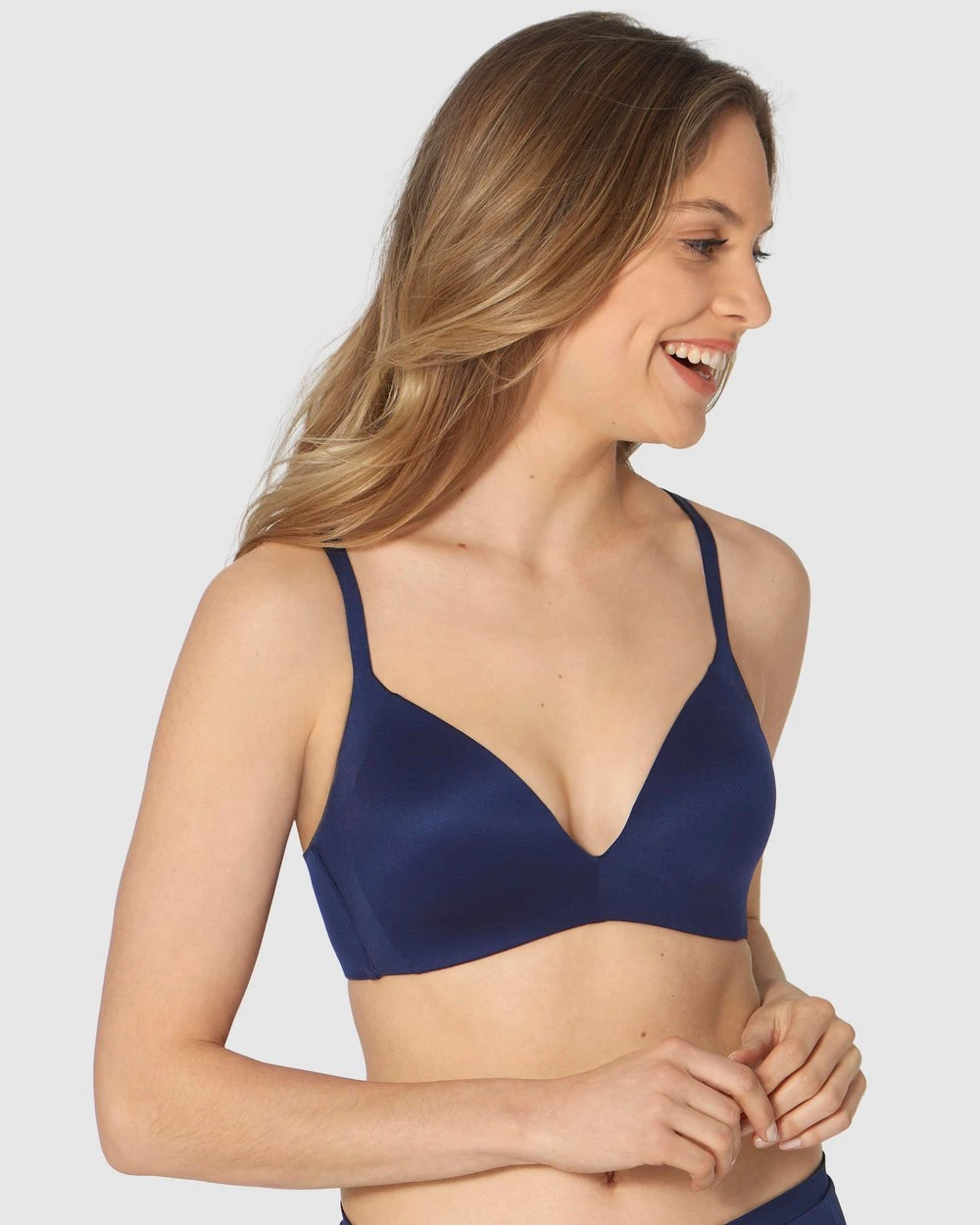 – Wirefee bra with navy, padded cups for a defined, natural bust