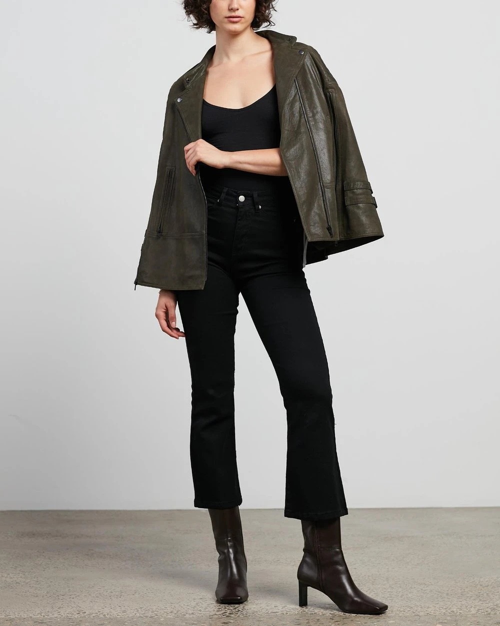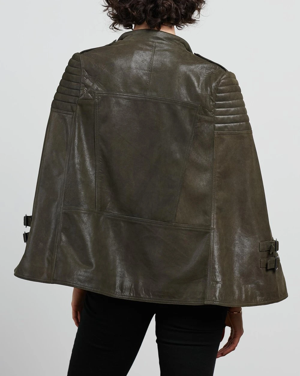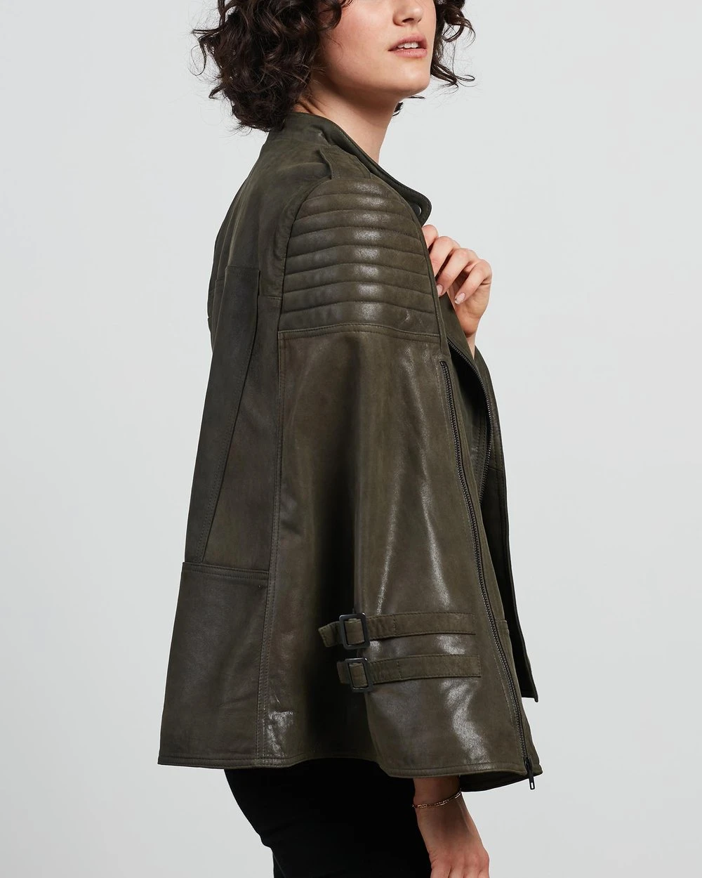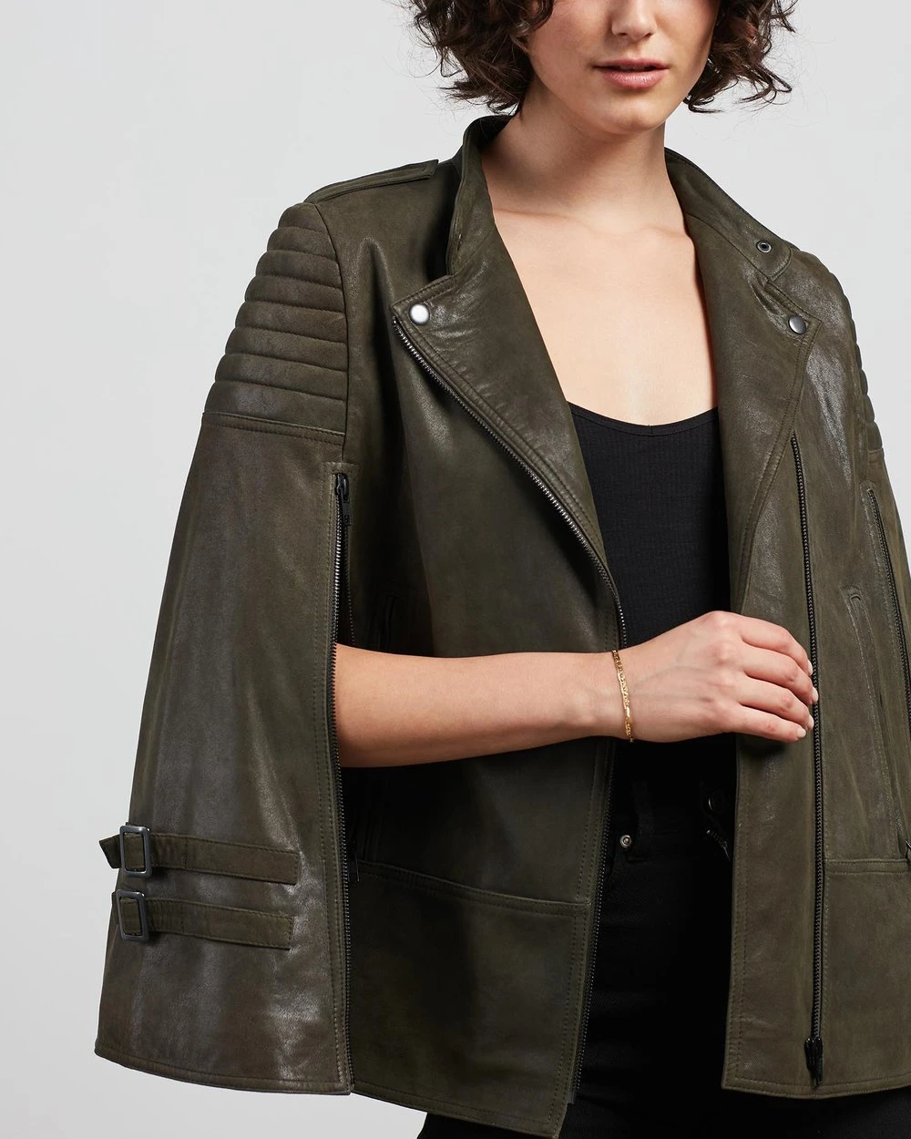 The West 14th Crosby Leather Cape features a traditional biker silhouette with twist, featuring an armless zip cut out for sleeves.